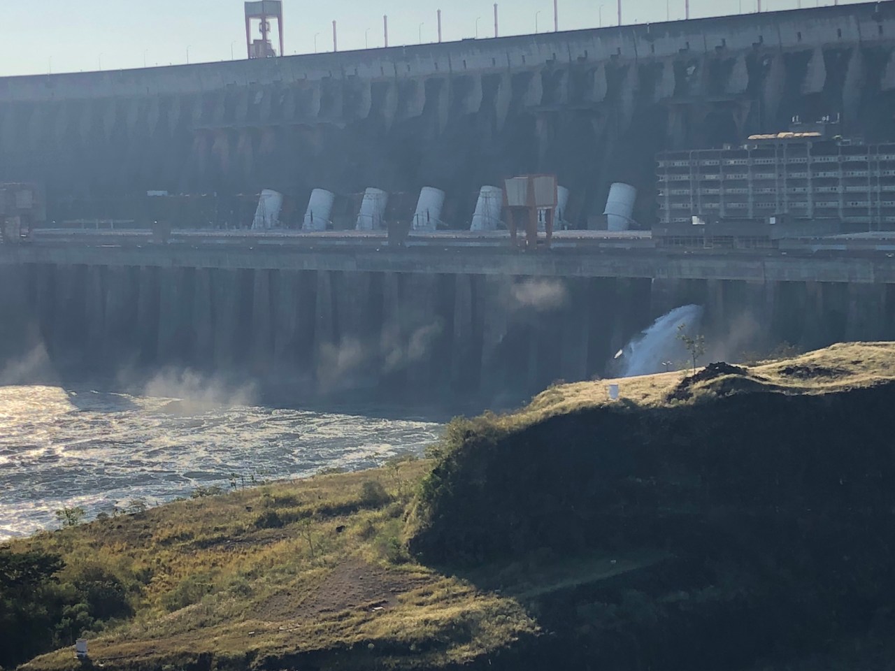 En 1975 les travaux commencent. Et le barrage est entré en service en mai 1984. Pour le construire, les ouvriers ont dû détourner de son lit le fleuve Paraná, deuxième plus puissant fleuve d’Amérique latine après l’Amazone. Le barrage est colossal. La digue créée s’étend sur 7,2 kilomètres pour former un lac de retenue de 1.350 km2. Son point culminant s’élève à 225 mètres au-dessus du sol et la hauteur de chute est de 118 mètres, allant de Foz de Iguaçu au Brésil à Ciudad del Este au Paraguay, jusqu’à Guaíra et Salto del Guairá 150 km au nord.