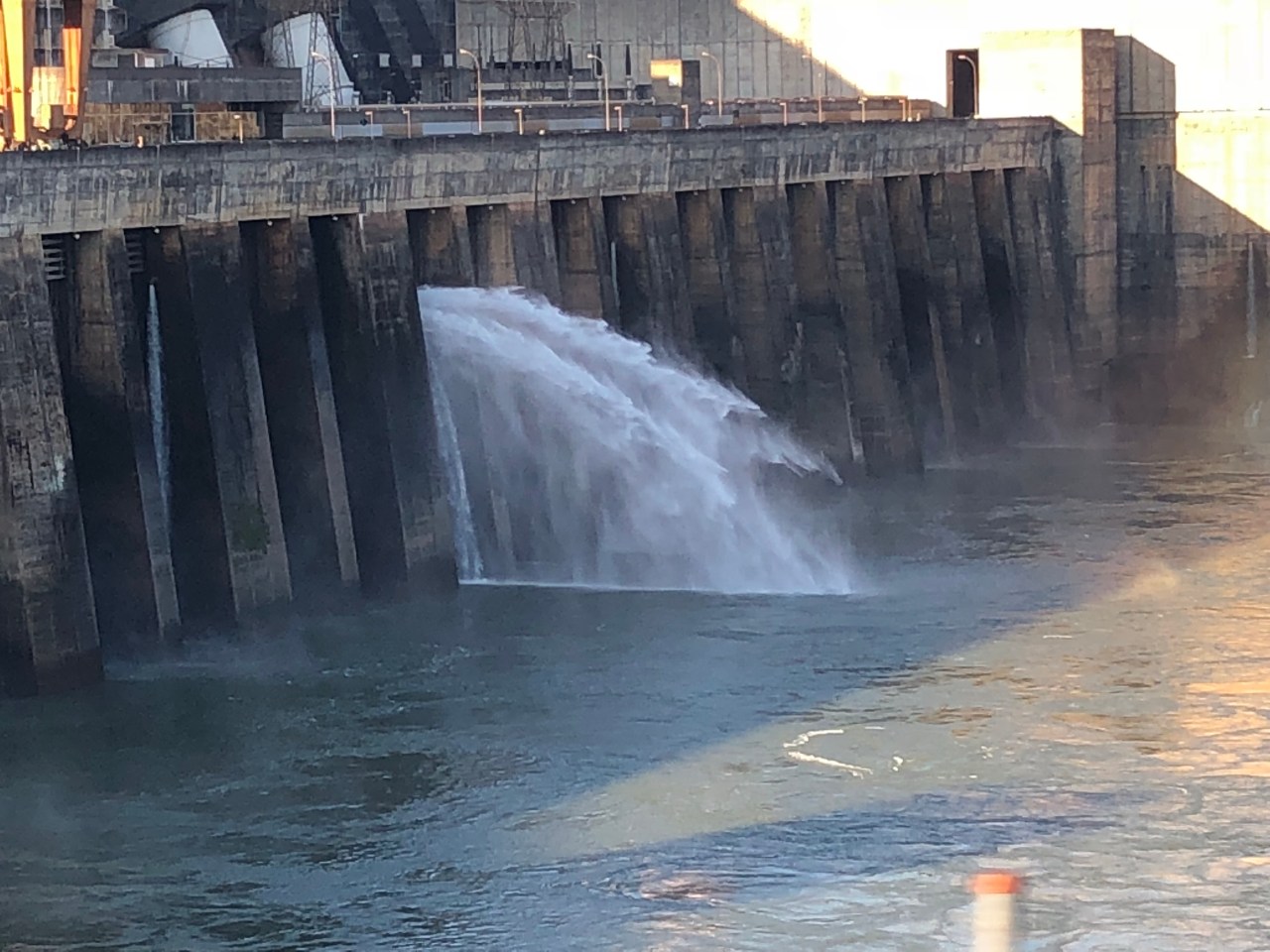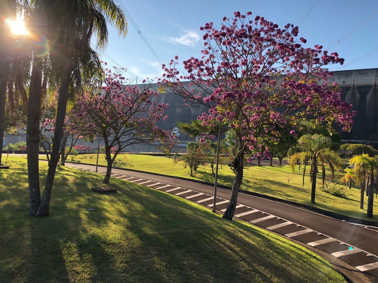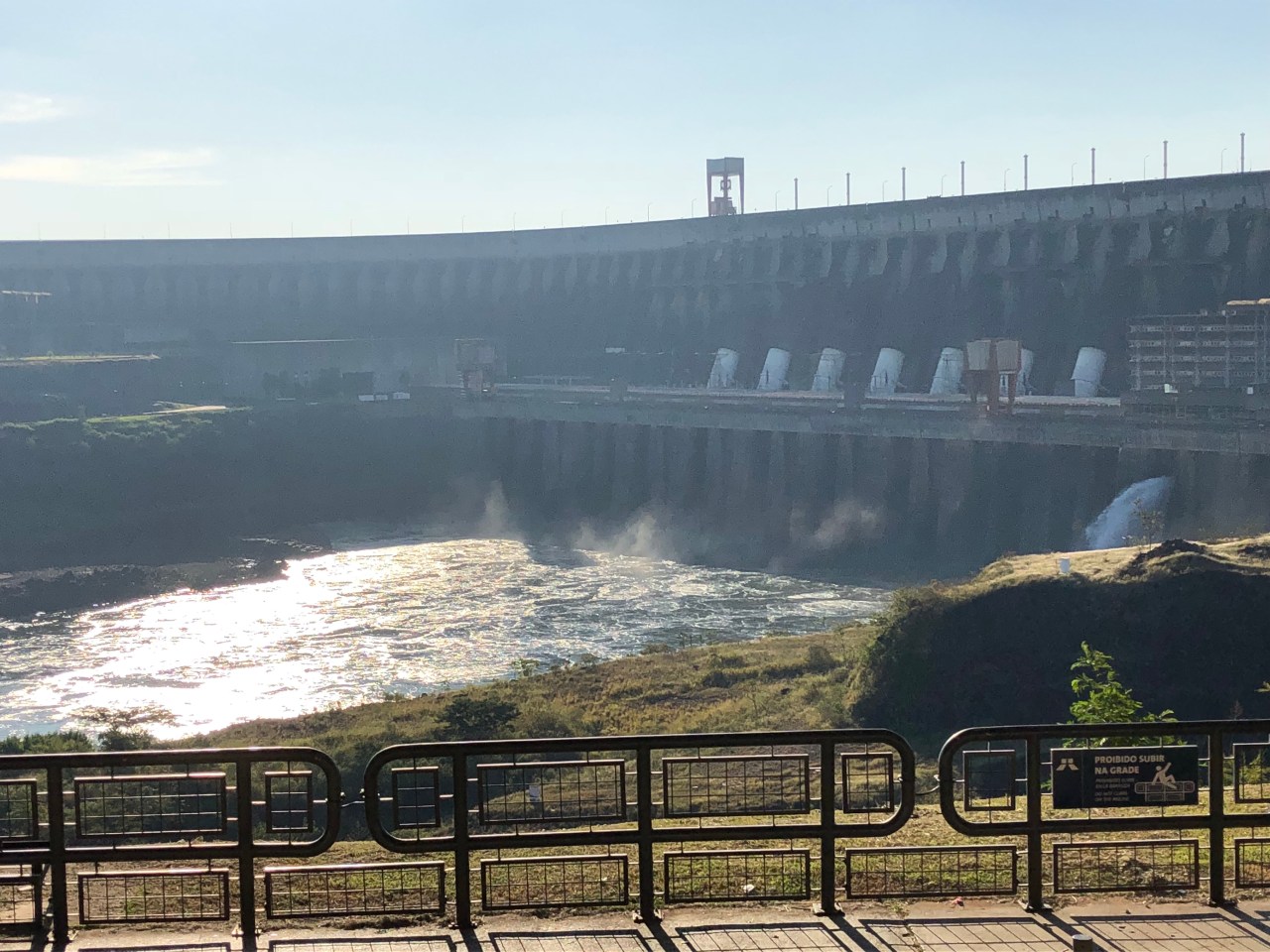 Depuis plusieurs années le site est visité par 1500 personnes par jour, touristes comme moi, qui ont envie de voir la splendeur de la construction. La visite est passionnante car elle commence par une vidéo que je vous ai jointe sur l’histoire du barrage ; puis on part en bus à deux étages sur le site binational pour voir et s’arrêter à certains endroits stratégiques du site. On a la possibilité de voir le barrage à deux endroits pour constater le côté gigantesque de la construction et du débit possible de cette usine ! De là on repart pour passer dans un tunnel sous le barrage et surtout pouvoir admirer les grosses turbines. Le parc est magnifique car des arbres comme des flamboyants, des ipas roses, des palmiers et des aires de repos verdoyants agrémentent ce site. On se croirait dans un paradis qui a dû être un enfer au moment de la construction.