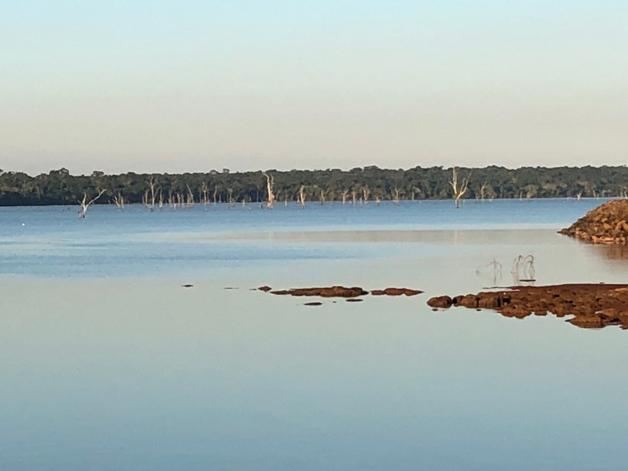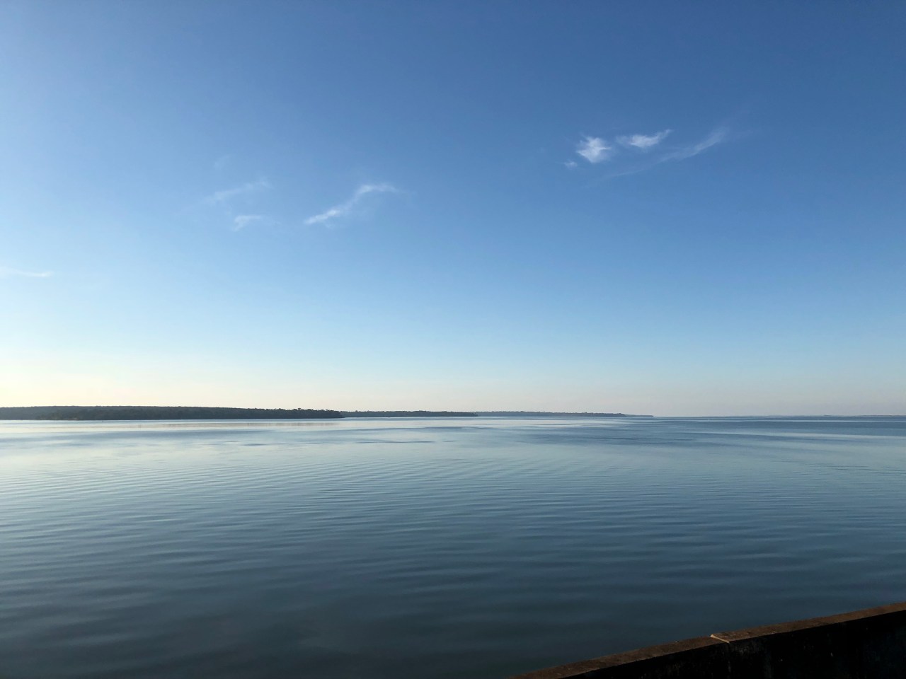 Puis on passe sur le barrage pour longer 200 mètres plus haut le lac de retenue et filer vers le port. Là on reste bouche bée par le spectacle qui s’offre à nos yeux… Une mer bleue ciel, sans remous, d’un calme olympien qui se confond avec le ciel. On se sait plus où est l’horizon et où s’arrête le lac. Mais a-t-on besoin de savoir où il s’arrête ? C’est tellement apaisant et reposant. Et comme il est bon de s’asseoir, de boire un verre de caïpirina tout en regardant le lac bleu, ses poissons aux queues rouges et les petits oiseaux à la gorge jaune venant picorer près du spectateur de la nature que nous sommes. Un vrai intermède après une journée de visite. Un moment entre deux où tout est tranquillité, sérénité et repos.