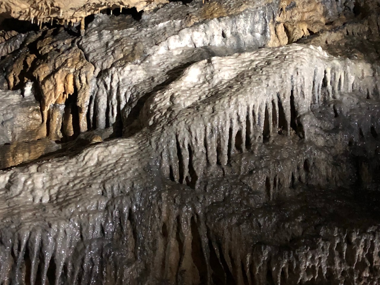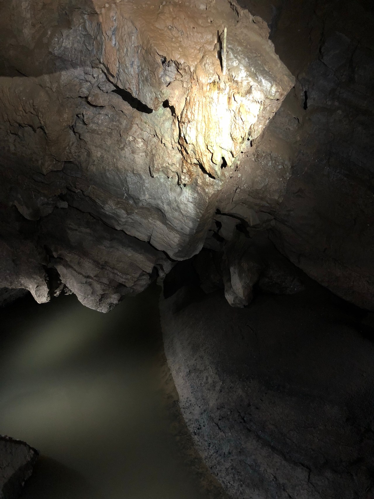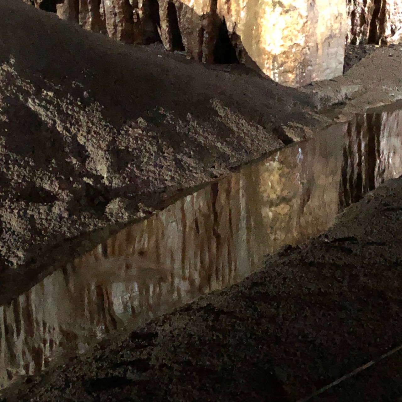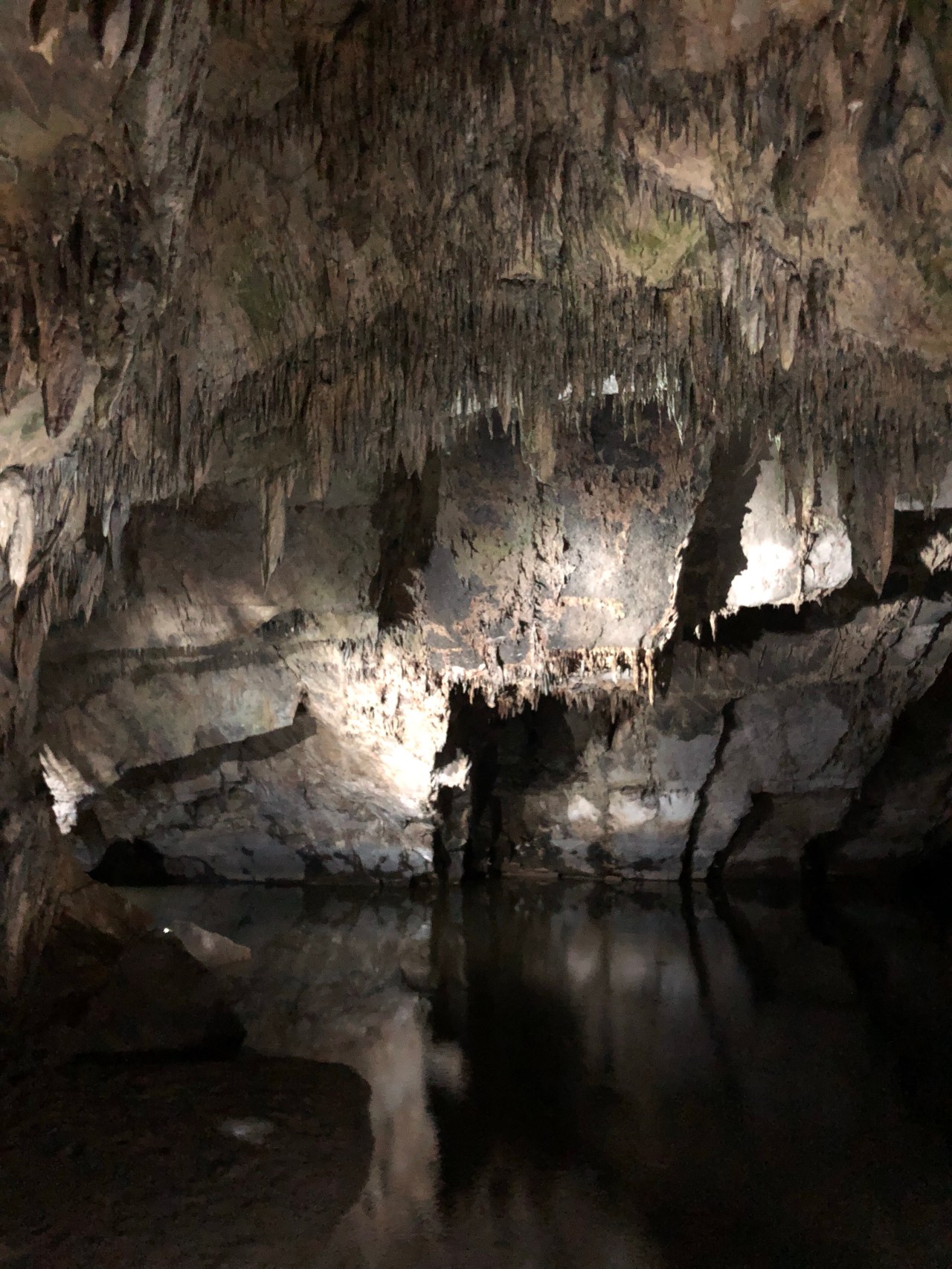 On finit par la salle des draperies. Dans cette salle vous pouvez admirer le superbe reflet des concrétions dans la rivière.