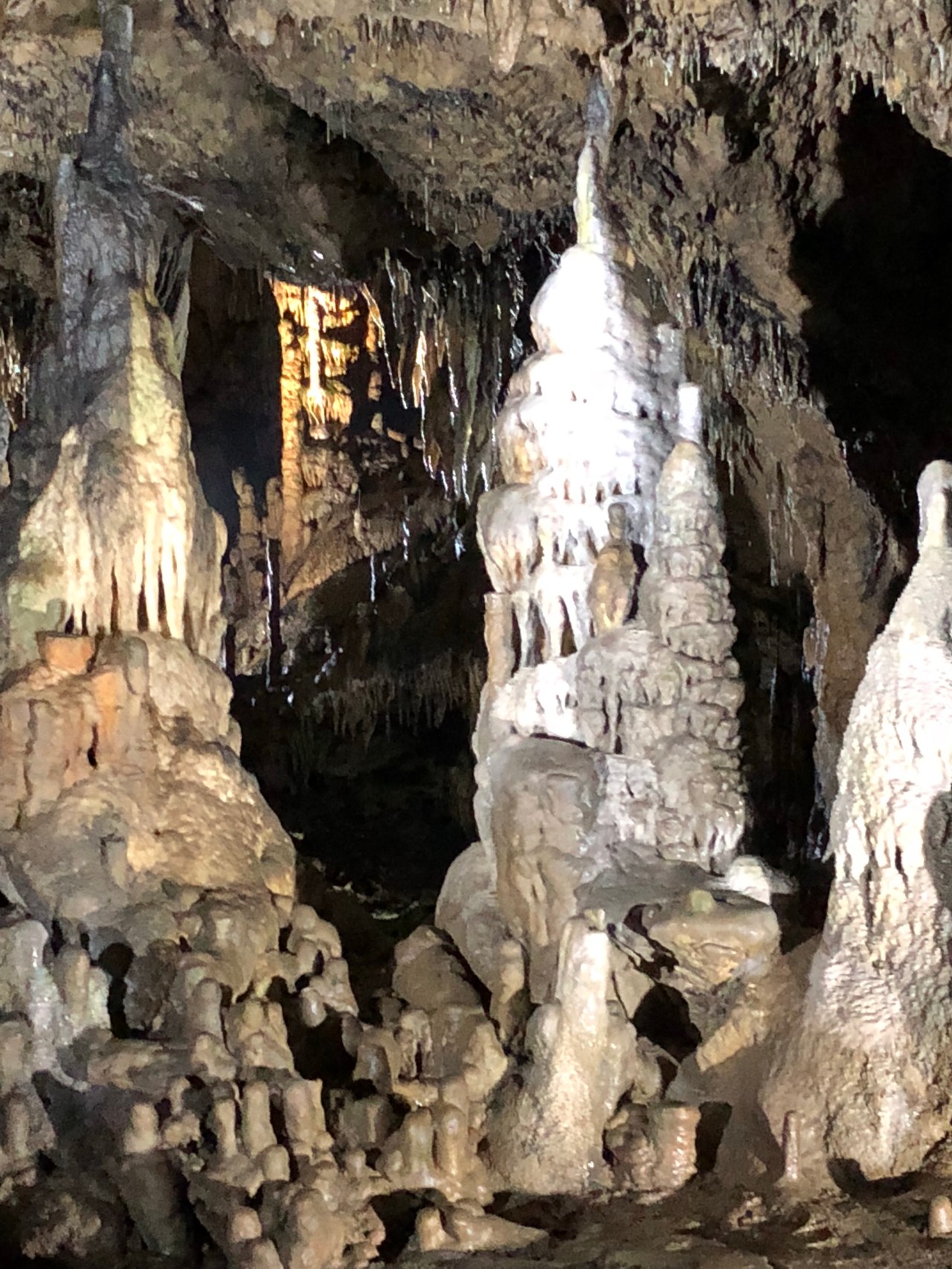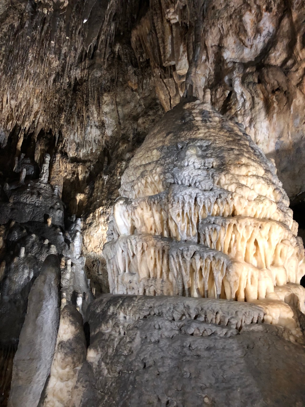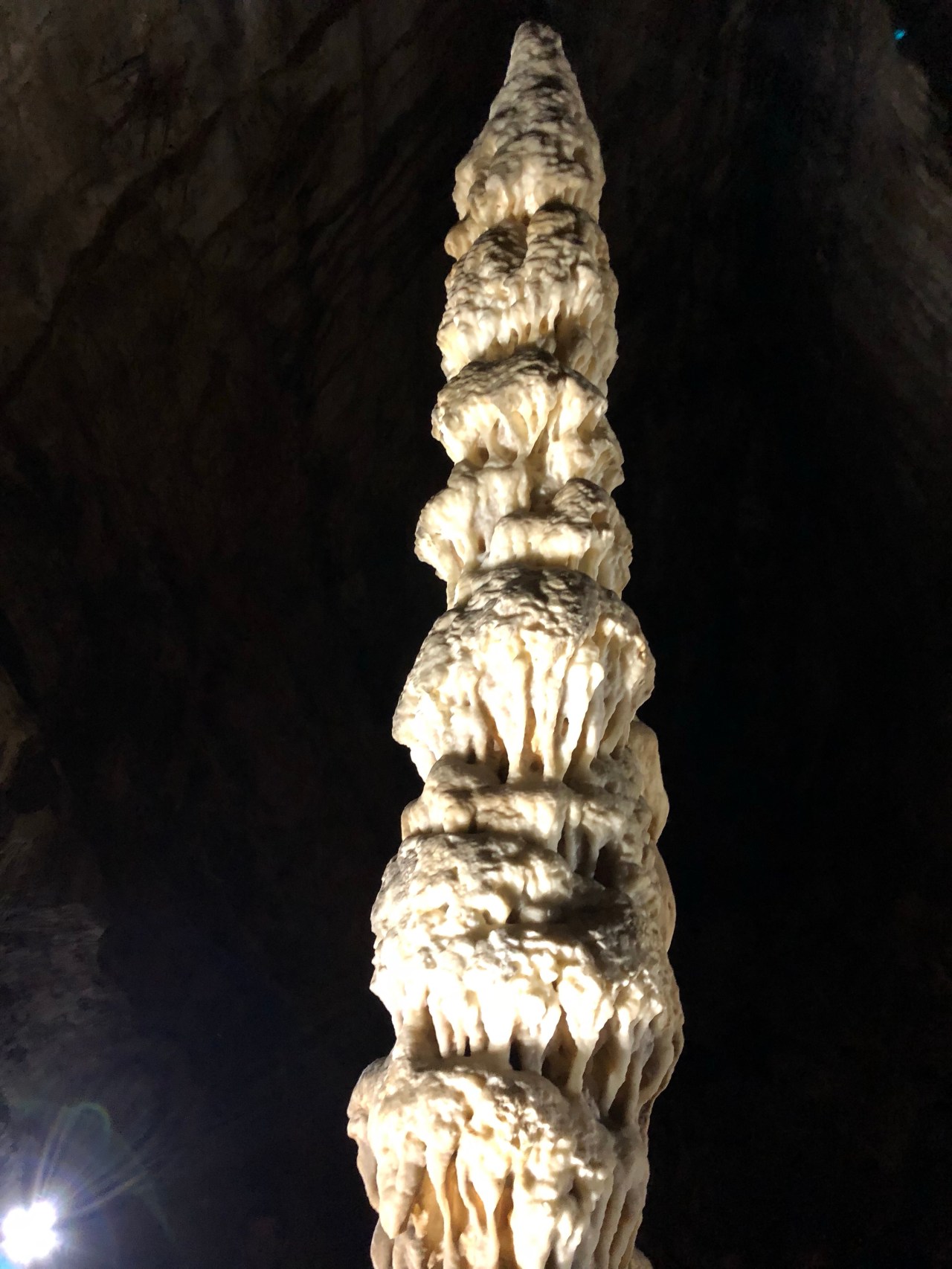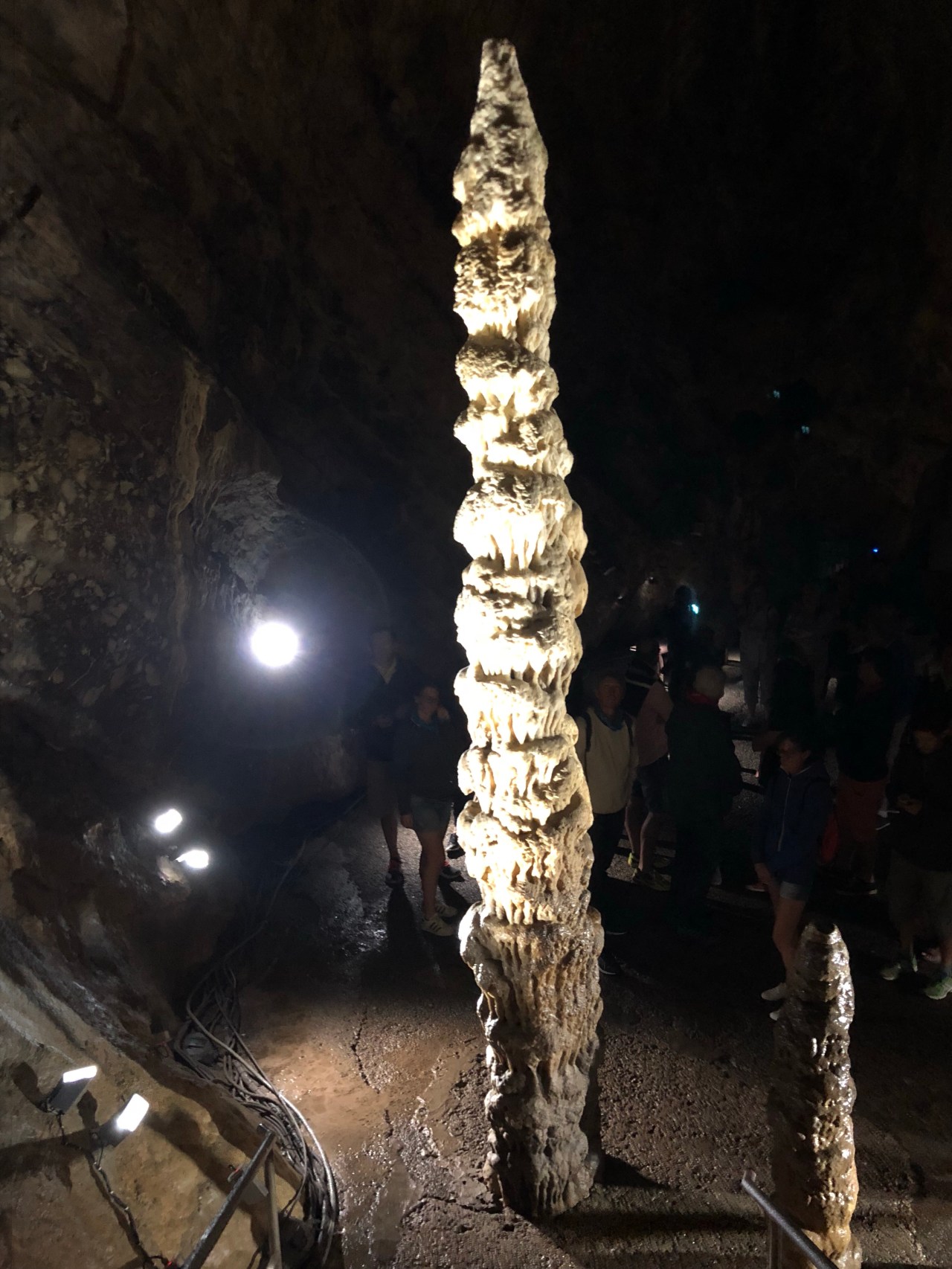 Et on entre dans la salle du minaret. On en reste éberlué ! Cette grande stalagmite de 5 m 80 de hauteur dénommée « Le Minaret » est âgée d’environ 12.000 ans. Elle est plantée au tout début de la salle et regarde le temps qui passe avec parcimonie. Elle regarde aussi tous ces hommes qui viennent la prendre en photo et pousser et Oh ou des Ah tellement ils sont enthousiastes et impressionnés ! On dirait un peu le site turc de Pamukale où l’eau qui coule a formé des chutes de sédiments blancs, comme du coton. Lieu vraiment insolite.