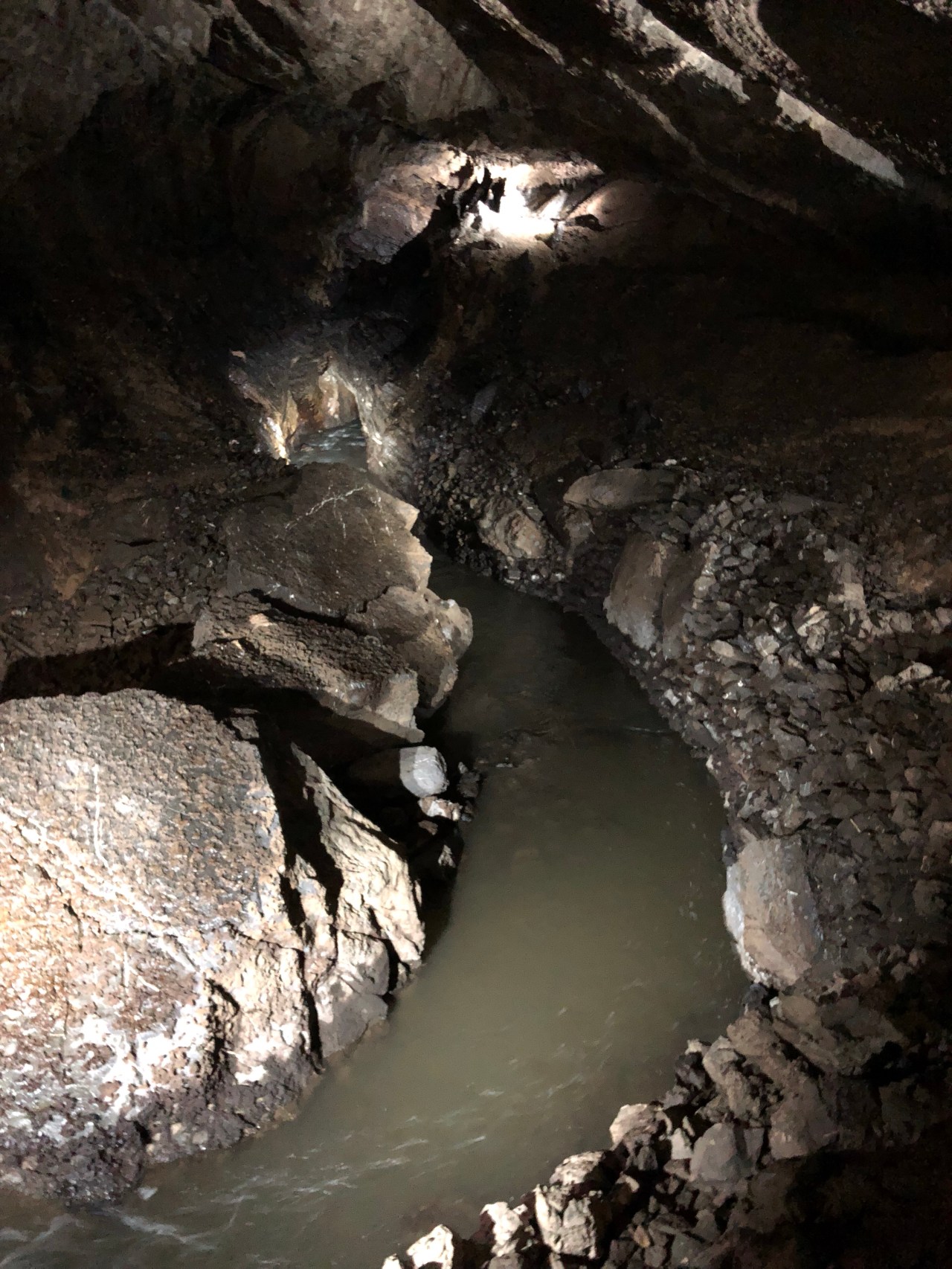 Puis nous continuons notre parcours pour atteindre le Styx où nous retrouvons la Lesse dans son parcours souterrain, qui s’appelle le Styx. A partir d’ici, la rivière joue à cache-cache avec le visiteur que nous sommes; elle disparait et réapparait au gré de ses envies… On va la traverser à plusieurs reprises. Les formes se reflètent dans le fleuve et surtout dans les rigoles qu’il a formé sur le sol.