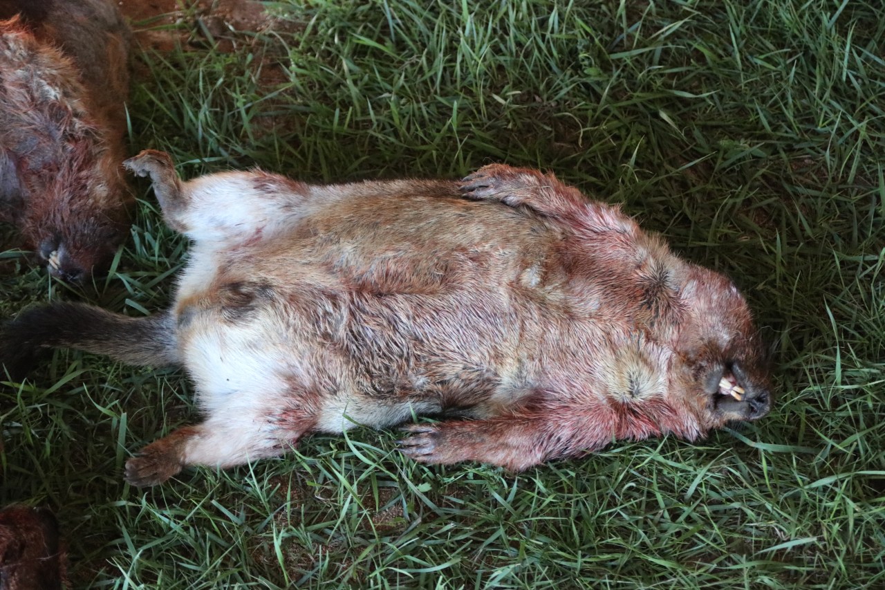 Trois jolies marmottes nous ont été étalées devant le nez, sur l’herbe, pour que nous puissions les admirer, les regarder, les soupeser, avec leur deux dents de devant !