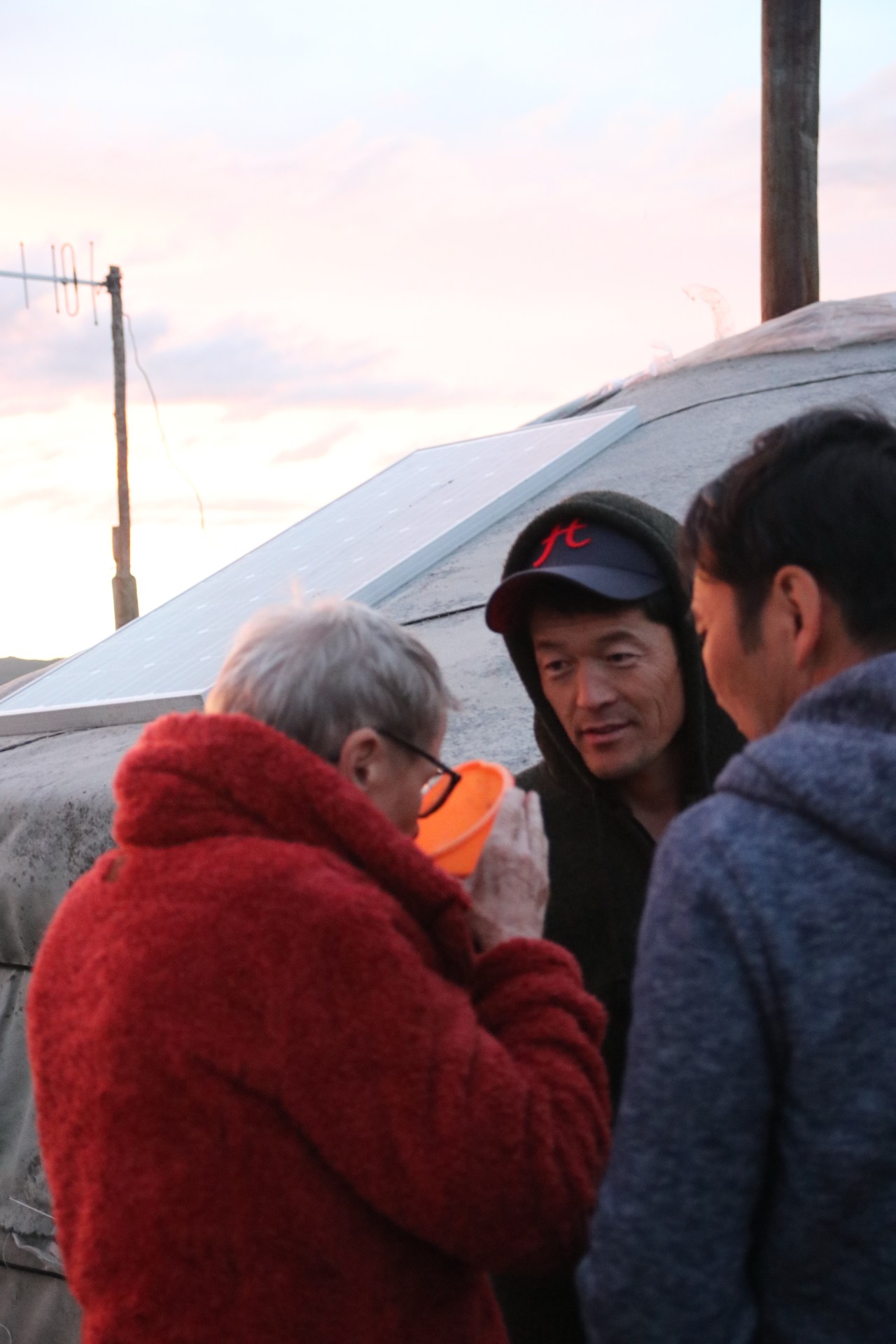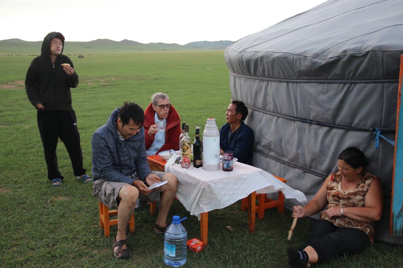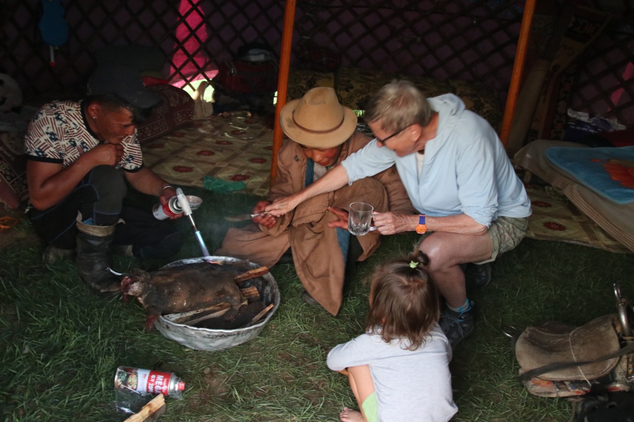 Là ce sont les humains que nous sommes envers les marmottes ! Enfants, parents, amis, voisins – tout ce petit monde se régale. C’est le partage et la convivialité qui font figure ce soir. La viande passe de mains en mains, pour enfin finir sous nos dents de carnassiers et d’affamés qui engloutissent l’animal. On se brûle les lèvres par gourmandise. Mais pour rien au monde on ne s’arrêterait ! Le tout est arrosé de vodka Chinggis pour les plus grands ! Du thé salé pour les plus jeunes ! On se croirait transporté dans le monde de Gengis Khan !
