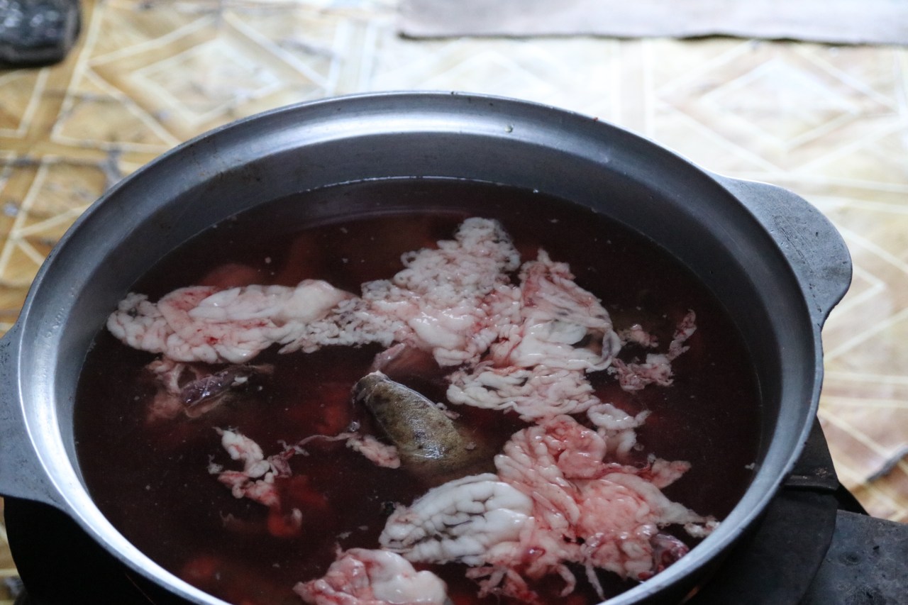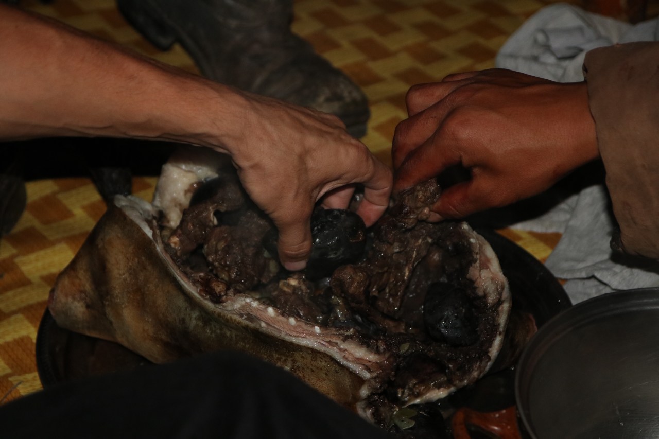 Mais avant il y a l’épisode la sauce provenant de la cuisson de la marmotte. Car cette dernière, après avoir été arrosée à multiples occasions, dégage un jus délicieux. Il sort par le trou du cul de la bestiole et est mis dans un réceptacle en plastique, qui servira à tout le monde pour le boire. Tout le monde va de la louche pour goûter ce délicieux jus. Je n’en ferais pas mon diner complet mais intéressant à tester !