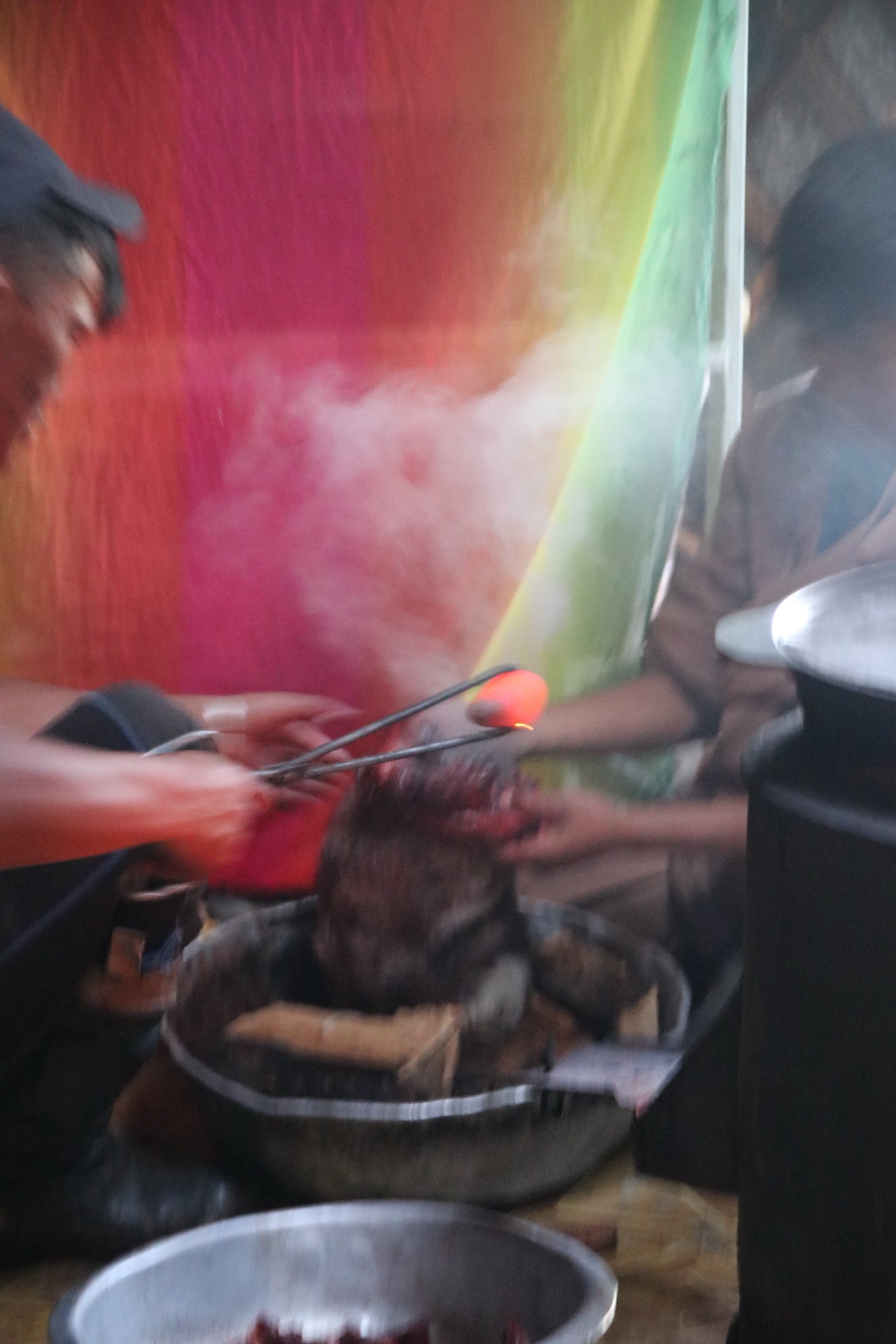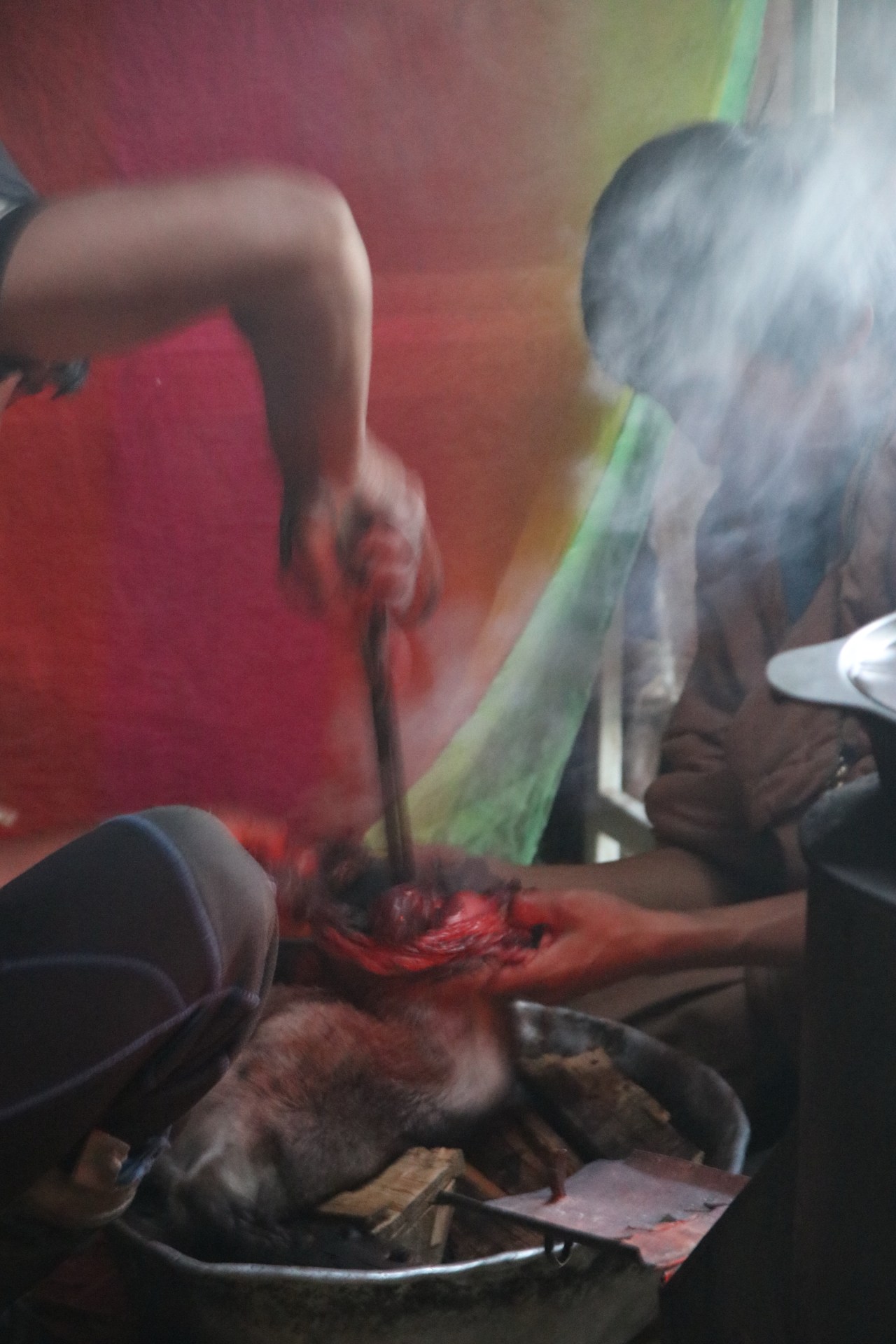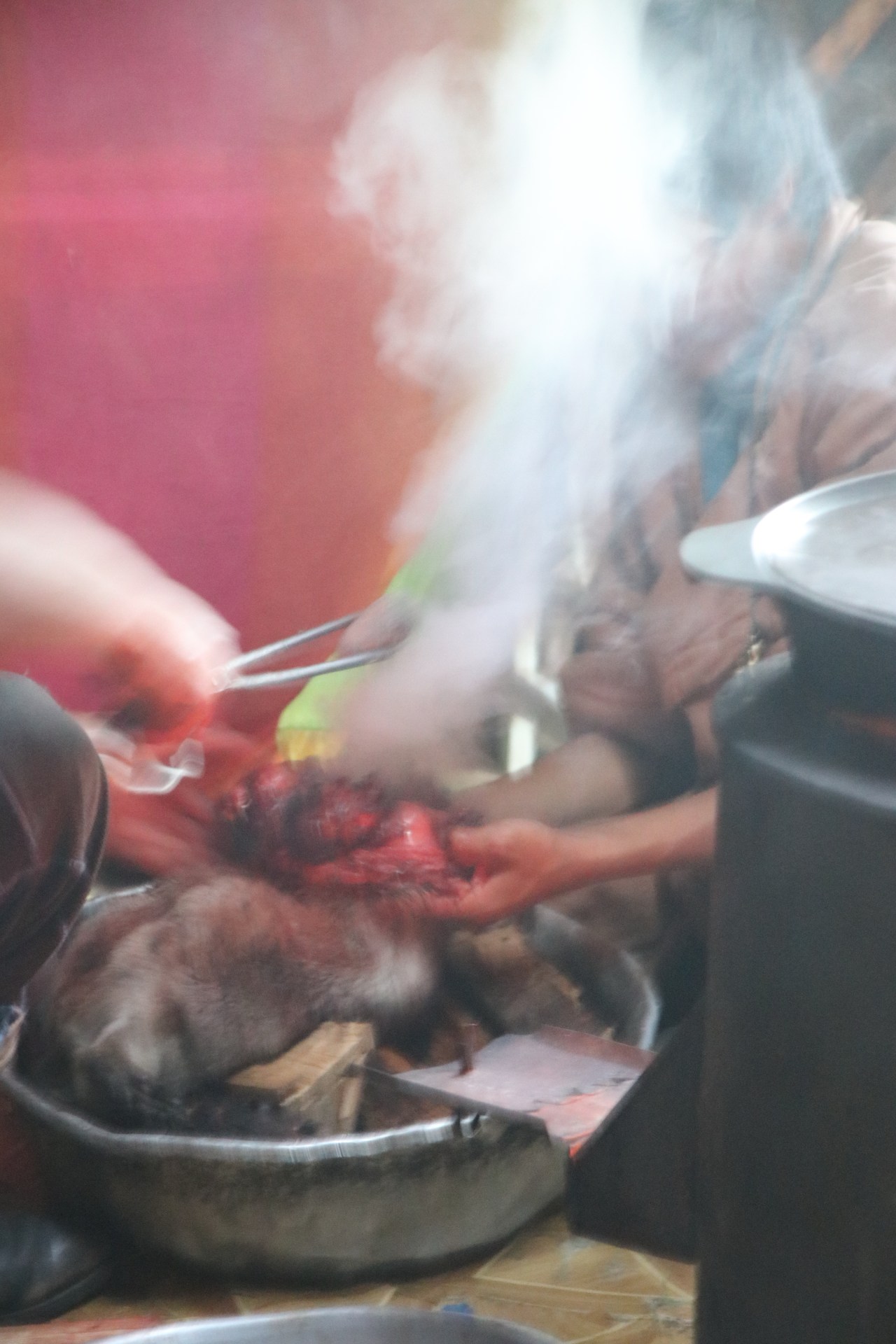 Je l’avais lu dans le polar de Yan Manook « Yeruldelgger » mais de là, à le voir réellement – une autre paire de manche ! Ça continue à fumer, à péter. La vapeur sort de la bête qui cuit doucement. Car les pierres chaudes et incandescentes rôtissent l’animal de l’intérieur.