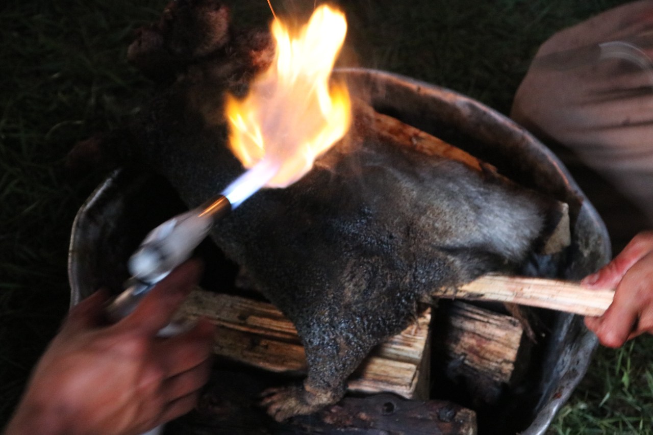 Puis les cuisiniers s’attaquent à la bête : on lui ouvre le ventre, on enlève les pierres en vérifiant que la viande est bien cuite. Et à l’attaque ! C’est parti ….. On découpe la peau et le gras de la viande ! On coupe des morceaux de viande, de la graisse, des côtes, des pattes…. Tout y passe. Et c’est la curée comme les chiens qui se jettent sur le pauvre cerf.