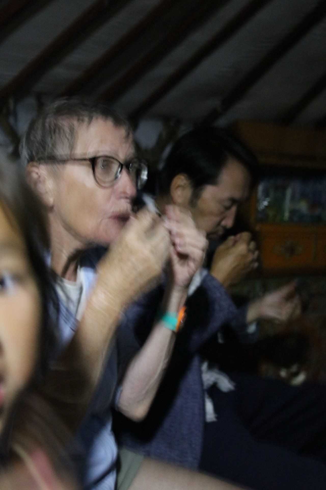 Puis on emporte la marmotte dans une autre yourte, pour brûler sa fourrure. Eh oui on mange la viande de la marmotte mais pas la fourrure ! On allume un feu avec des morceaux de bois et on passe la fourrure sur le feu. Un peu comme on fait avec un poulet rôti avec un chalumeau chez le boucher. D’ailleurs ça sent le poulet grillé ! Même odeur ! Et on y va aussi avec le chalumeau, c’est plus rapide ! Mais ça prend du temps quand même ! Entre temps on arrose d’eau la marmotte qui grille doucement de l’intérieur – comme pour le poulet. Cela donnera une délicieuse sauce que tout le monde va s’arracher ! Et ça occupe tout le monde – des plus vieux aux plus jeunes – on est tous autour de la marmotte qui ronfle de chaleur ! On regarde, épie, papote, échange des mots sur la cuisson. L’ambiance monte crescendo. Et il y a même des écrivains qui se tortillent d’envie devant le met – Cécile Huguenin en personne – qui par ailleurs déteste la viande rouge ! Mais là impossible de la retenir – presque les babines retroussées comme un loup affamé mû par le désir de goûter la marmotte. Elle ne tient plus en place, elle s’agite dans tous les sens comme cabri que l’on ne retient plus. Elle a participé à la préparation la petite dame, toute excitée et aguichée par l’idée de partager une expérience inédite et de croquer un met tant recherché en Mongolie ! Tellement inédit chez nous les Gaulois !