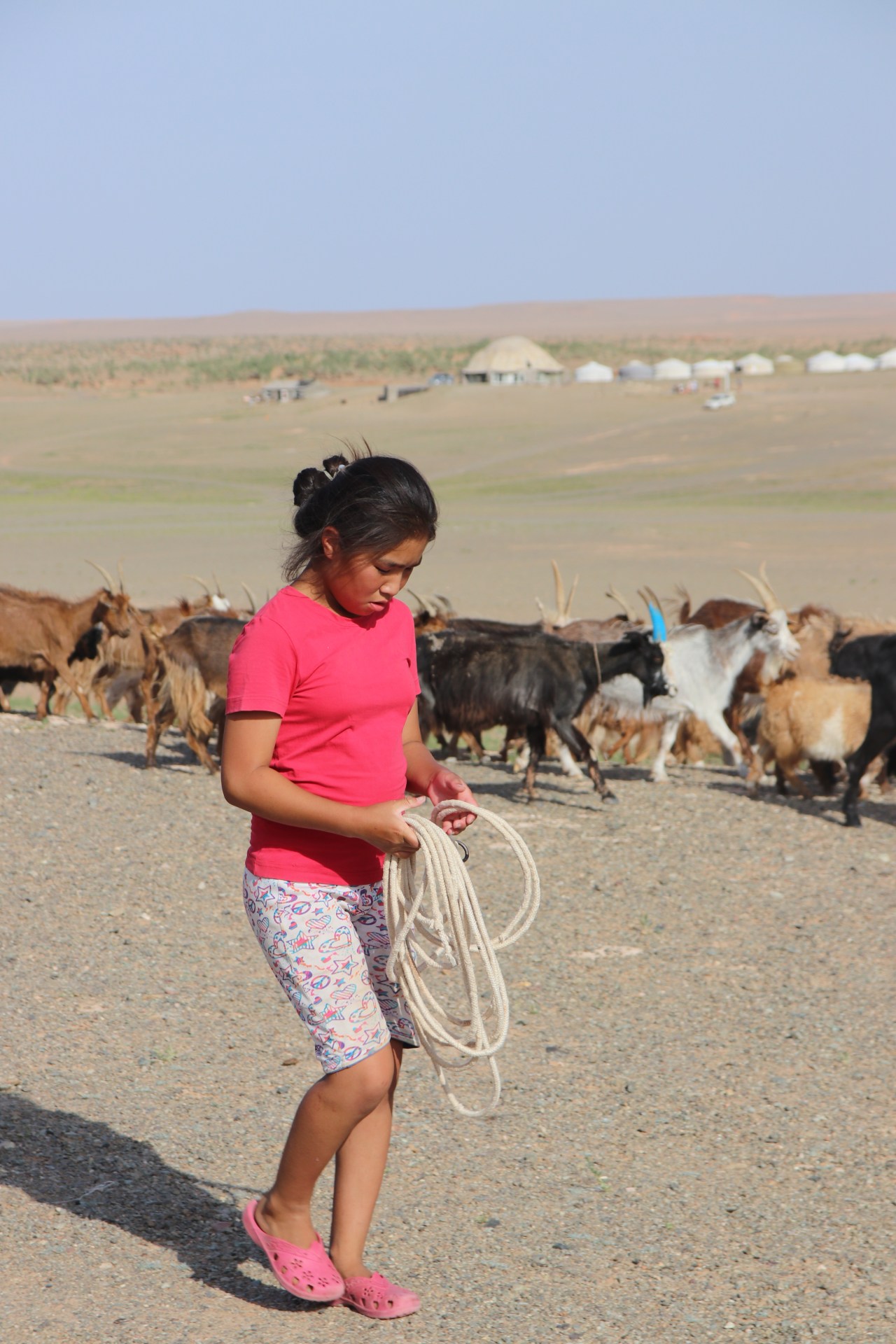 Puis il faut laver les enfants, les habiller et après c’est la sortie et le lâcher des chameaux, des moutons, chèvres et yaks dans la nature pour conquérir de nouveaux pâturages plein d’edelweiss ! Ils ont bien le droit à une peu d’attention eux aussi !