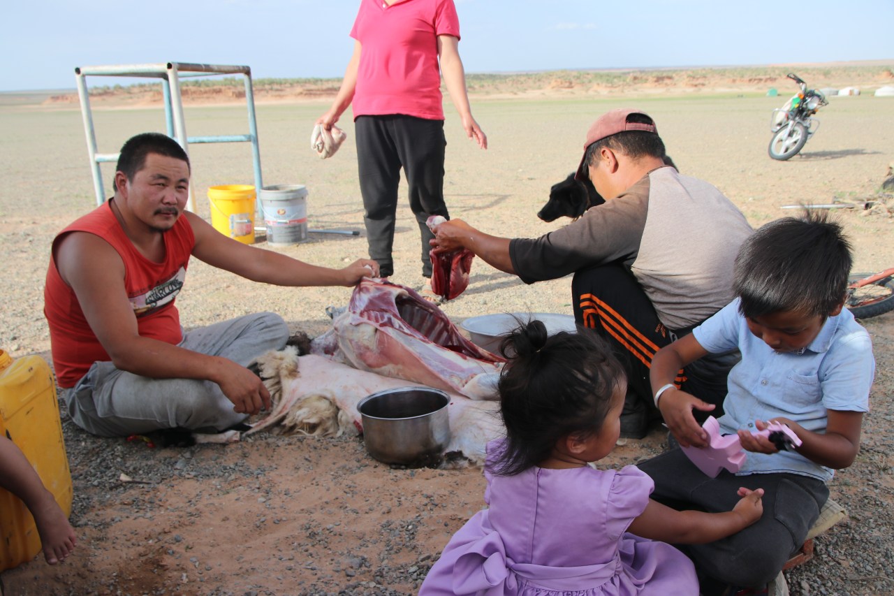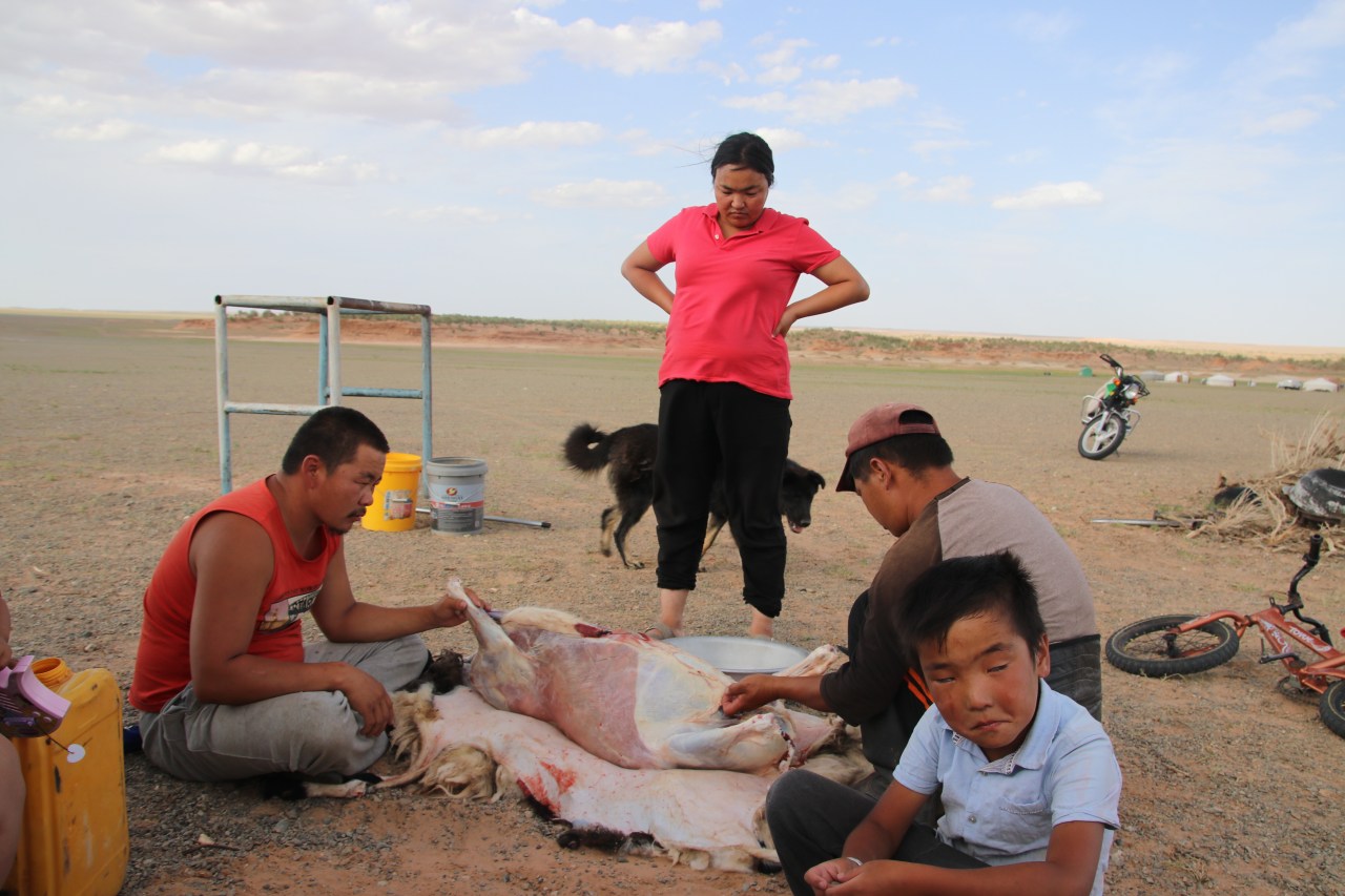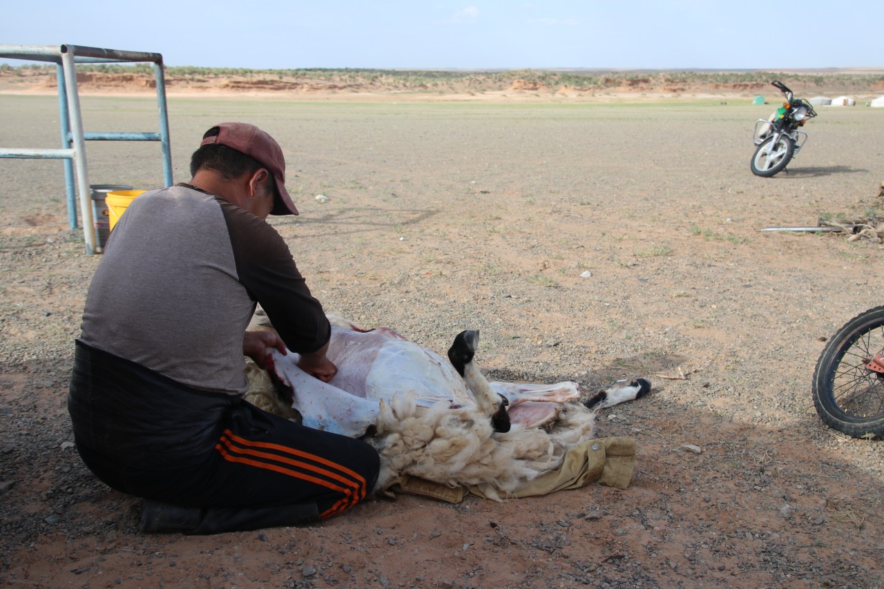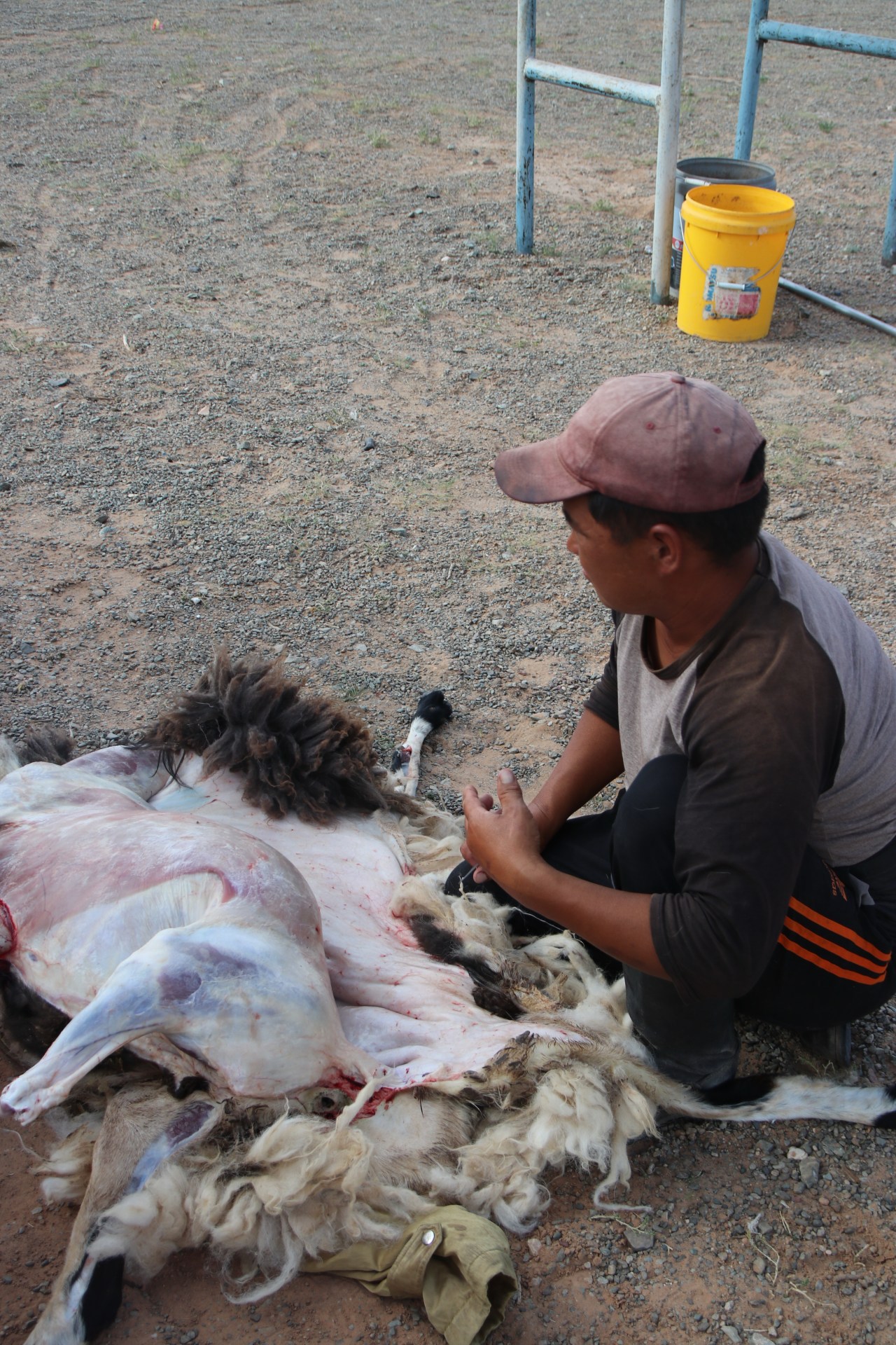 Puis a commencé de manière systématique la coupe de la laine et son ramassage dans des sacs destinés à la revente aux kilos. L’homme s’est ensuite attaqué à enlever la peau de fourrure du corps de l’animal. Le tout en papotant avec sa famille et des nomades rentrant de l’Altaï. C’est un travail prenant car il ne faut pas faire de trous dans la peau. Cette dernière est revendue à la pièce auprès de marchands qui passent les récupérer. Les enfants s’amusent tout autour sous les yeux écarquillés de touristes qui ont du mal à comprendre !