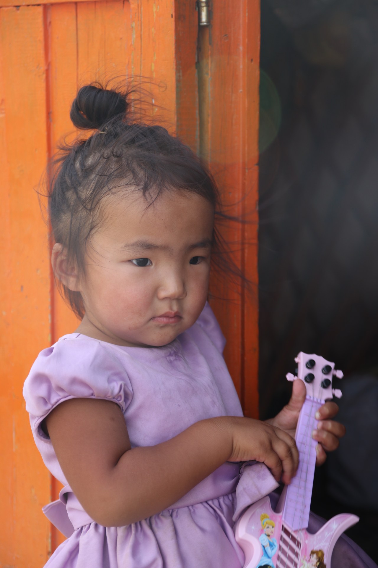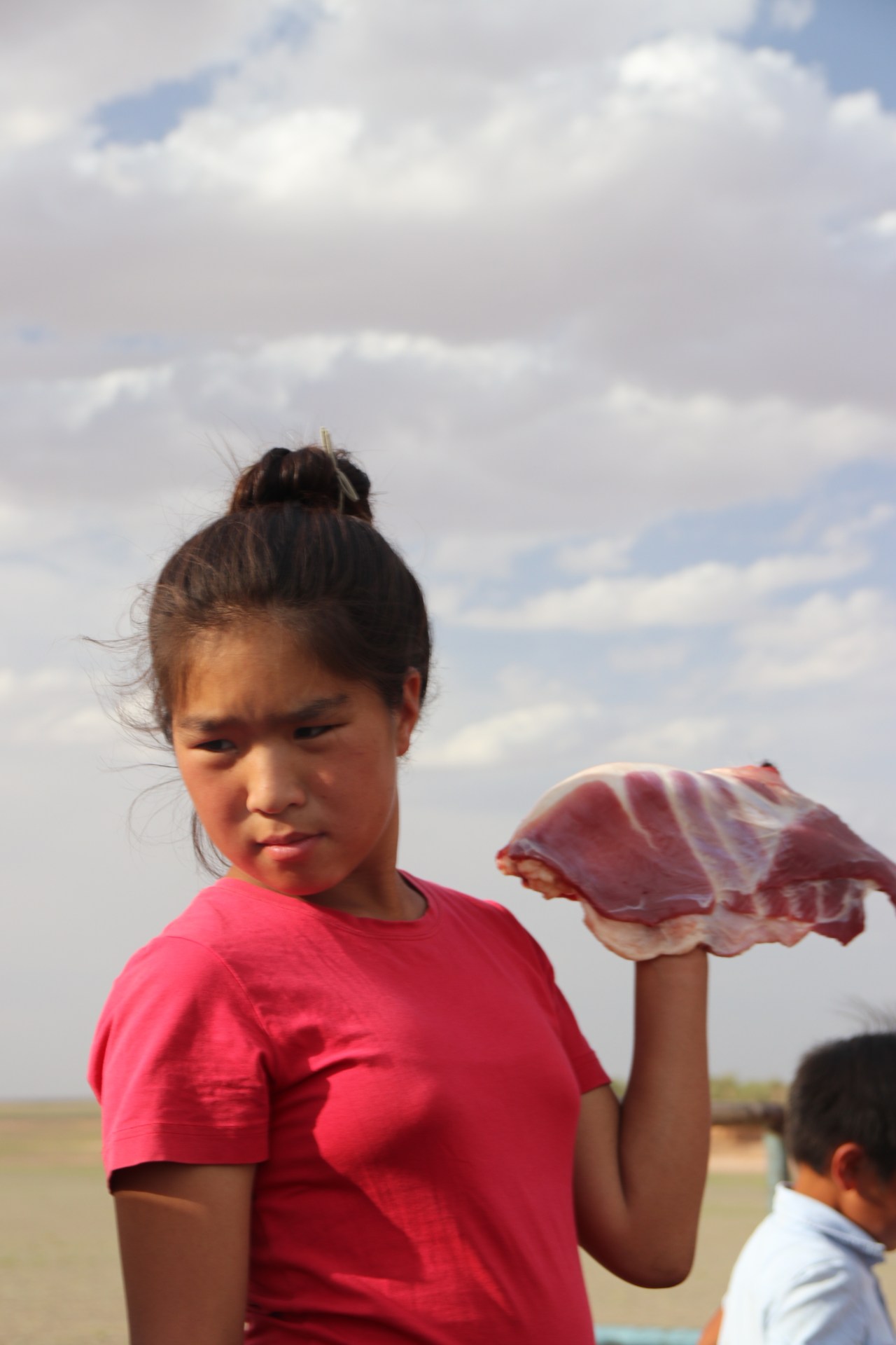 Mais le plus drôle et truculent dans cette affaire c’est le babillage des amis venus papoter et raconter leur voyage dans l’Altaï, buvant leur thé au lait offert par la maitresse de maison. Tous assis à même le sol autour du mouton que l’on équarrit ! Et surtout les petites filles, jolies comme des cœur, ou bien faisant la gueule, endimanchées de robes, en tissus, sorte de taffetas de couleurs criardes, avec des collants de laine blanche, marchaient dans le sable, tournaient autour du mouton, buvaient du thé, jouaient de la fausse guitare ou faisaient du vélo. Et surtout elles se jetaient dans les bras de leur maman.