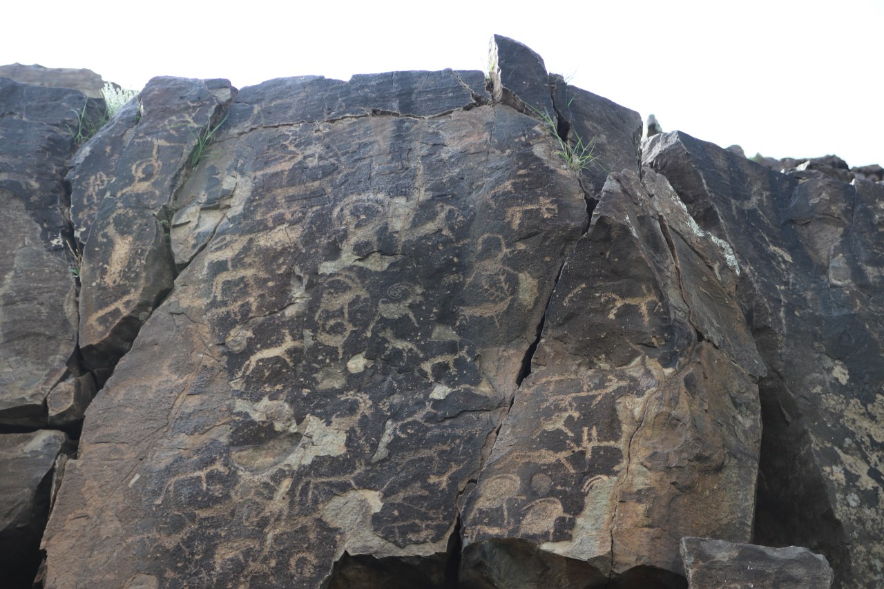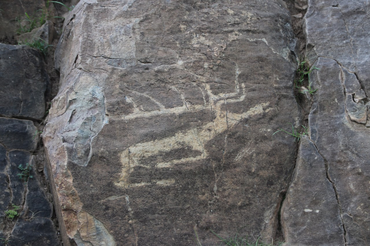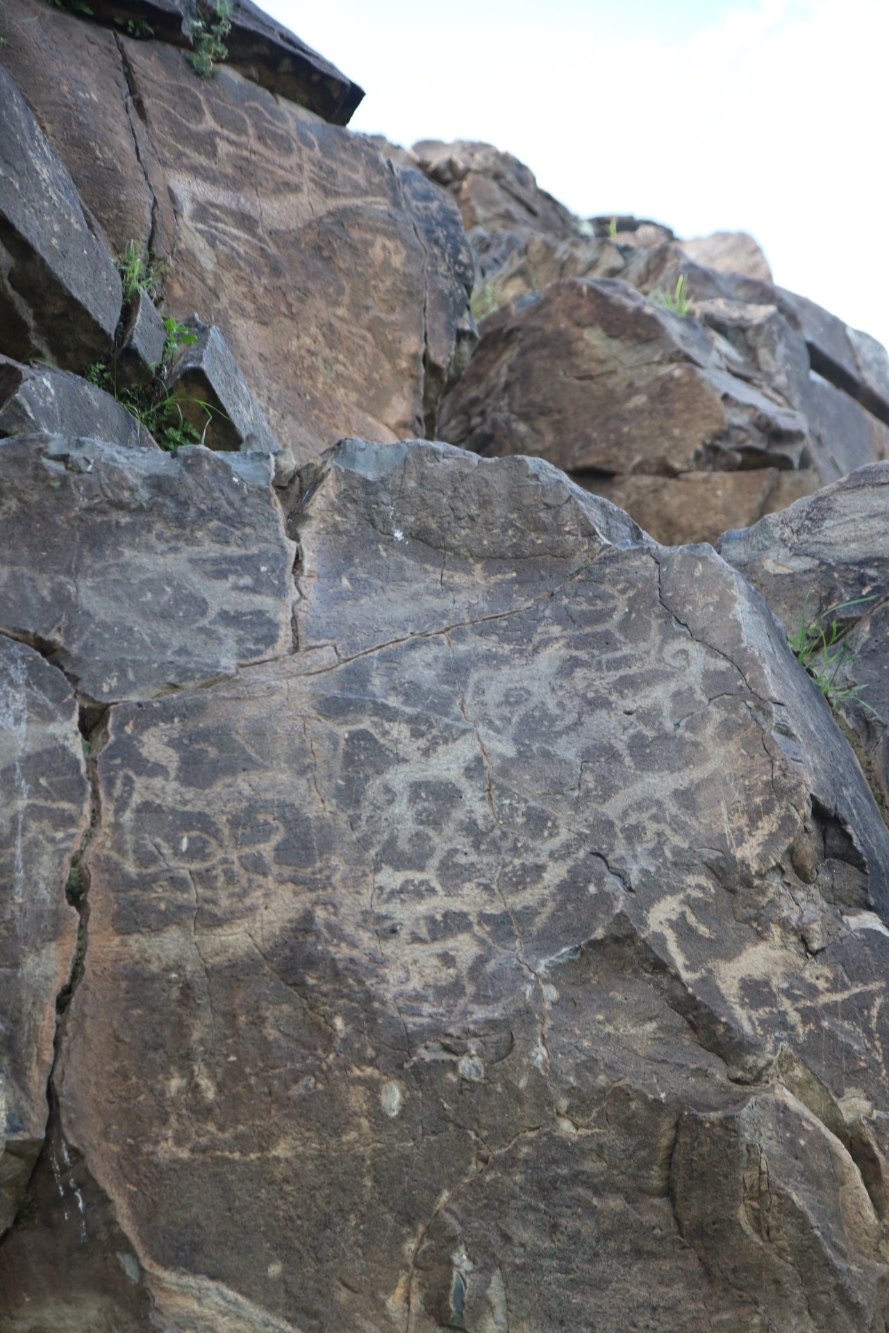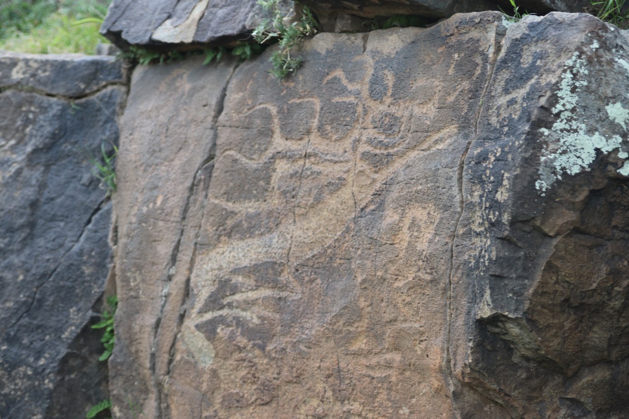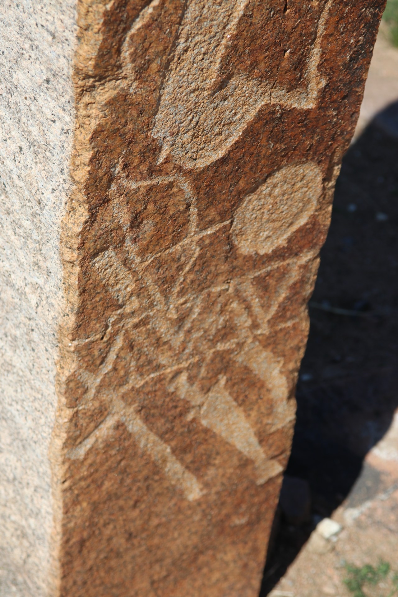 Le lendemain nous avons découvert un autre site devant une colline de pierre. Une dizaine de pierres couchées ou debout. Avec à nouveau des cerfs stylisés. Une pierre était magnifique comme un doigt levé vers le ciel au milieu de nulle part. Avec toujours les mêmes représentations.