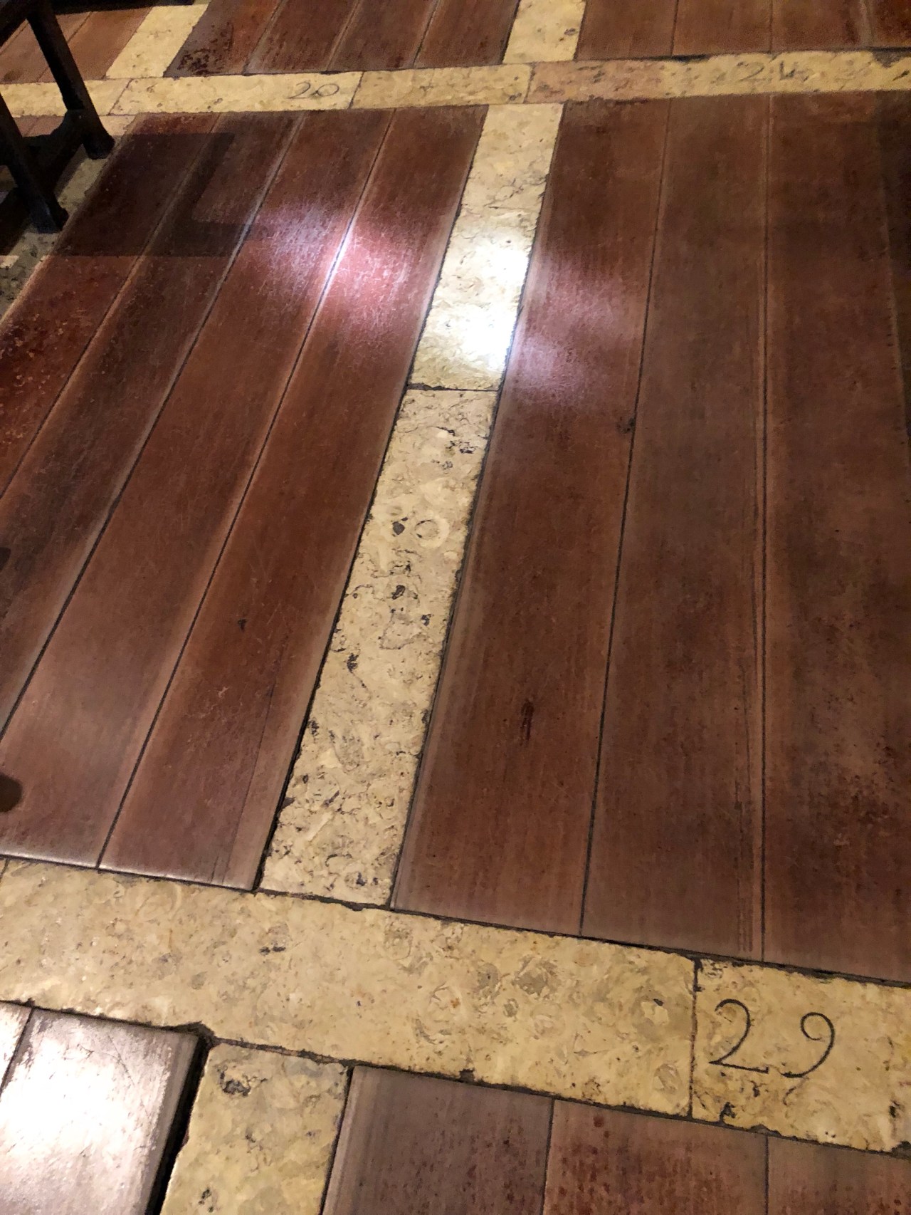 Le plancher est aussi une merveille de simplicité sur un bois rare. Lequel je ne sais pas mais il m’a particulièrement plu. Et le plafond est d’une rare beauté !