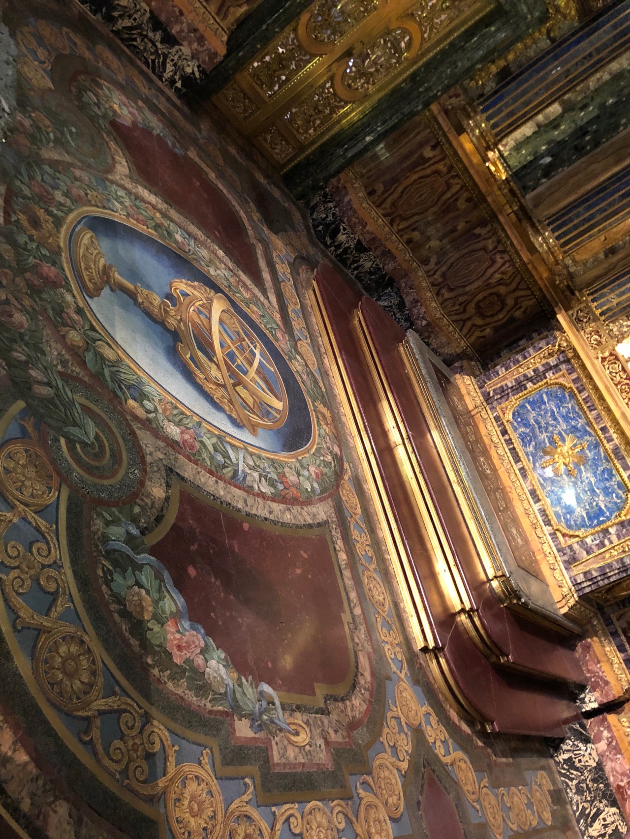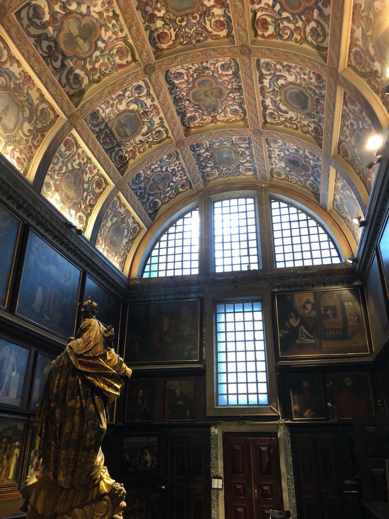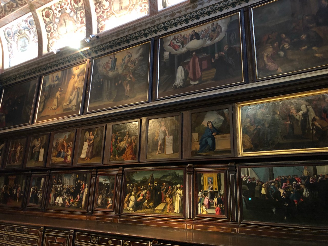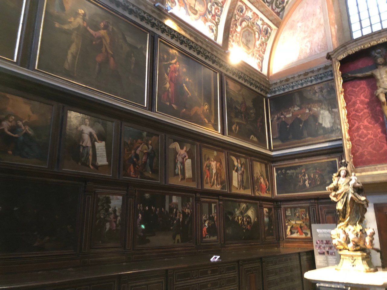 Et rien ne vaut le détour vers la sacristie. Là vous avez pour vous seuls des tableaux d’une richesse incroyable. Les tableaux sont superposés sur trois niveaux. Ils sont de trois peintres différents André Goncalves, Reinoso et de Domingos da Cunha. Cela vaut le détour pour la paix intérieure que l’on peut y trouver, la quiétude versus l’intérieur de l’église et surtout le plafond en forme de berceau renversé en palissandre, en bois de rose et en ébène, avec des incrustations d’ivoire qui remontent au début du XVIIe siècle.