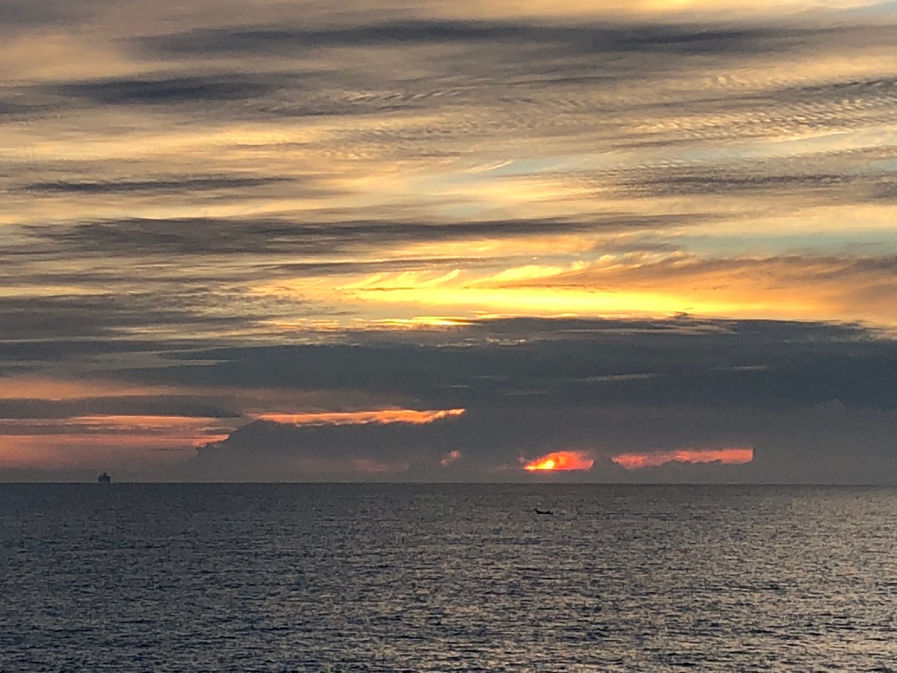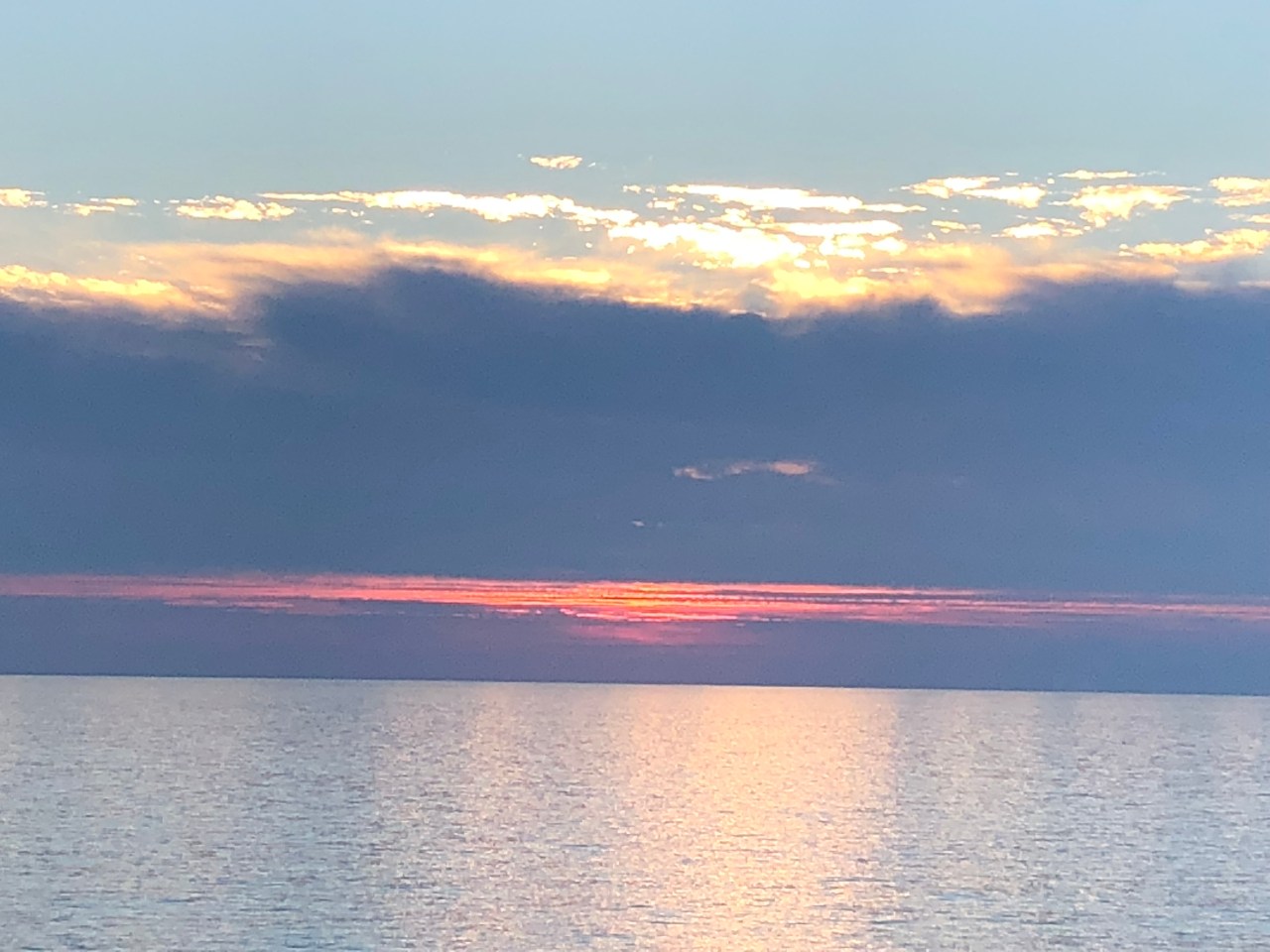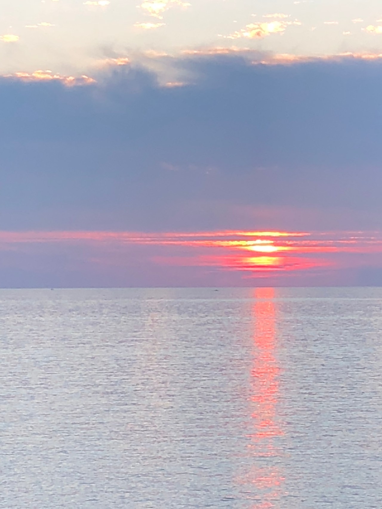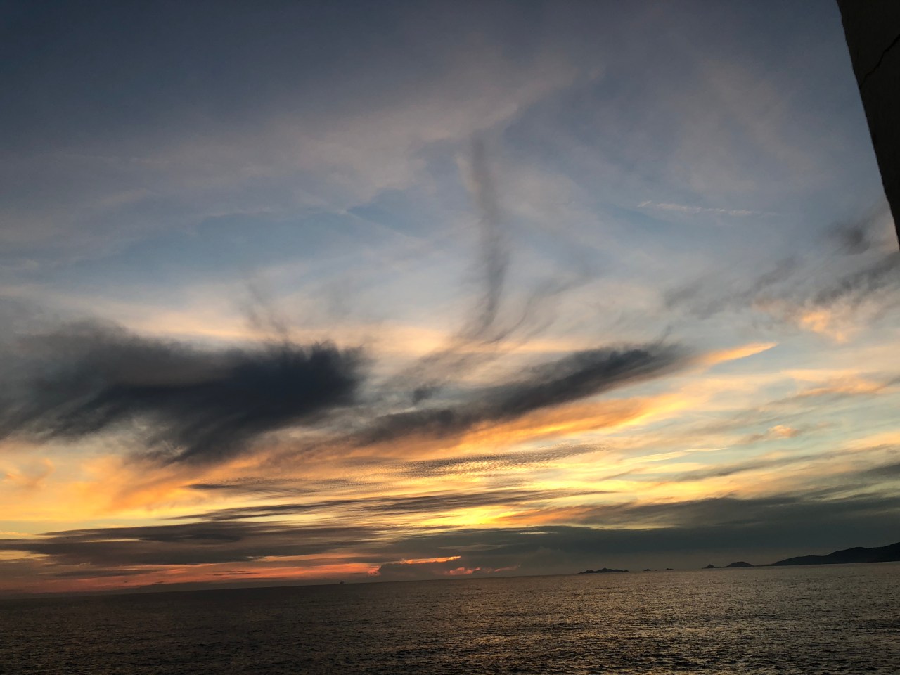 Une autre de mes contemplations sont les couchers de soleil et les jeux du soleil et des nuages. Ils ne me lassent pas car ils sont toujours différents, ne sont ni tout à fait les mêmes et se jouent de nous. Des couchers les plus rougeoyants et les plus flamboyants se partagent le ciel. Ce dernier devient soit strié de rouge, soit le soleil rond comme un ballon rouge rosé explose sur le miroir de la mer , soit il s’étale de tout son long sur la mer, soit de façon verticale s’enfonce vers la proue du bateau et darde la mer d’une fusée jaune, rose ou orange. On ne sait plus alors où est le ciel, où est la mer, où est la terre. Tout se rejoint, tout s’interpose, se mélange pour ne plus faire qu’un et devenir par là même divin.