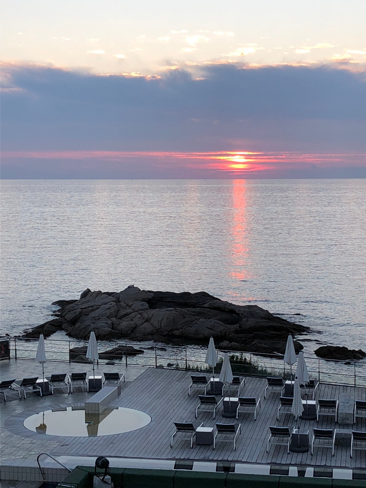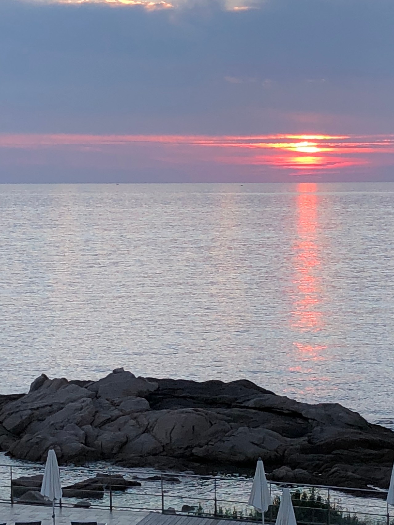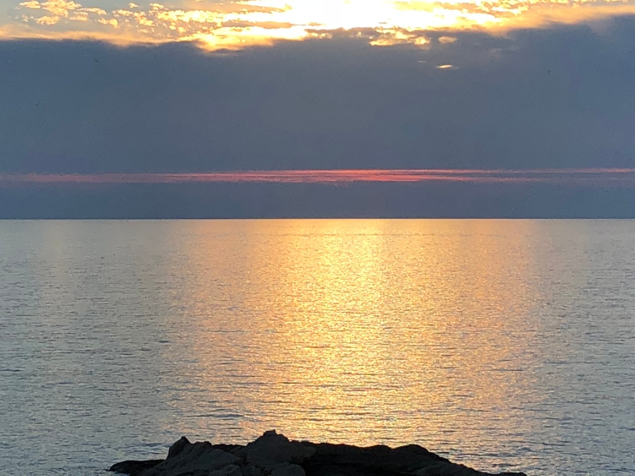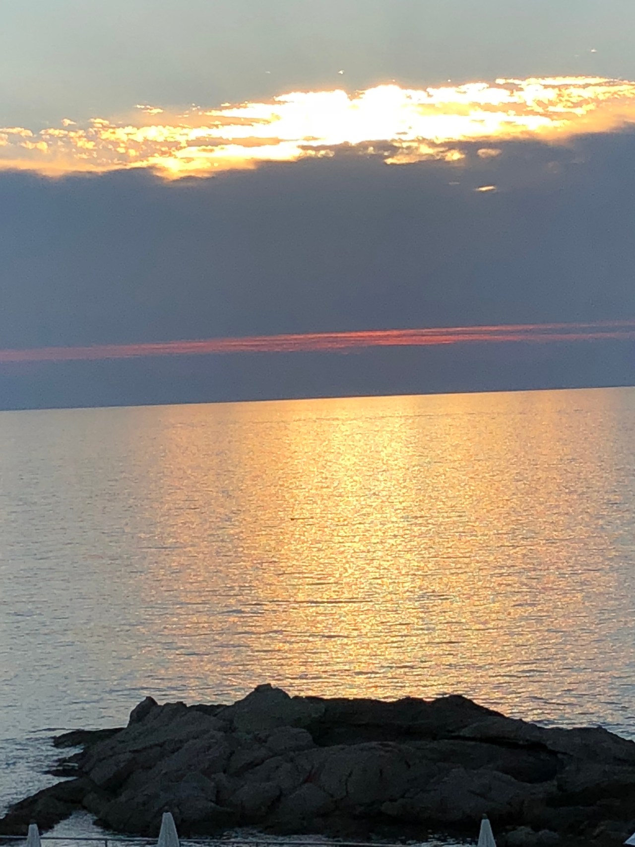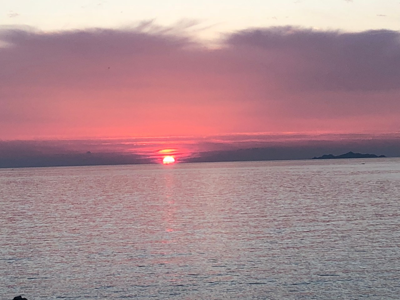 Une autre de mes contemplations sont les couchers de soleil et les jeux du soleil et des nuages. Ils ne me lassent pas car ils sont toujours différents, ne sont ni tout à fait les mêmes et se jouent de nous. Des couchers les plus rougeoyants et les plus flamboyants se partagent le ciel. Ce dernier devient soit strié de rouge, soit le soleil rond comme un ballon rouge rosé explose sur le miroir de la mer , soit il s’étale de tout son long sur la mer, soit de façon verticale s’enfonce vers la proue du bateau et darde la mer d’une fusée jaune, rose ou orange. On ne sait plus alors où est le ciel, où est la mer, où est la terre. Tout se rejoint, tout s’interpose, se mélange pour ne plus faire qu’un et devenir par là même divin.