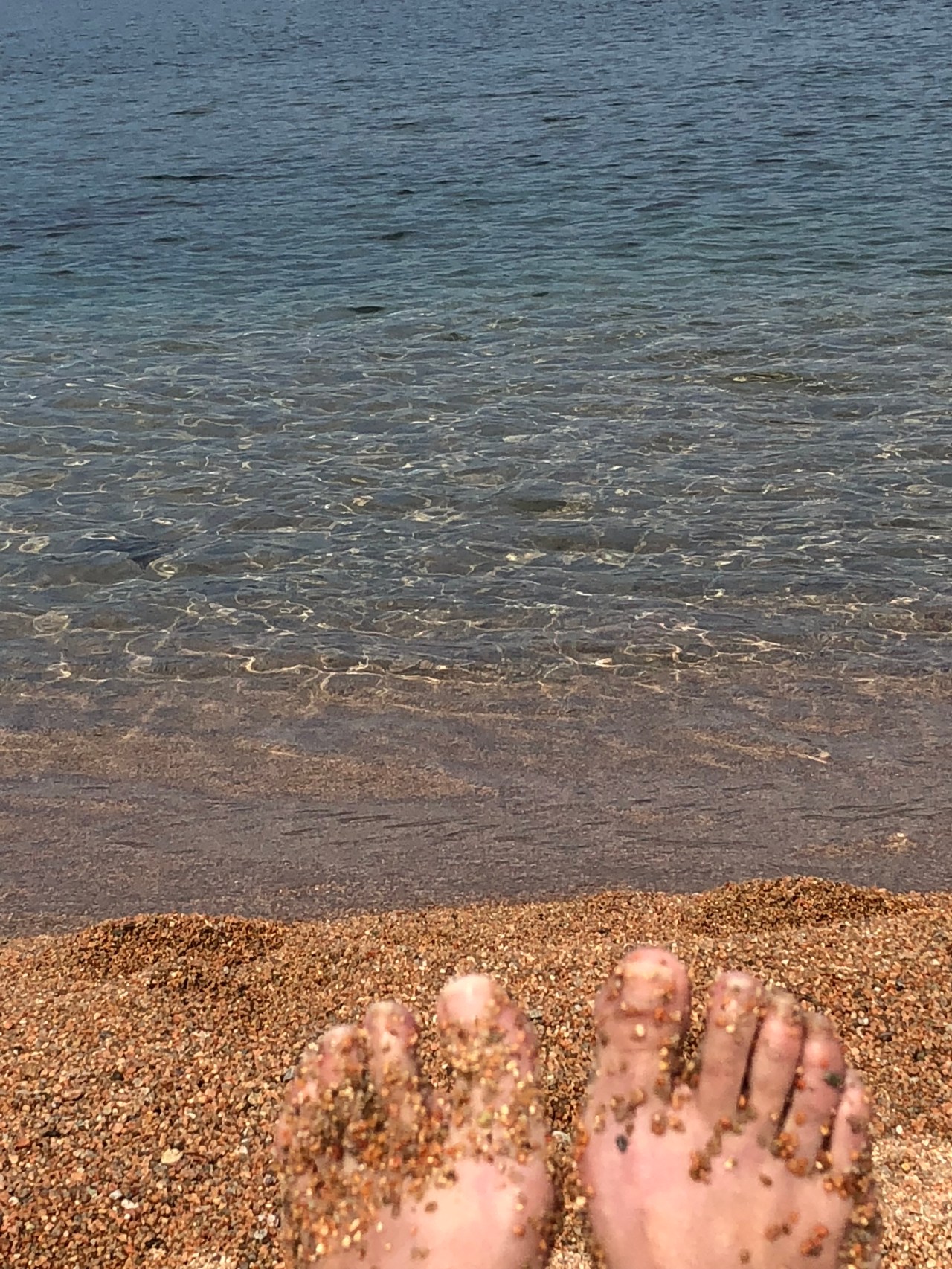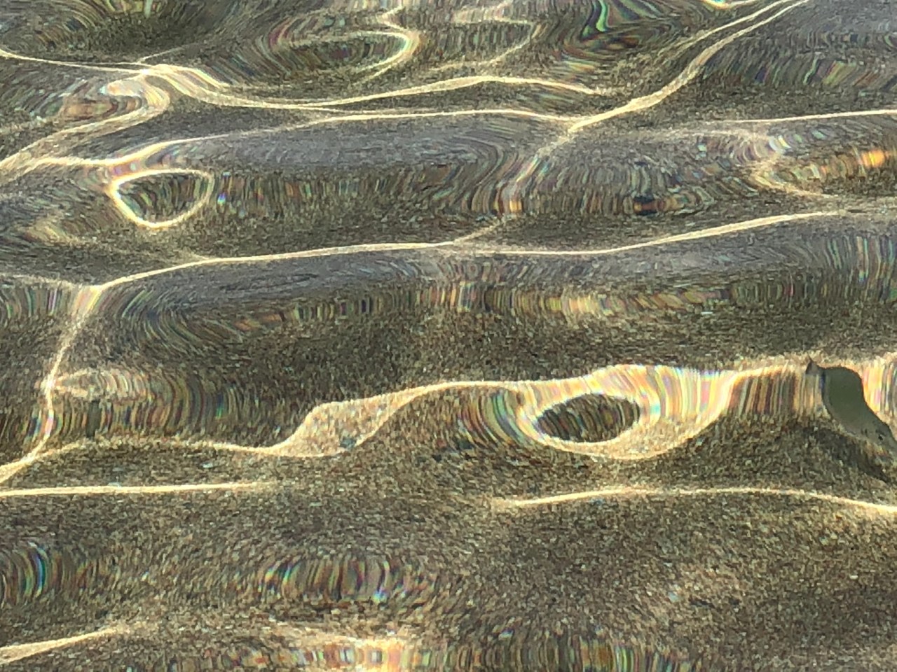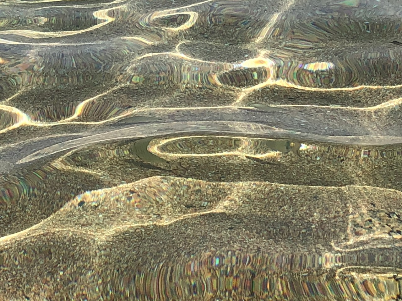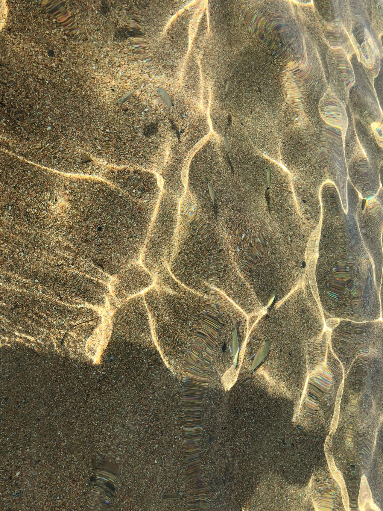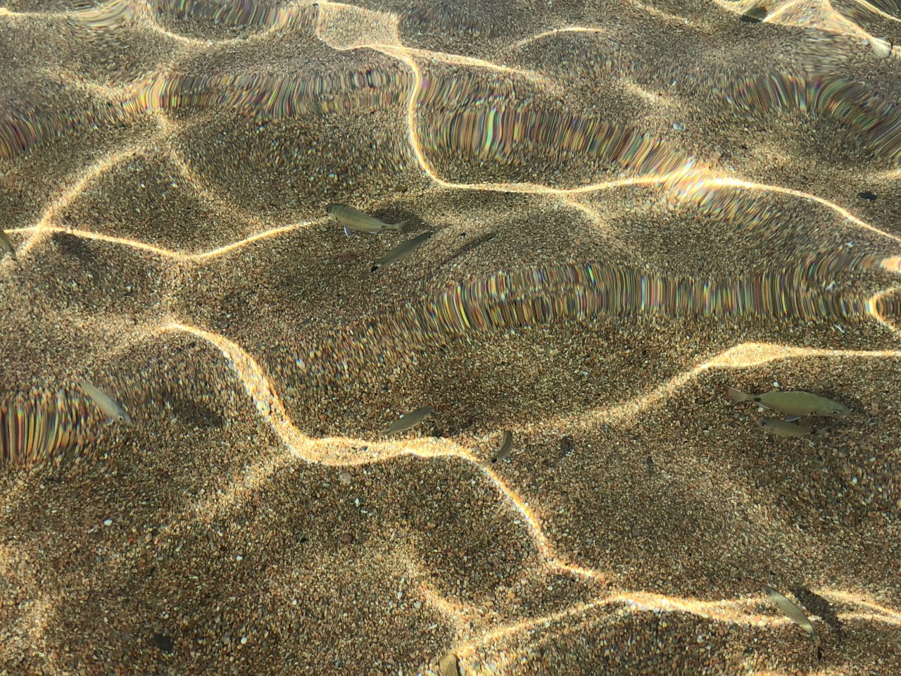 Les eaux de la baie d’Ajaccio sont transparentes sur le bord. D’une transparence qui coupe le souffle et vous permet de voir le sable au fond, les algues longues et fines qui se dandinent au gré des vagues, l’eau scintiller, briller et tanguer avec les reflets du soleil. Des zébrures dorées se créent en faisant des sillons qui parsèment l’eau de dessins translucides, miroitant et se reflétant, projetant des reflets qui vous attirent et vous projettent dans la mer. On peut y mirer un monde aquatique fait de petits poissons eux-mêmes transparents avec des couleurs jaunes pâles et du bleu tropical sur les côtés. Et nombreux sont ces petits poissons, petits et grands, voguant par ban ou seuls, se jouant des vagues, des flux et reflux de la mer, ondoyant dans cette eau paradisiaque digne des tropiques.