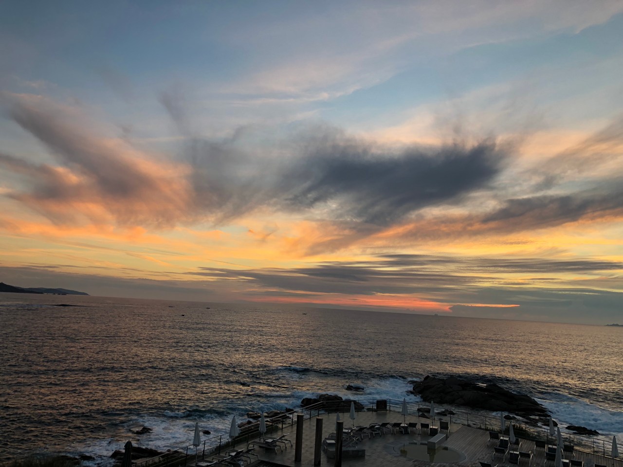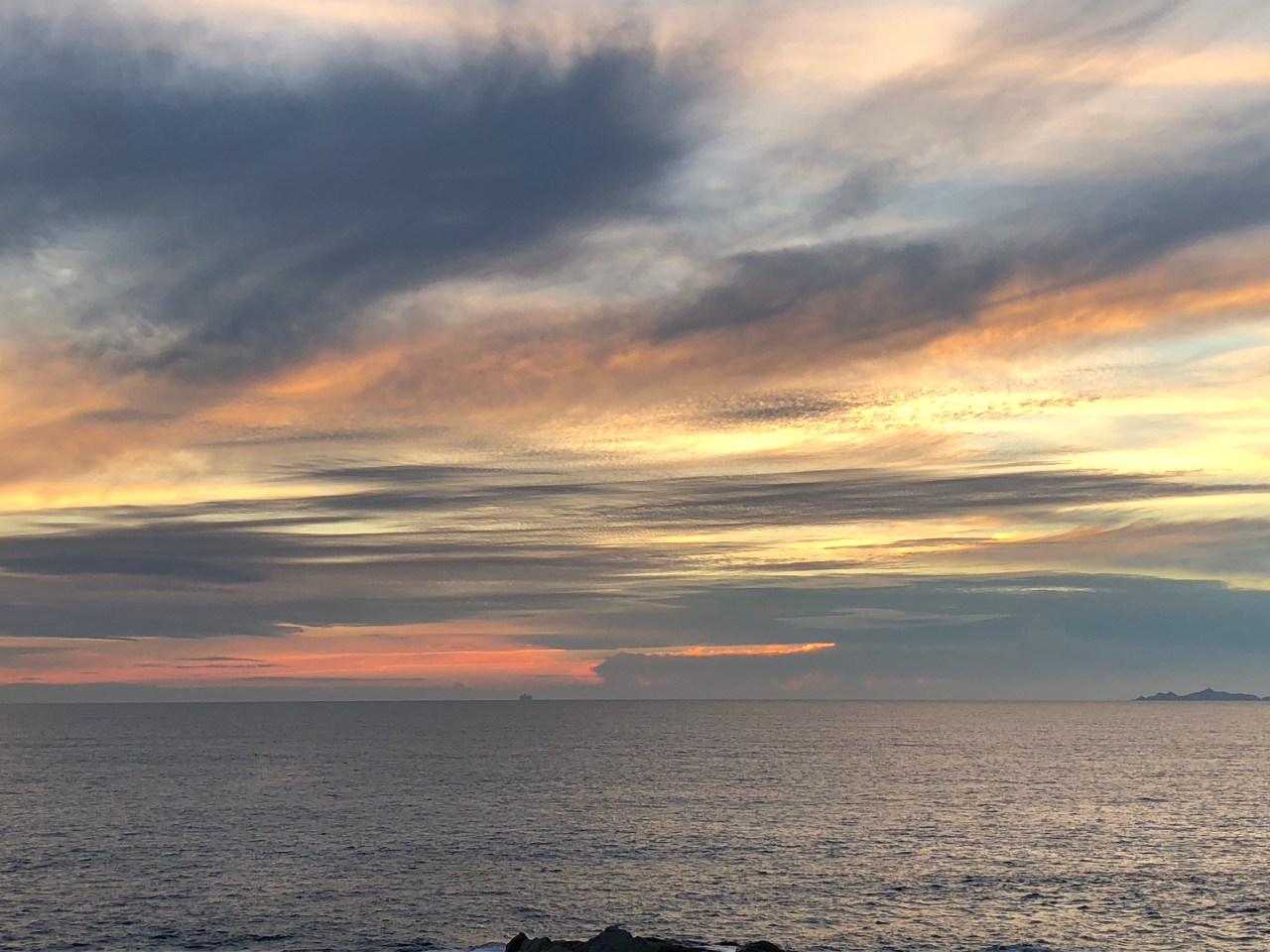 On dirait alors avoir devant les yeux un tableau impressionniste, fait de pastels explosés multicolores dont les poils des pinceaux auraient entaché la feuille pour se répandre en de multiples échappées. On a alors devant soi un feu d’artifice dont les mèches éclatent en une ronde ou bien en un étirement qui s’allonge au plus près de la mer et rejoint le ciel dans des trainées grises, noires, oranges, sanguines, jaunes, bleutées. Des formes les plus rocambolesques les unes des autres s’ouvrent à vous et parfois on dirait des oiseaux géants qui recouvrent ce que nous sommes. Ou bien des splashs gris, jaunes, oranges, rouges ou noirs apparaissent et laissent passer les rayons du soleil et le bleuté du ciel visible.