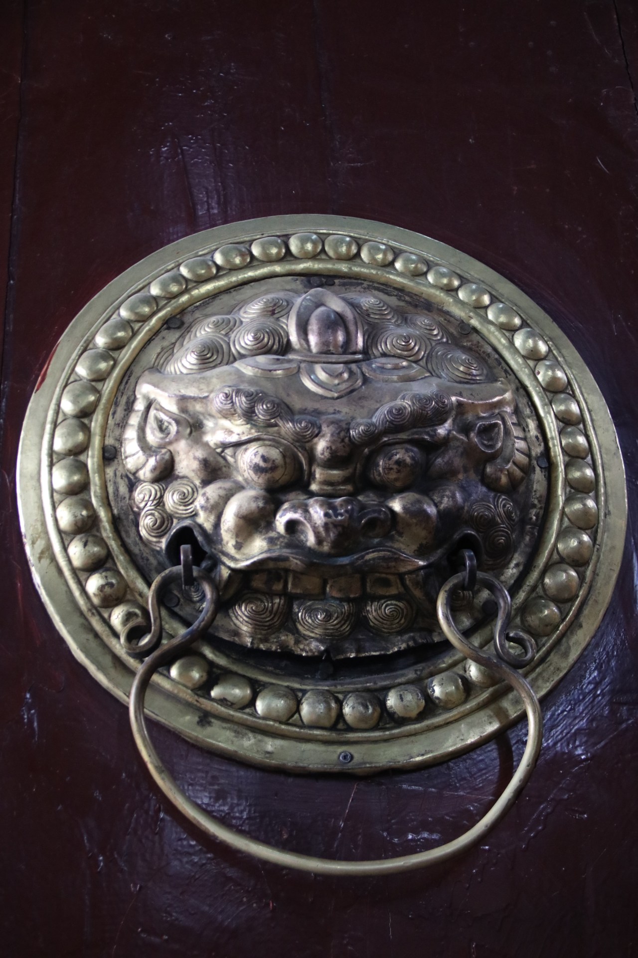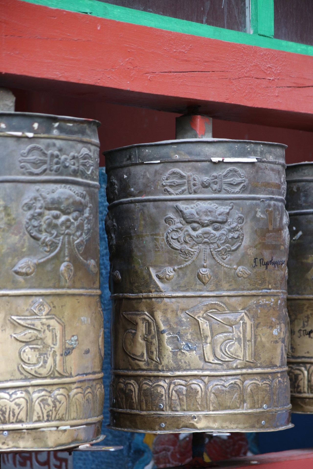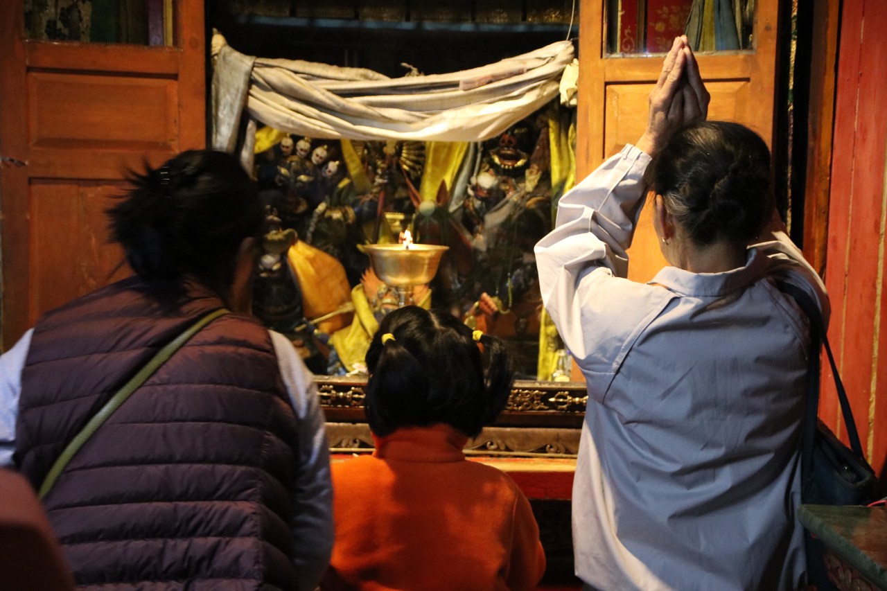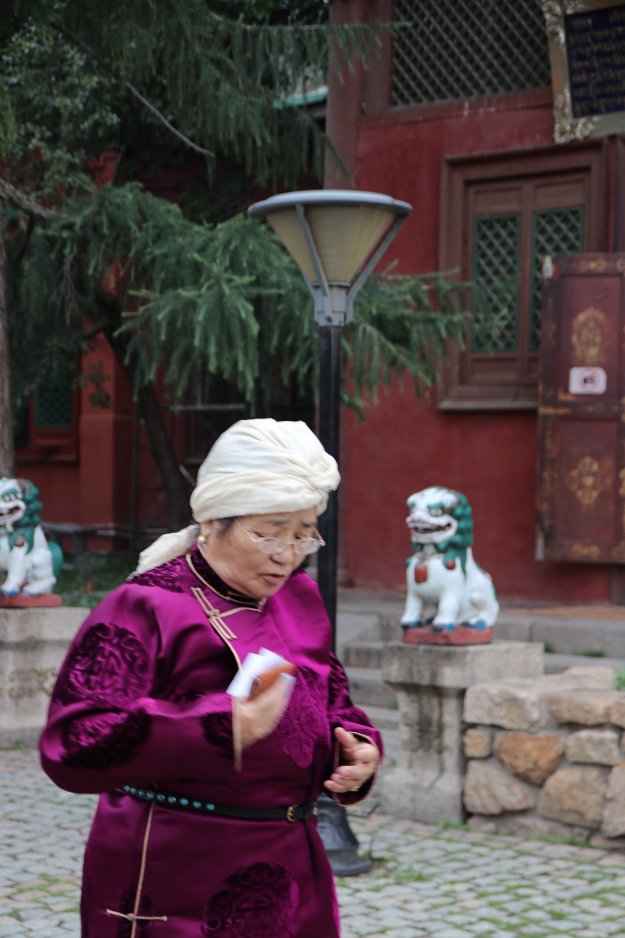 Nous ressortons pour longer un ou deux temples et surtout suivre le chemin de pèlerinage dit kora où nous croisons les fidèles en train de faire les prières au sol (debout, allongé puis debout et ainsi de suite avec un pas entre chaque prière). On passe derrière des parois de verre où se trouve une grande statue Tsongkhapa, fondateur de la secte Gelupka. Je croise à nouveau des femmes en costume traditionnel mauve avec un turban noué autour de la tête. Ces costumes sont magnifiques et portent des dessins sur l’éternité. On retrouve les attributs du bouddhisme avec les huit animaux les uns sur les autres, juste devant un autre temple. Et je m’amuse comme à mon habitude à tourner les moulins à prière. C’est toujours un moment de grâce ! Devant le temple il y a souvent un pot où les gens plantent de l’encens. J’imagine que comme au Japon c’est une façon de se purifier. Comme cela sent bon ! Et comme cela m’envoûte !