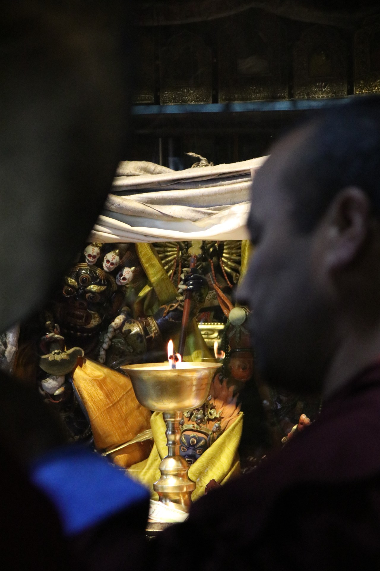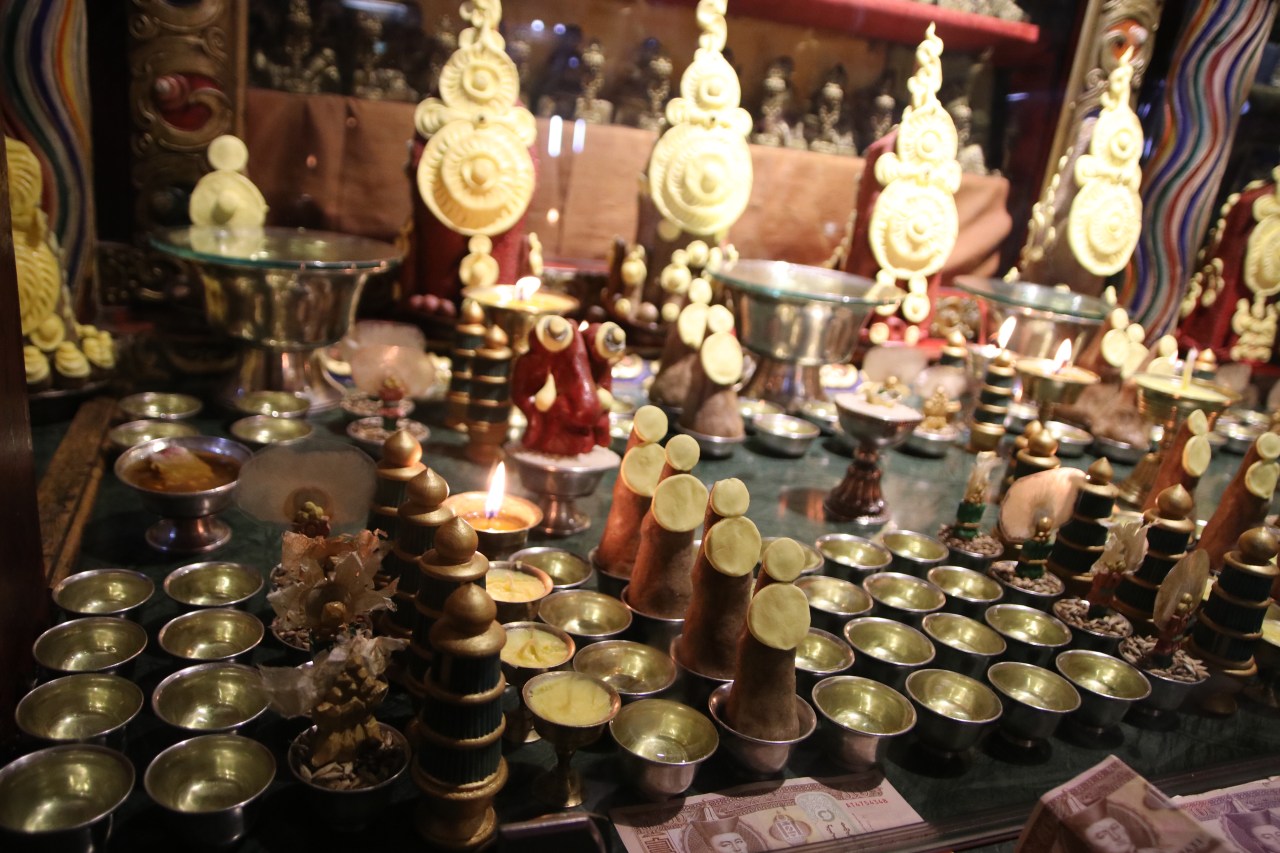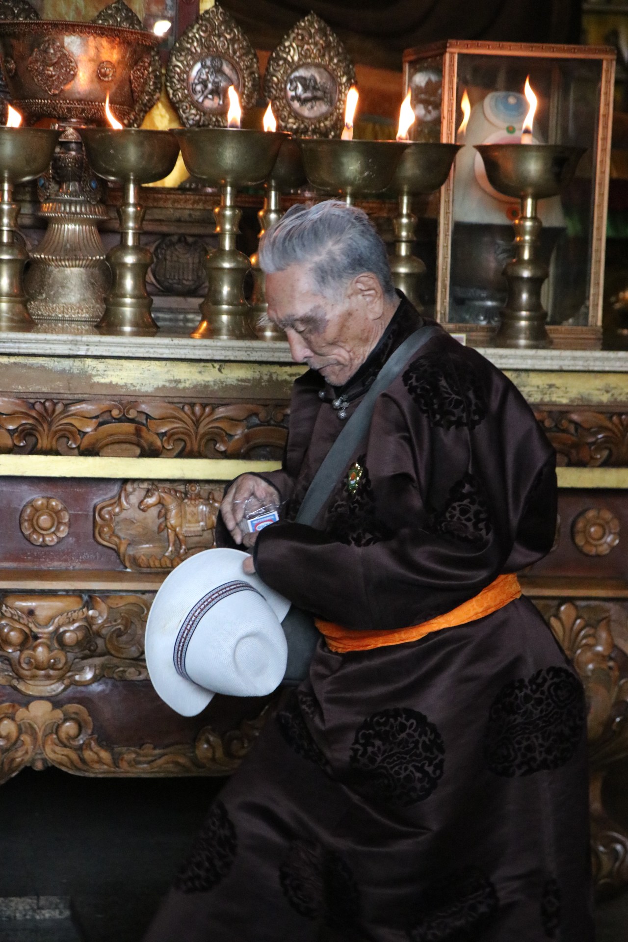 Dans le temple Orchidara, tout autour de la salle les 1000 statuettes d’Amitâyus, bodhisattva de la longévité sont dans des murs vitrés et nous faisons le rituel des bouddhistes. Marcher et tourner dans le sens des aiguilles d’une montre tout le long du temple en priant et prononçant le « Om » rituel qui ponctue toute prière. Je m’assieds sur un des bancs pour écouter la musique qui m’entraîne dans mes voyages bouddhistes. Dans un des coins les gens se recueillent devant je ne sais quel bodhisattva qui semble très important pour eux. Et moi-même je vais me recueillir à cet endroit et tombe sur plusieurs moines qui opèrent une prière avec une coupe remplie d’eau. L’un d’eux porte une sorte d’ombrelle et ils se prosternent devant une bougie. Je continue mon chemin et passe devant les offrandes en beurre de toute taille et de toute forme, colorée ou non. Les bougies allumées enflamment le temple et lui donnent une âme. Je me sens tellement bien dans cette atmosphère de recueillement.