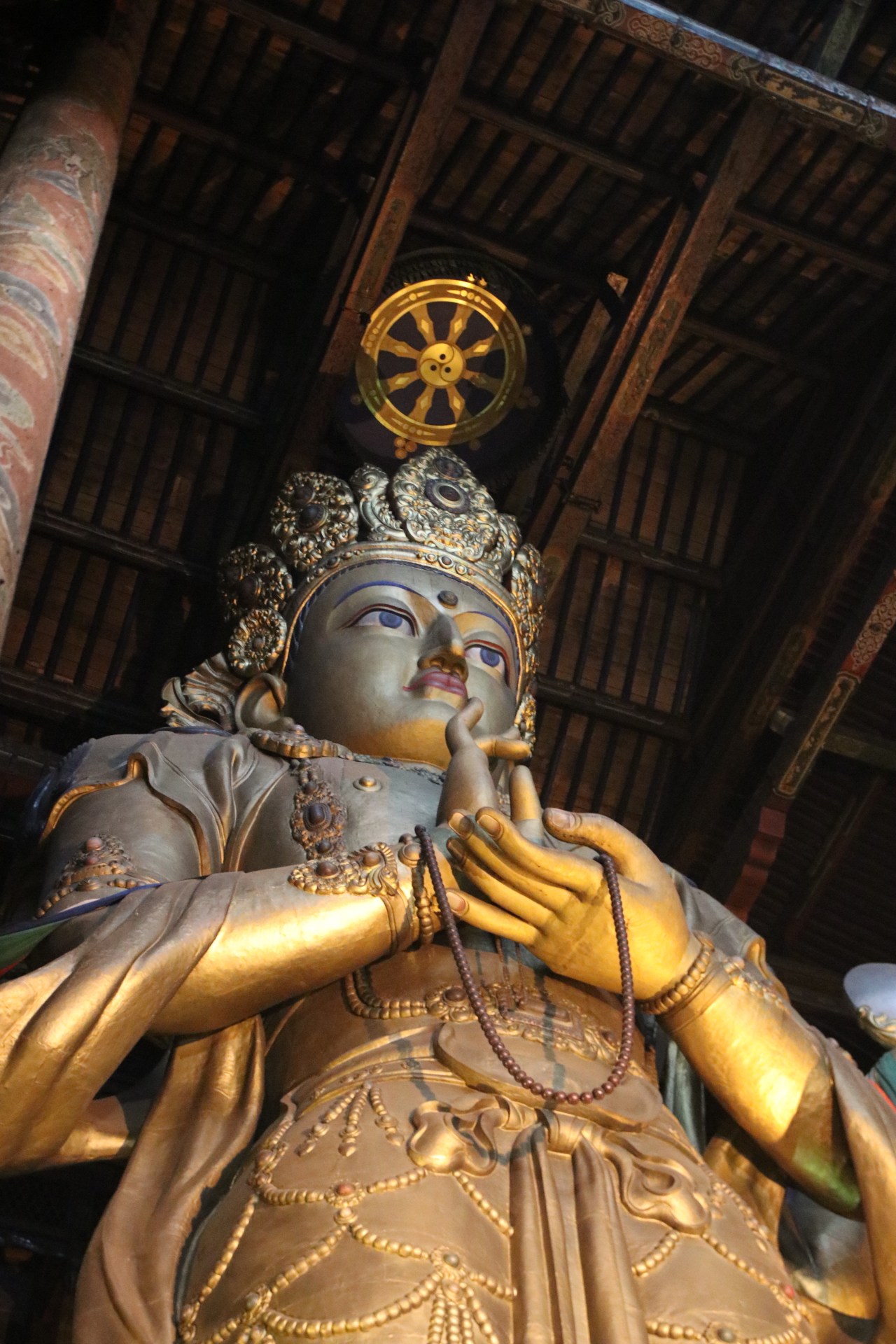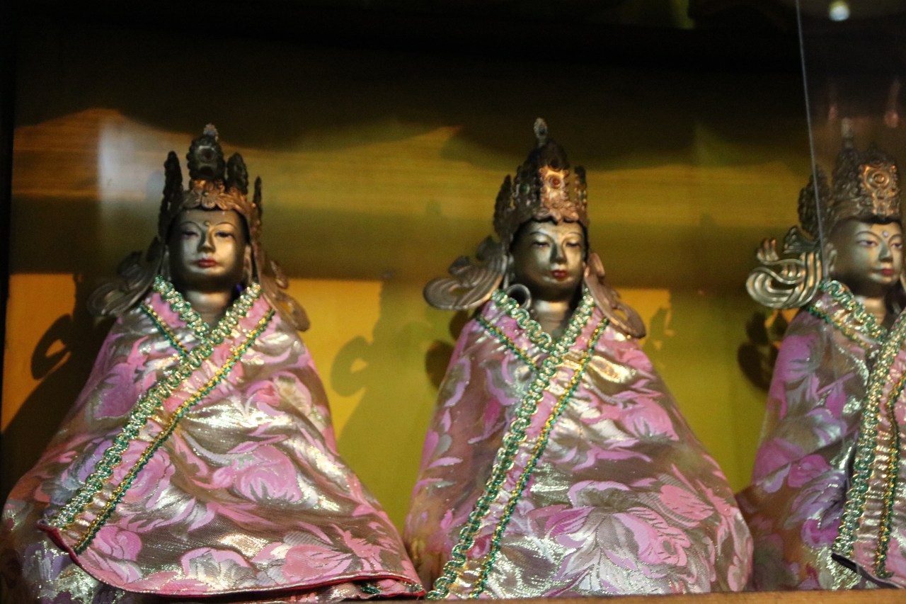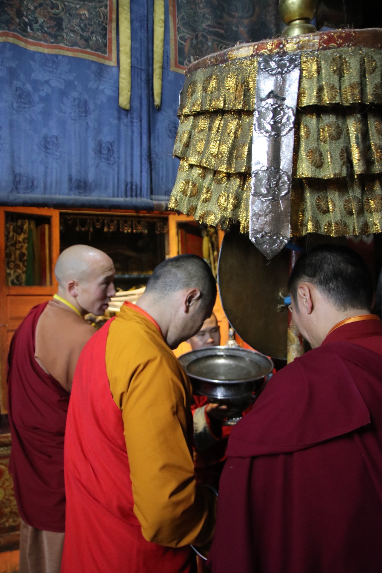 Dans le temple Orchidara, tout autour de la salle les 1000 statuettes d’Amitâyus, bodhisattva de la longévité sont dans des murs vitrés et nous faisons le rituel des bouddhistes. Marcher et tourner dans le sens des aiguilles d’une montre tout le long du temple en priant et prononçant le « Om » rituel qui ponctue toute prière. Je m’assieds sur un des bancs pour écouter la musique qui m’entraîne dans mes voyages bouddhistes. Dans un des coins les gens se recueillent devant je ne sais quel bodhisattva qui semble très important pour eux. Et moi-même je vais me recueillir à cet endroit et tombe sur plusieurs moines qui opèrent une prière avec une coupe remplie d’eau. L’un d’eux porte une sorte d’ombrelle et ils se prosternent devant une bougie. Je continue mon chemin et passe devant les offrandes en beurre de toute taille et de toute forme, colorée ou non. Les bougies allumées enflamment le temple et lui donnent une âme. Je me sens tellement bien dans cette atmosphère de recueillement.