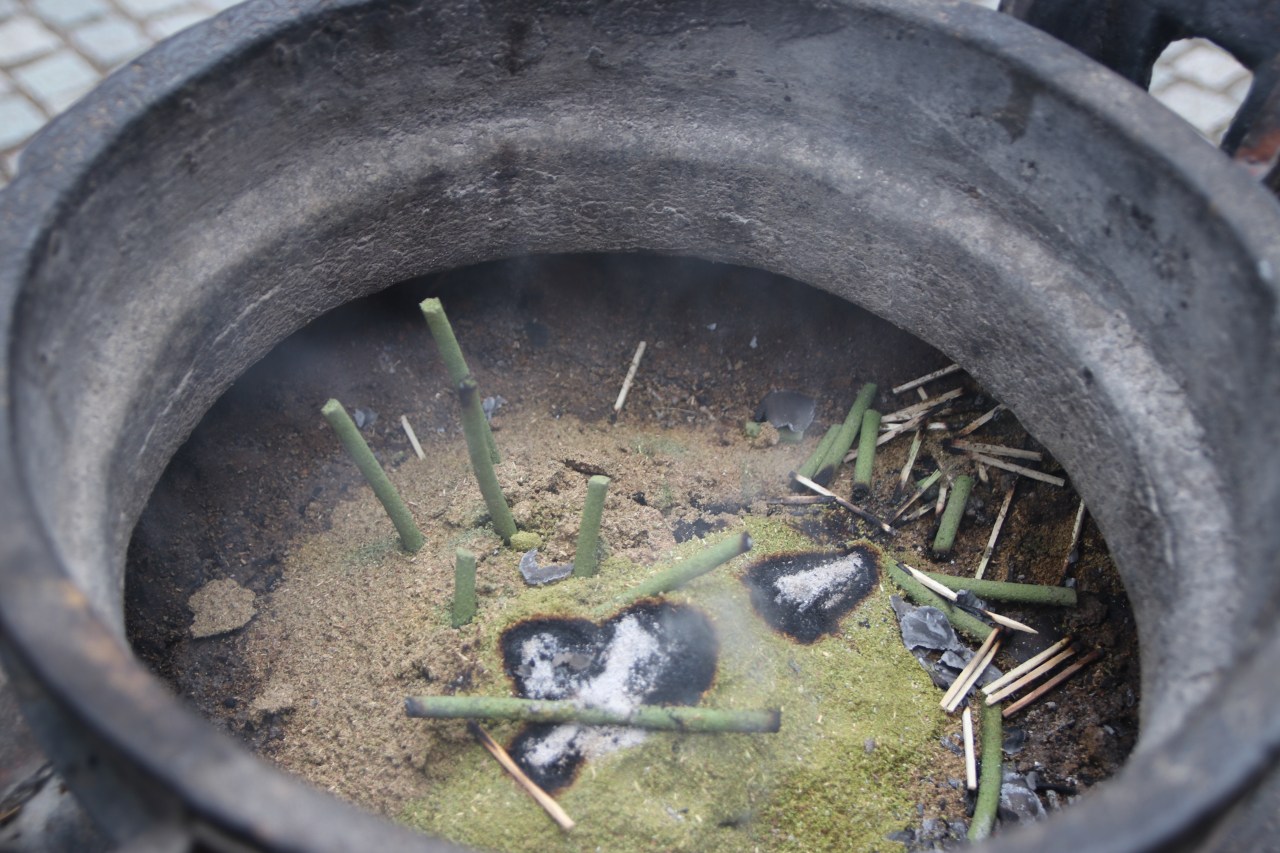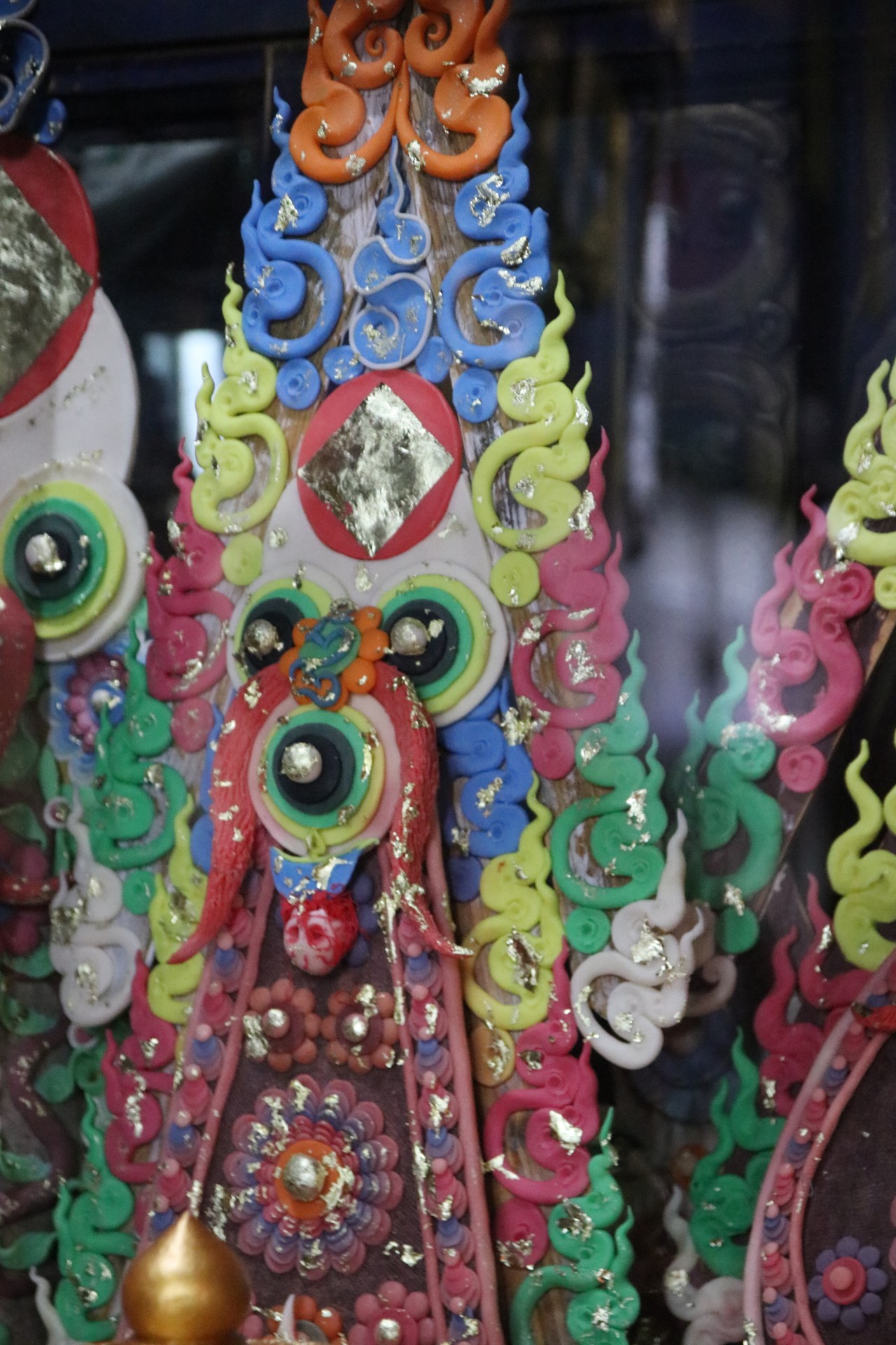 A ses pieds des lampes à huile brûlent pour que les fidèles puissent prier, laisser des offrandes et se poser.