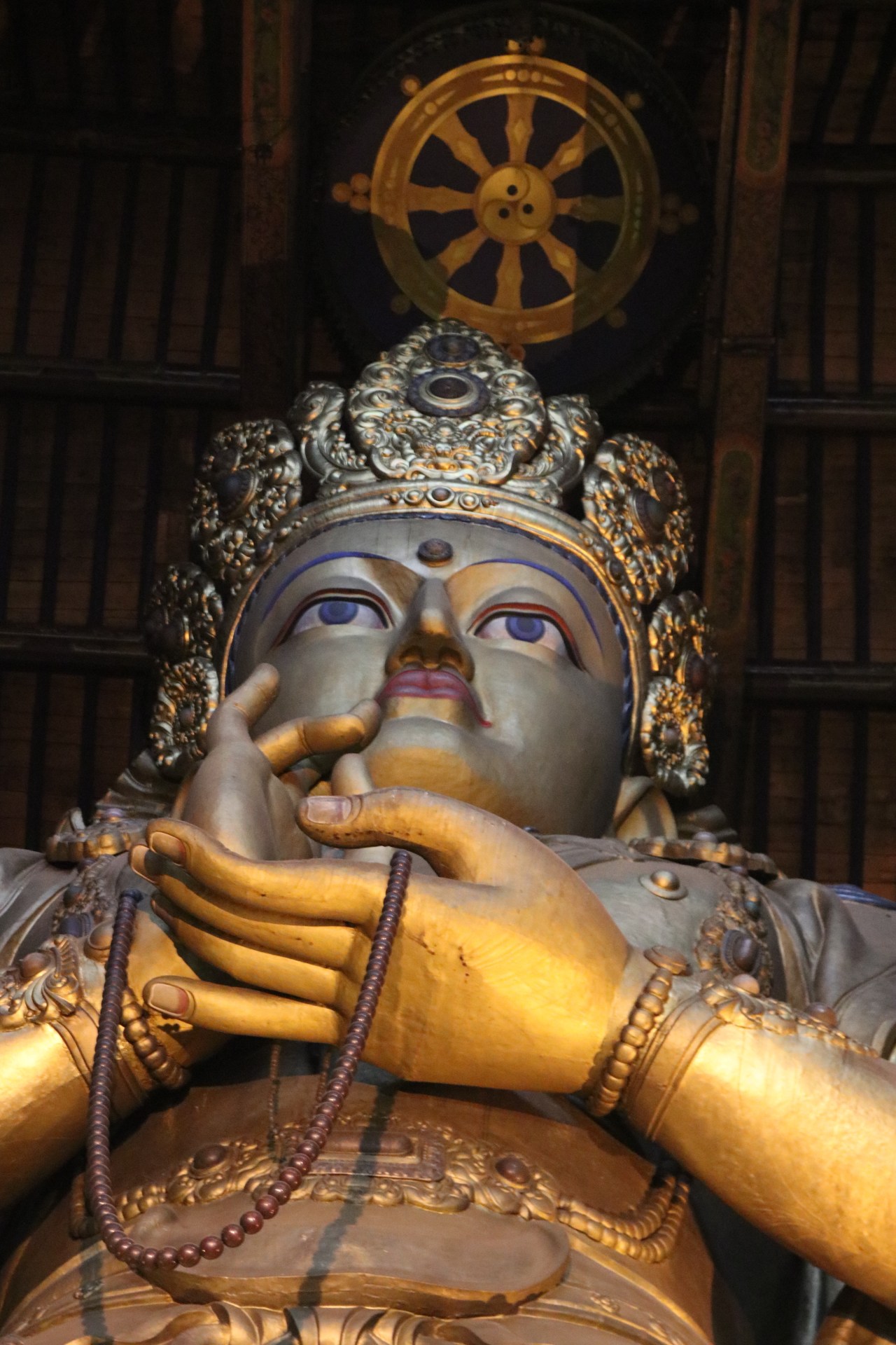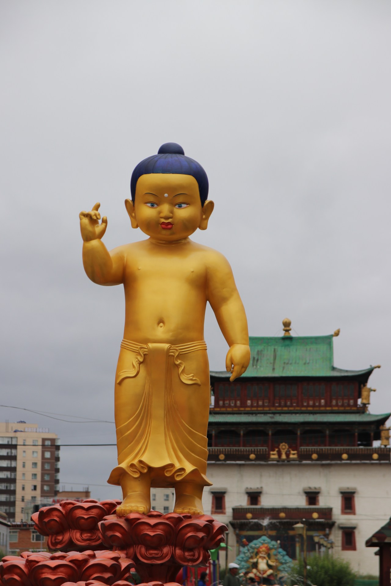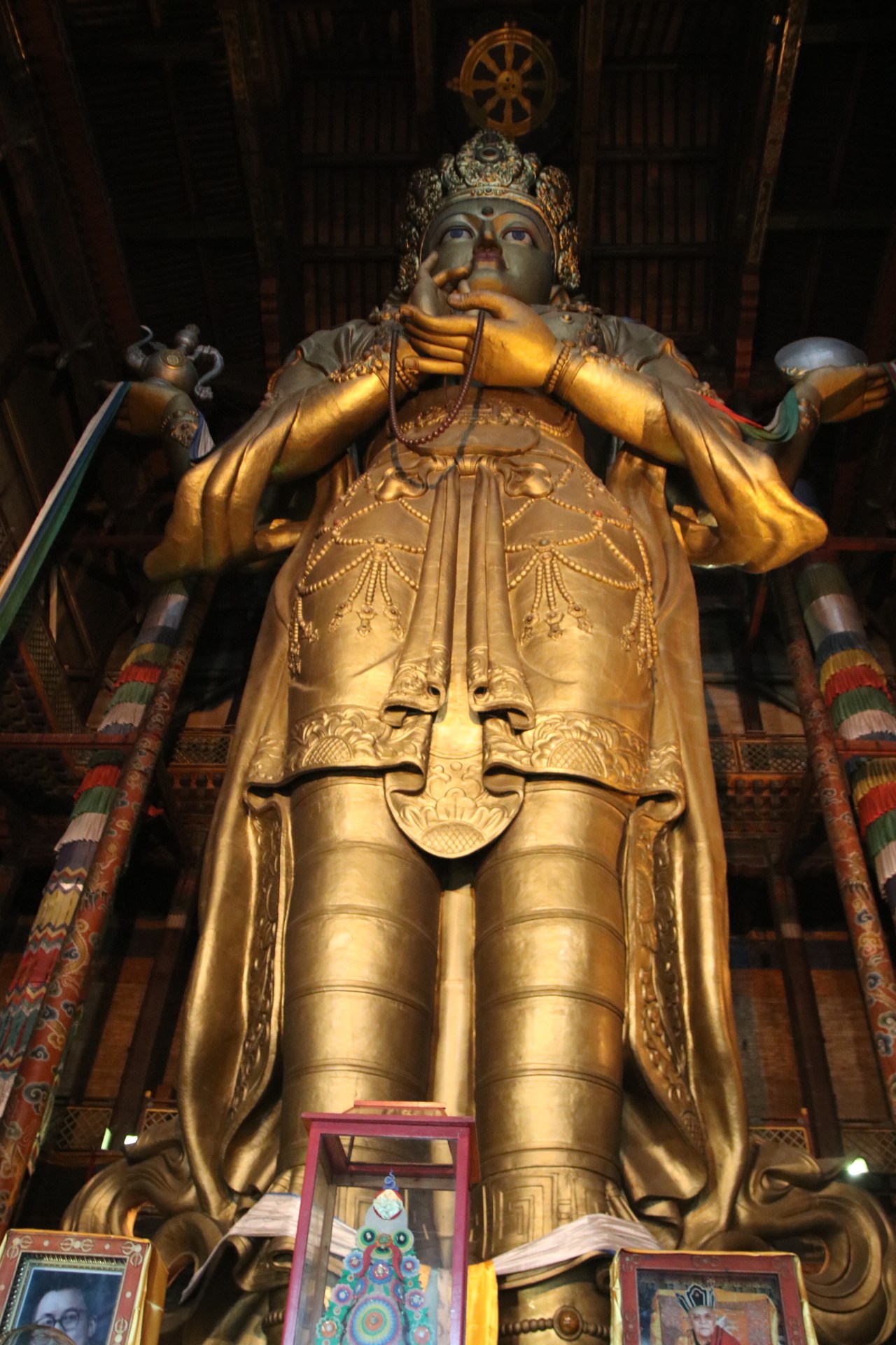 La statue de Megjid-Janraiseg «le Seigneur qui regarde dans toutes les directions» mesure 26 mètres de haut et a été inaugurée en octobre 1996, par le Dalai Lama. Elle est composée de 26 tonnes de cuivre, recouverte d’or offert par le Népal, la Mongolie et le Japon, et ornée de 2286 pierres précieuses. Elle contient également 27 tonnes d’herbes médicinales, 334 soustras et 2 000 000 de liasses de mantras**.