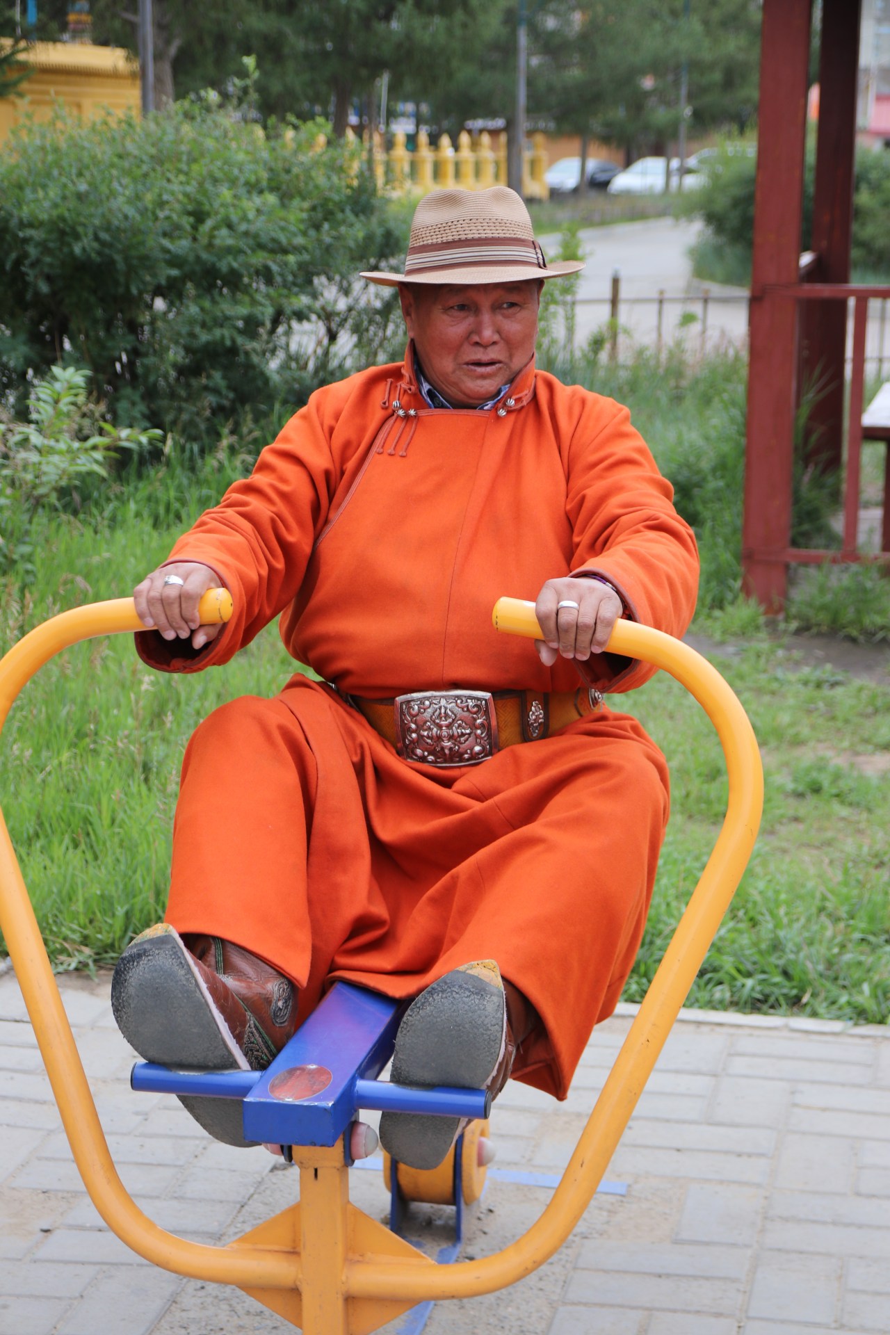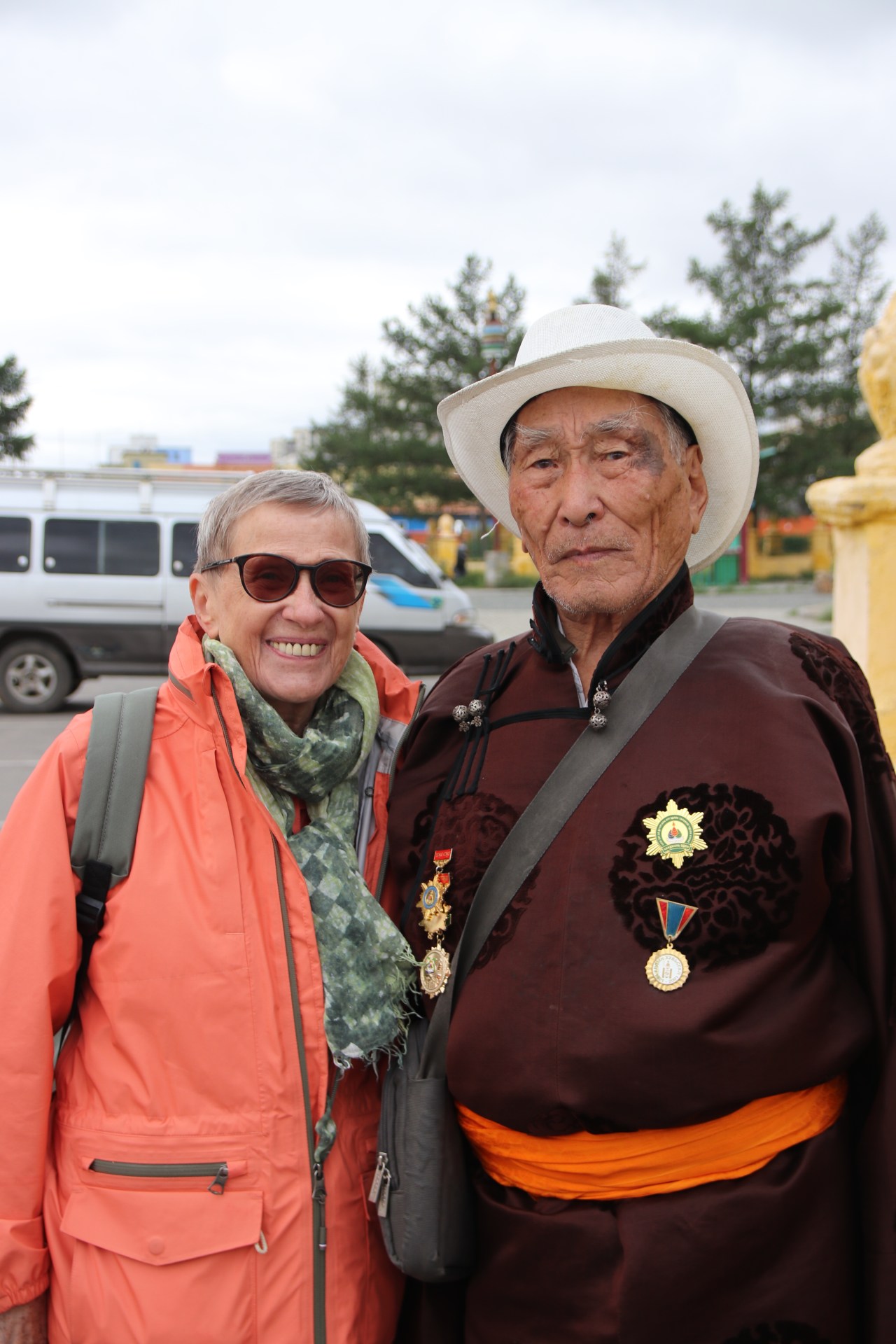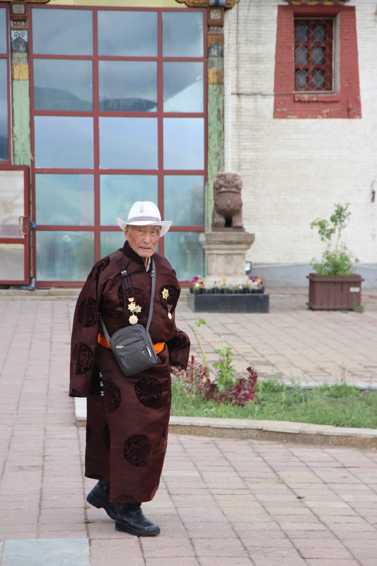 Et depuis quelque temps je suis un homme habillé dans son costume traditionnel marron et surtout son chapeau de cow-boy blanc. Sa taille est enserrée d’une écharpe orange qui contraste avec le vêtement. Je le suis tout au long de son périple intérieur dans le temple mais à l’extérieur aussi. Il m’a tapé dans l’œil avec ses médailles de guerre (je suppose) et sa démarche affirmée. Je le trouve très beau ! Nous le retrouverons à un autre endroit du temple et je le photographierais avec Cécile. Nouveau couple mongol de l’année !