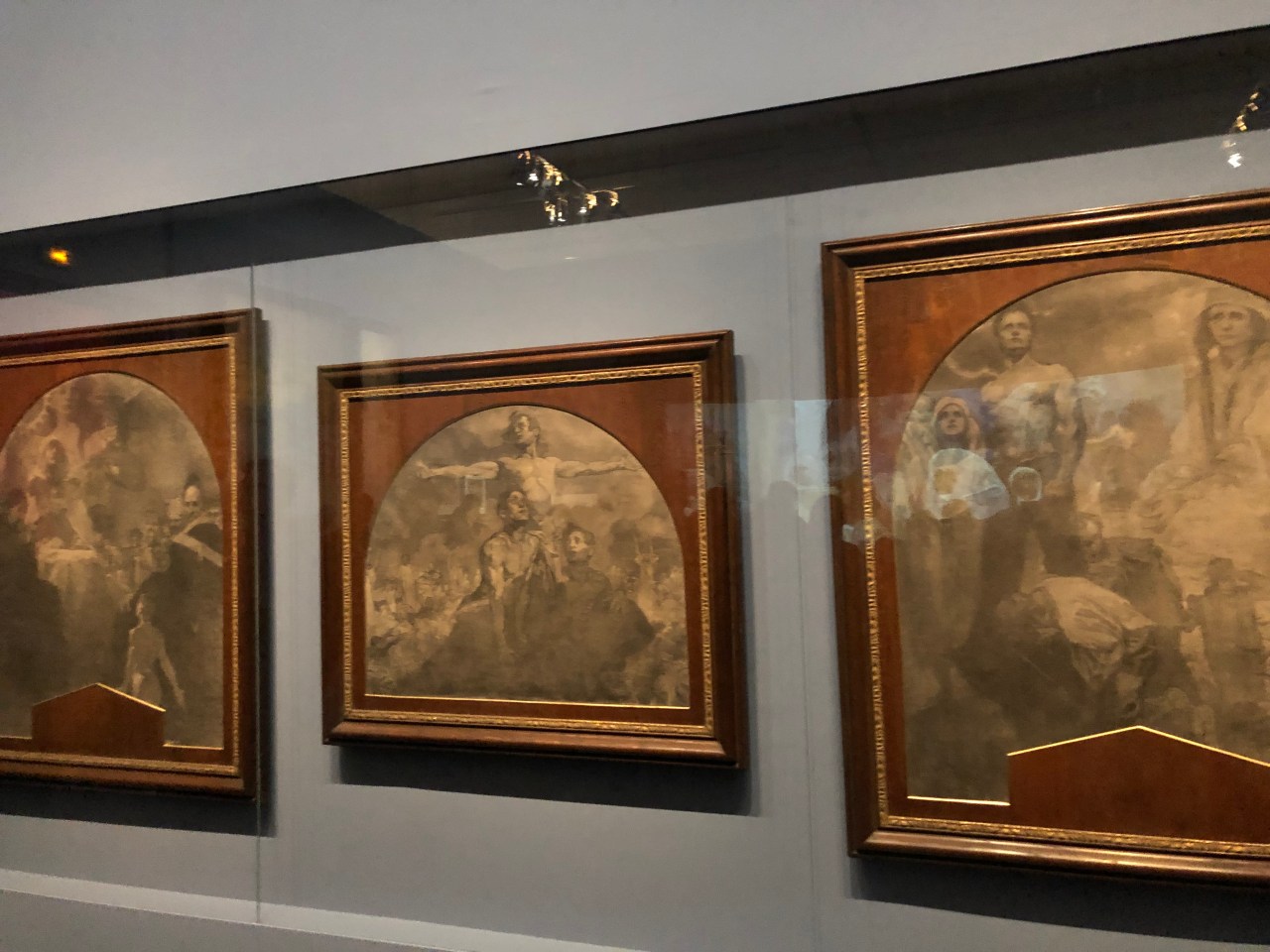 Mais ce qui m’a frappé ce sont les œuvres patriotiques, à la « soviétique » qui dépeignent les slaves dans leur unité. Des œuvres qui décrivent l’histoire tchèque et celle aussi des autres nations slaves. On pourrait dire qu’il a créé des images à la soviétique tellement elles reflètent la vie politique, nationaliste de ces peuples. Les tableaux vantent les aspects nationalistes, style komsomols russes, pour représenter la Moravie! Ou bien les slogans que l’on peut retrouver dans le métro moscovite des années 40/50. La typologie des œuvres vantant les campagnes et le travail.
