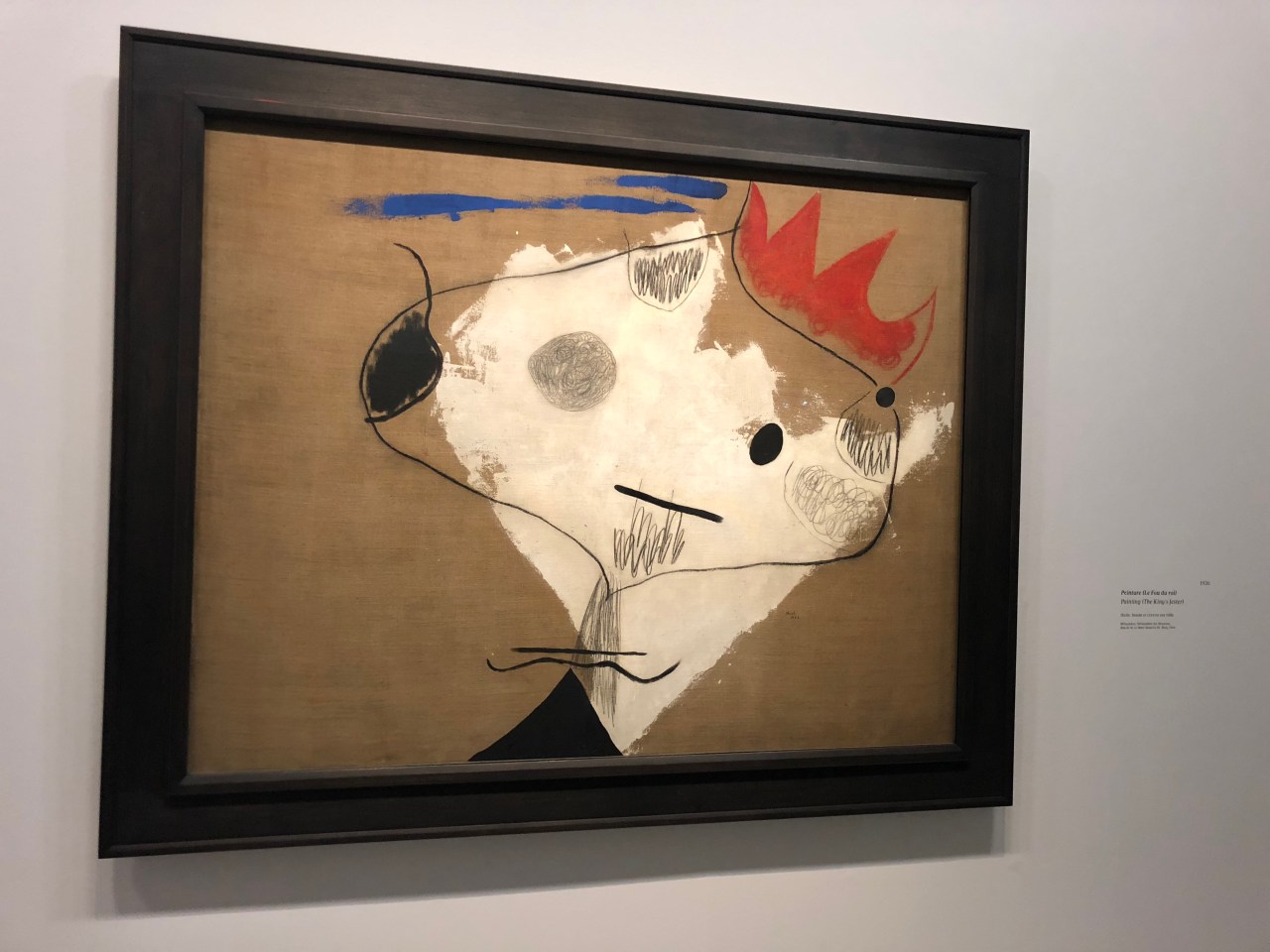 Un tableau qui vous laisse le loisir de rêver. Une tâche bleue au milieu d’une toile marron et un titre « Poème » « Ceci est la couleur de mes rêves ». Ou bien celui qui s’appelle le « fou du roi » avec une couronne rouge et un visage double blanc et contours noirs en forme de Snoopy ! Ou celui d’une femme tige dont le cœur est le visage et la corps sur une autre branche ! Le tout sur fond bleu bariolé.