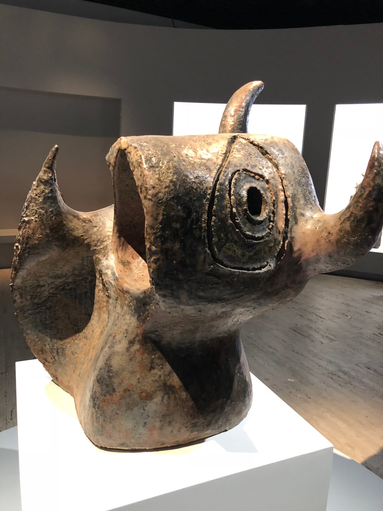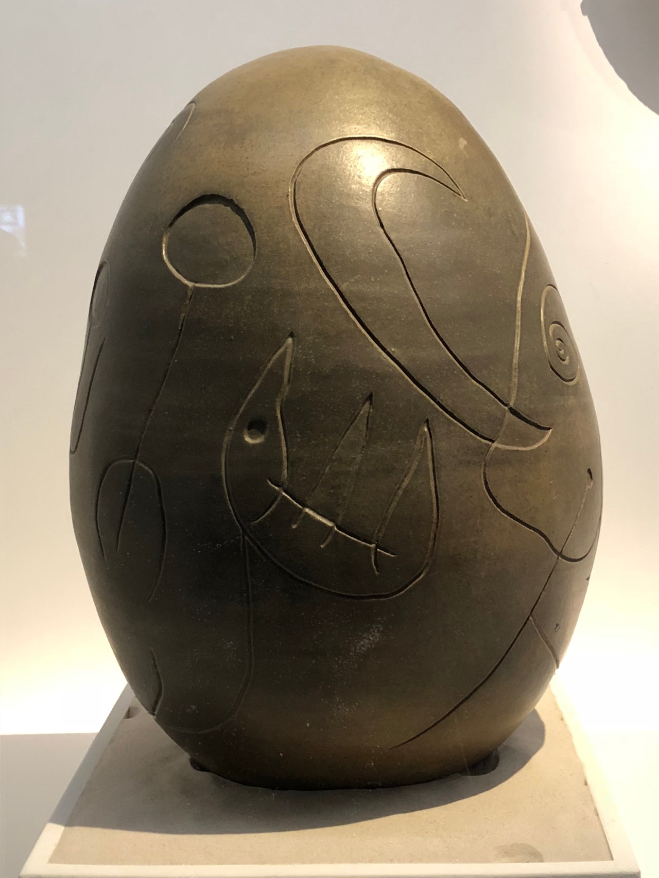 Et cet œuf en terre cuite avec les dessins à la Miro si typique et qui donne envie de rêver de lune, de soleil ; et cette céramique en forme de taureau avec un seul œil et deux cornes parallèles sur le côté. Un monde fantastique qui vous emporte dans des rêves d’enfant.