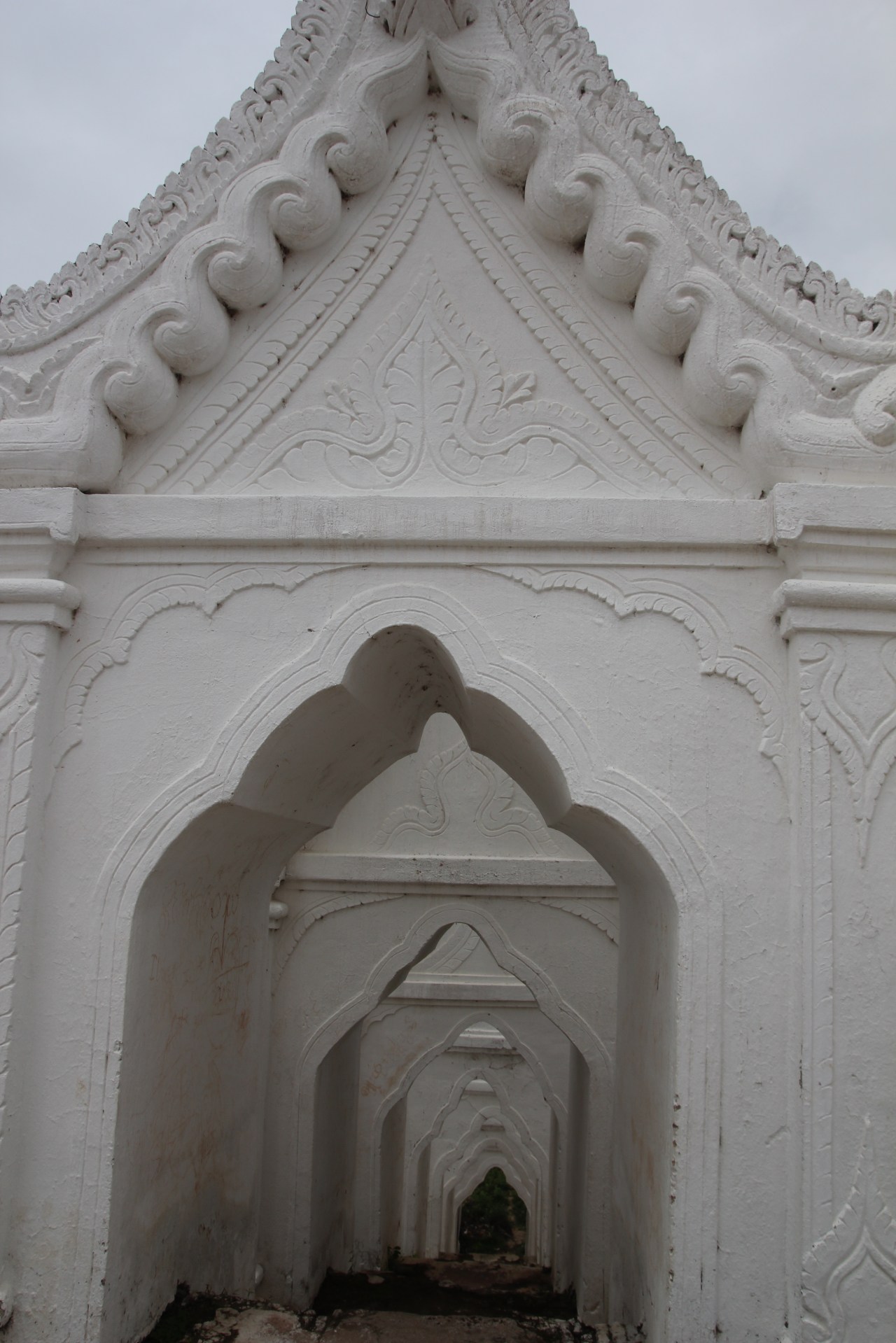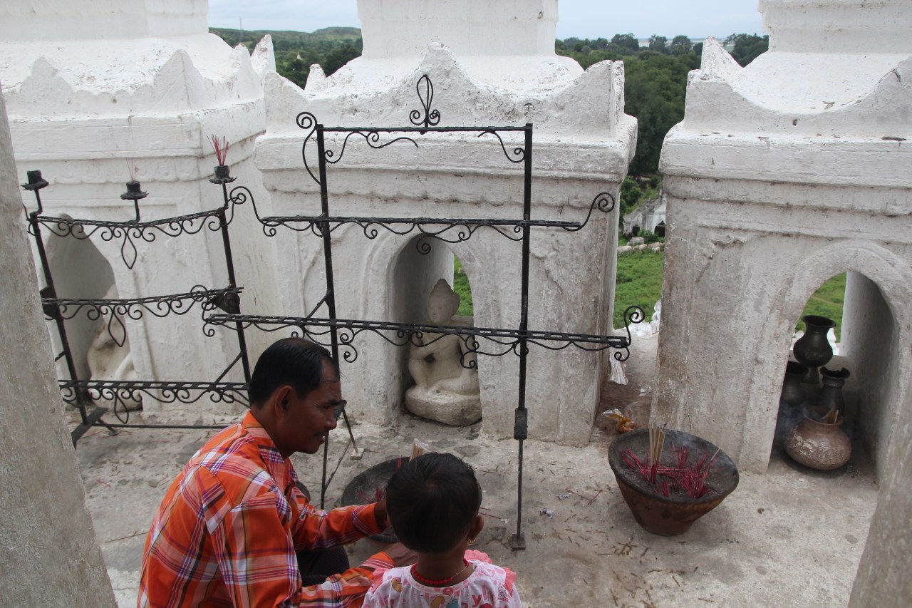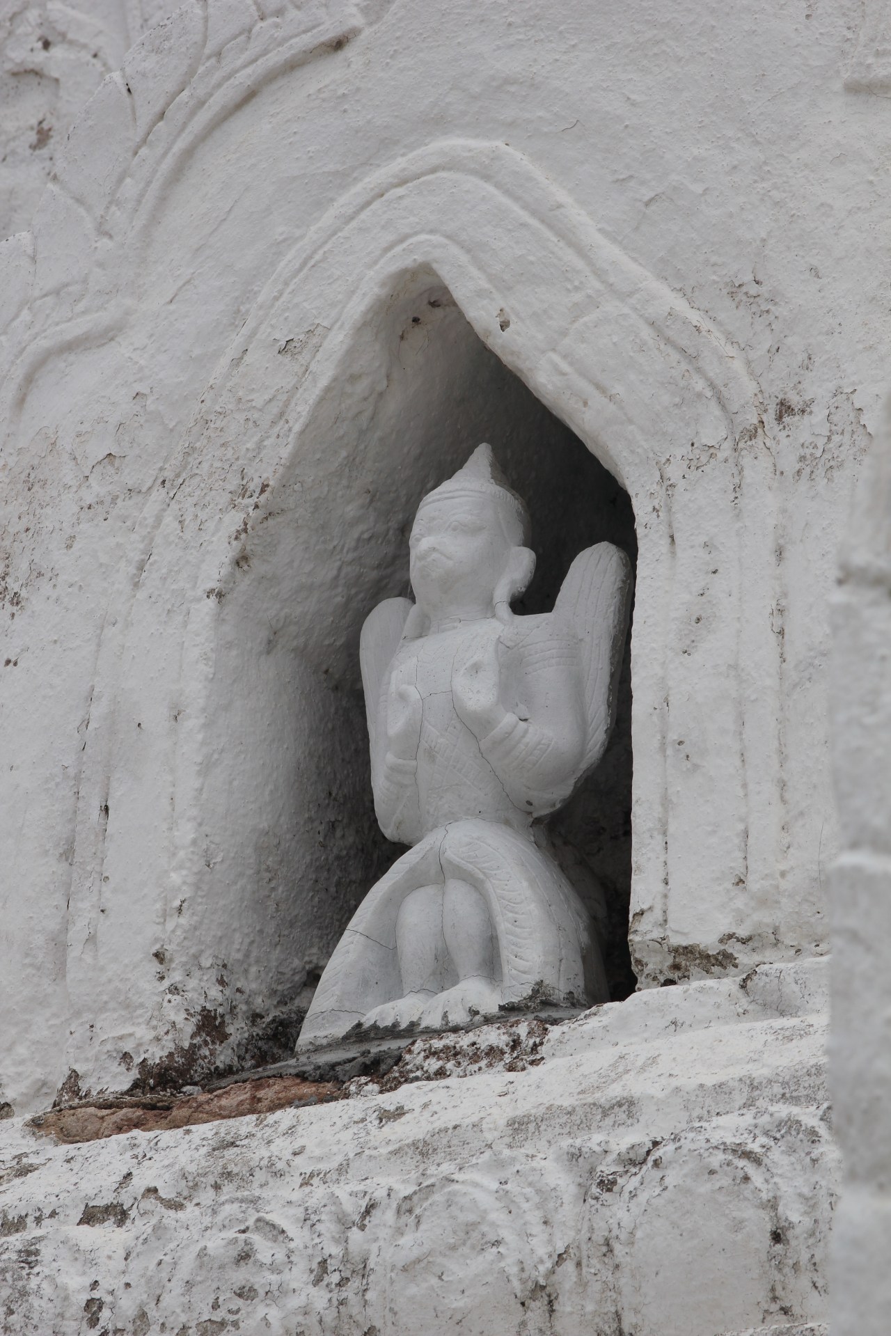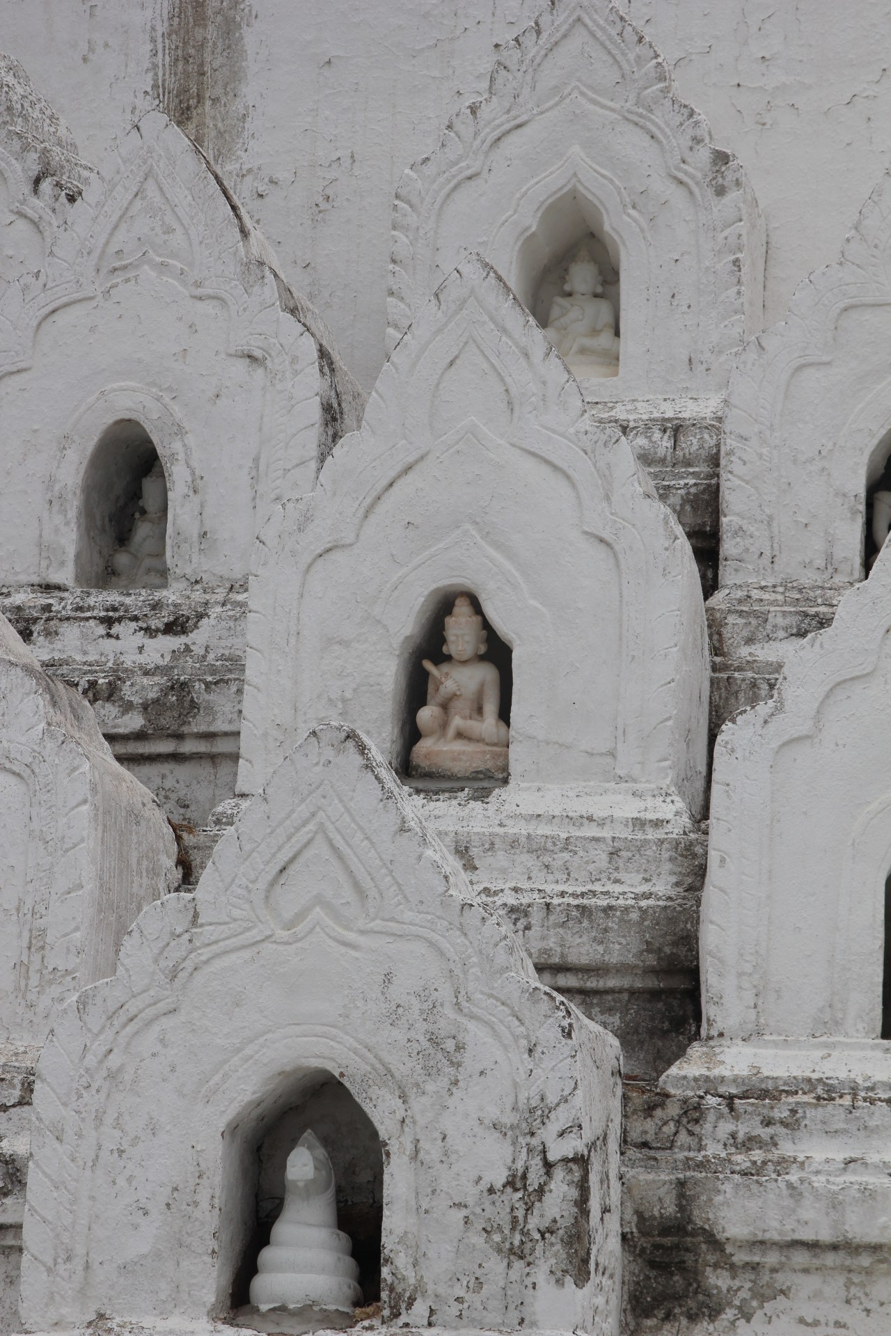 Un peu d’histoire : la pagode Hsinbyume fut édifiée en 1816 par Bagyidam, le roi la voulut très belle, à la mesure du chagrin que lui provoqua la mort de sa première femme (Princesse Hsinbyume veut dire princesse éléphant blanc), qui porte son nom – répétition de l’histoire du Taj Mahal en Inde.