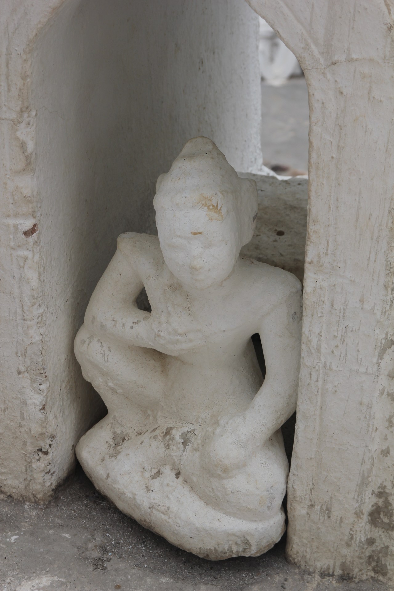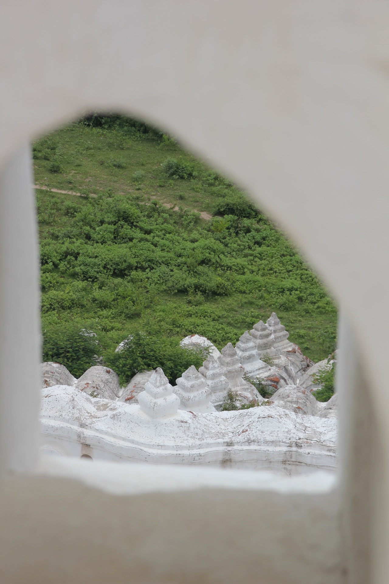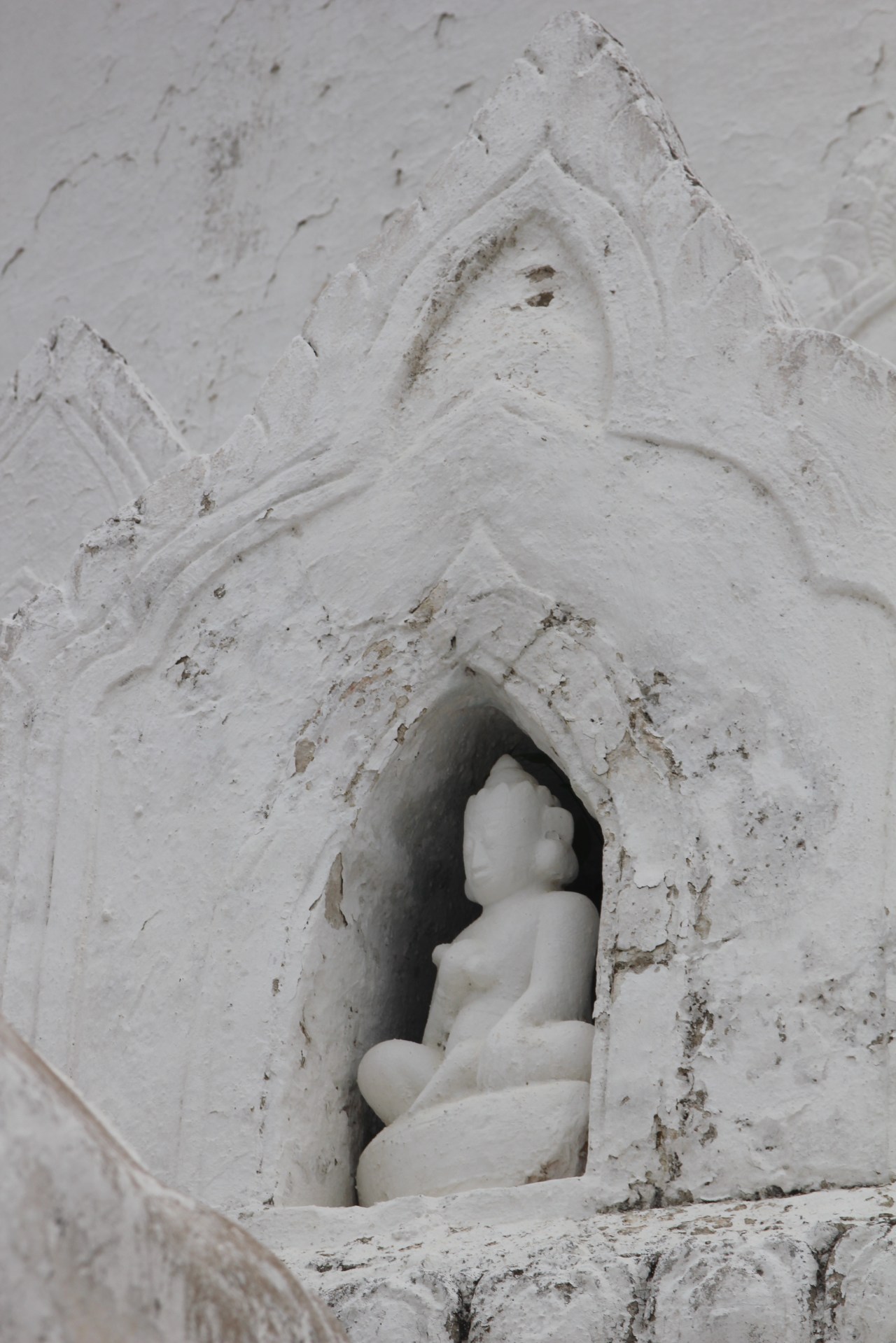 Pour atteindre le dernier étage de la pagode il faut grimper étage par étage, terrasse par terrasse. Cela se mérite ! Chaque étage comporte des créatures ou des statues de figures mythologiques, des ogres, des nagas, des serpents, des nats, des esprits et des représentations de Bouddha. Des couloirs blancs permettent de faire une circumanbulation tout autour de la pagode. Chaque Bouddha est sous un stupa pour le protéger et l’honorer. Hélas beaucoup de statues ont disparues ou ont été décapitées. Pour quelles raisons je ne sais.