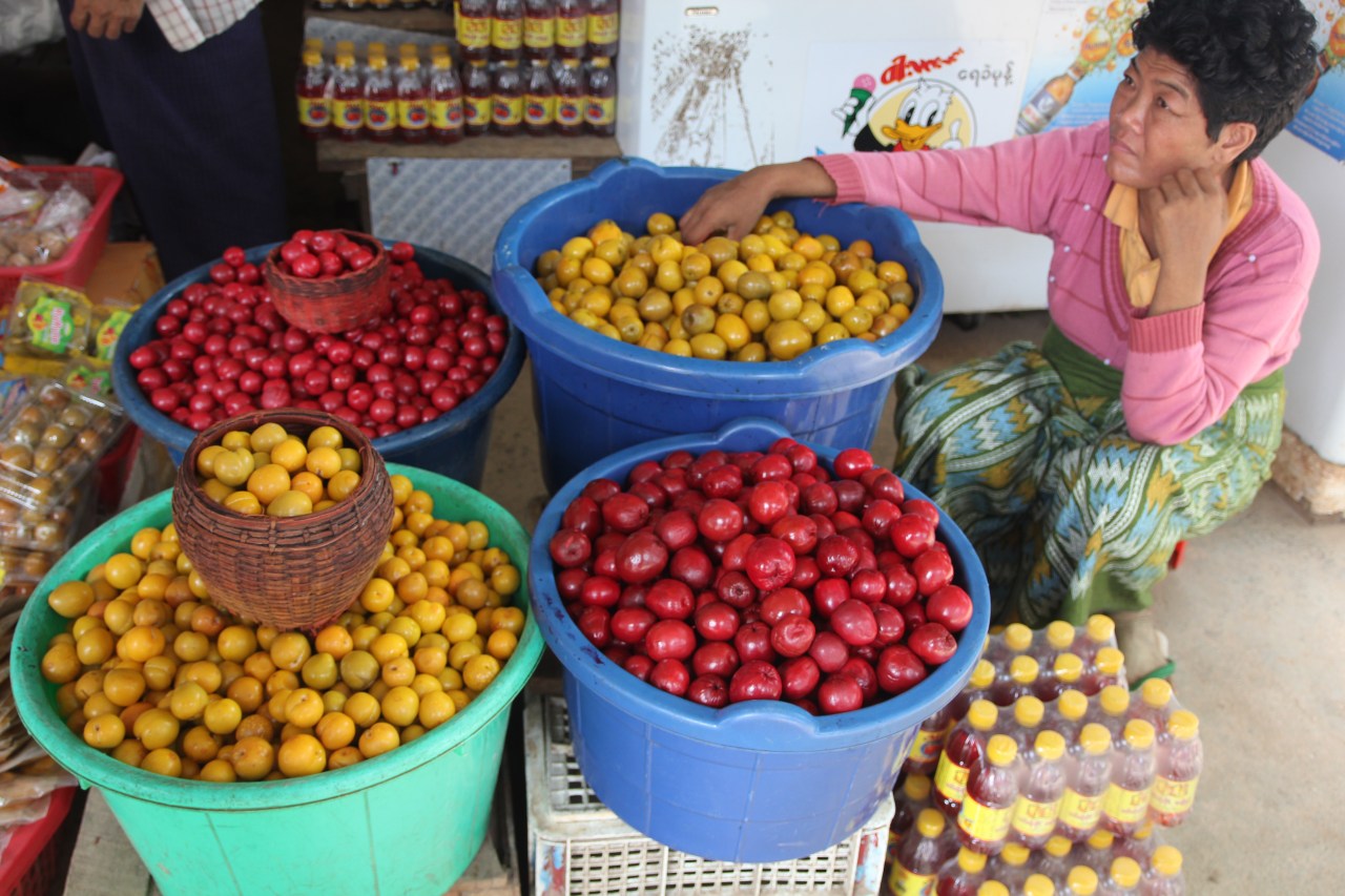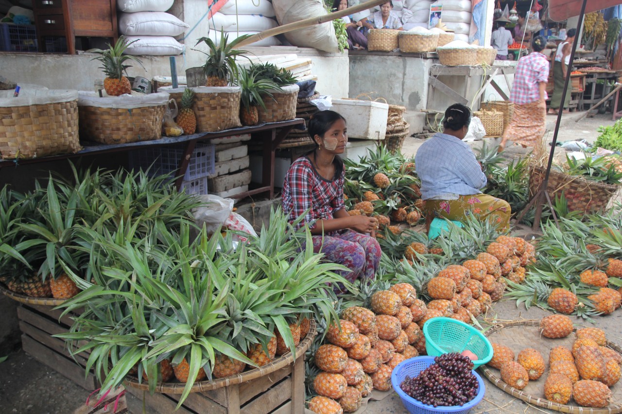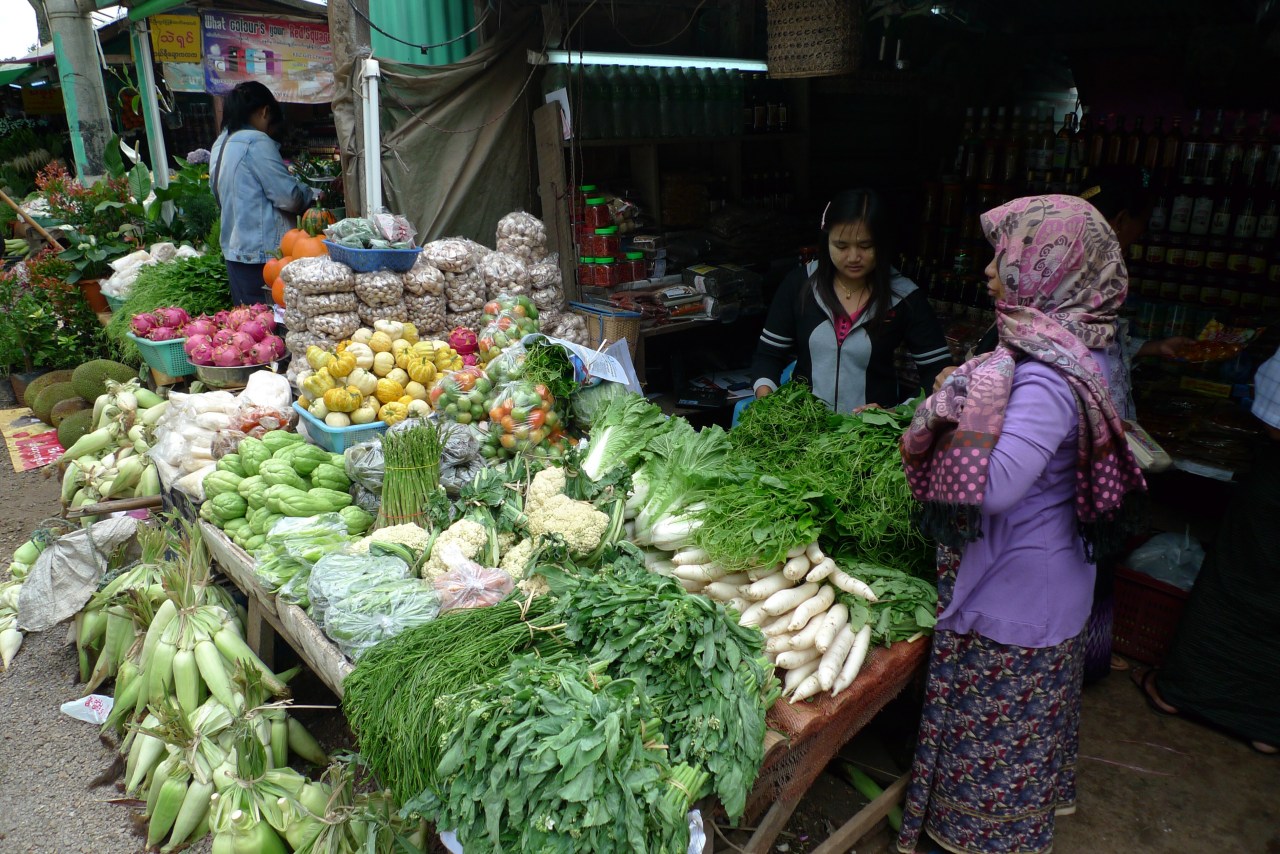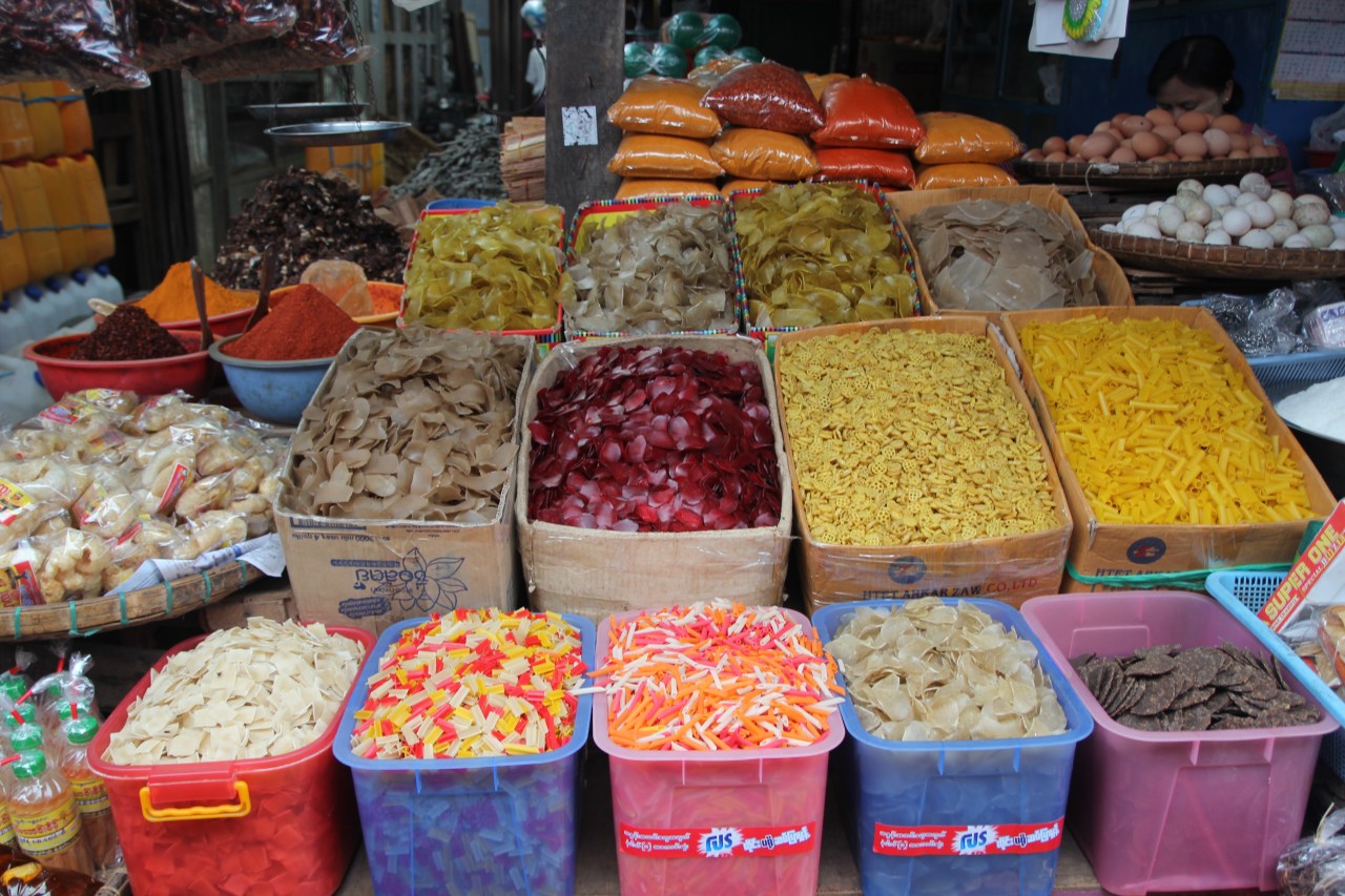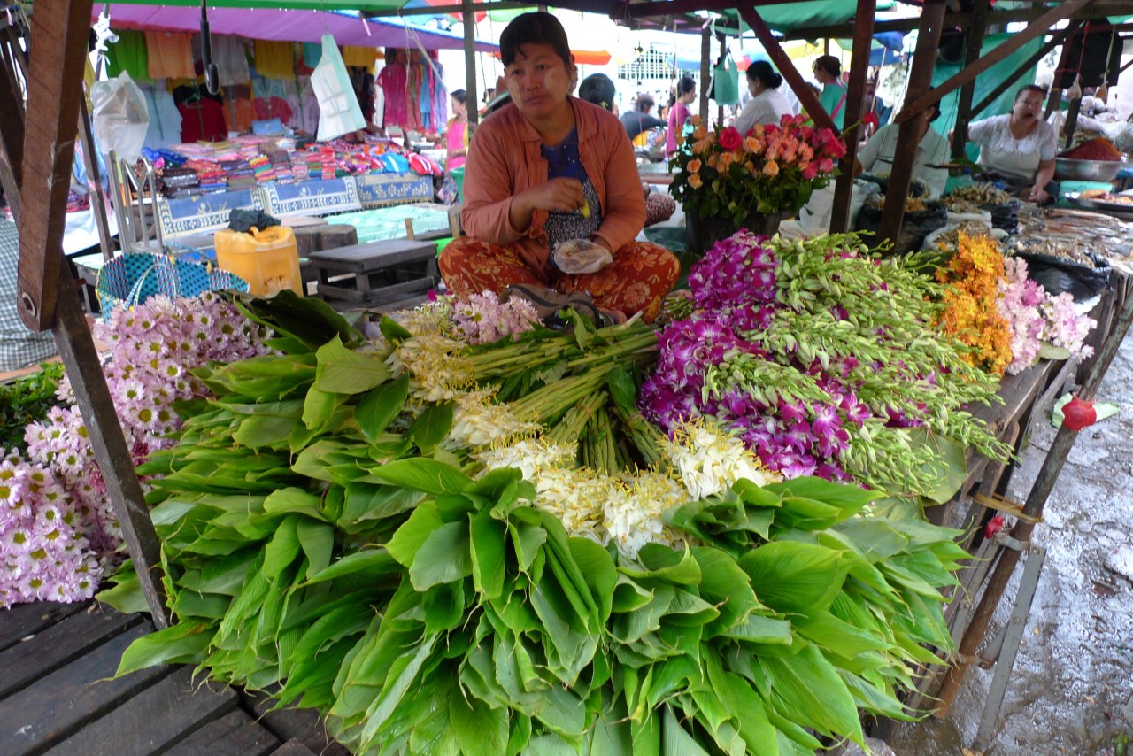 Se rendre sur un marché en Birmanie est un plaisir tant il y a de produits frais différents mais aussi comme un drugstore à ciel ouvert. On y trouve de tout : des produits frais (fruits, viande, poissons) ; des produits en tout genre sorte de supermarché (parapluies, sacs plastique tressés…)