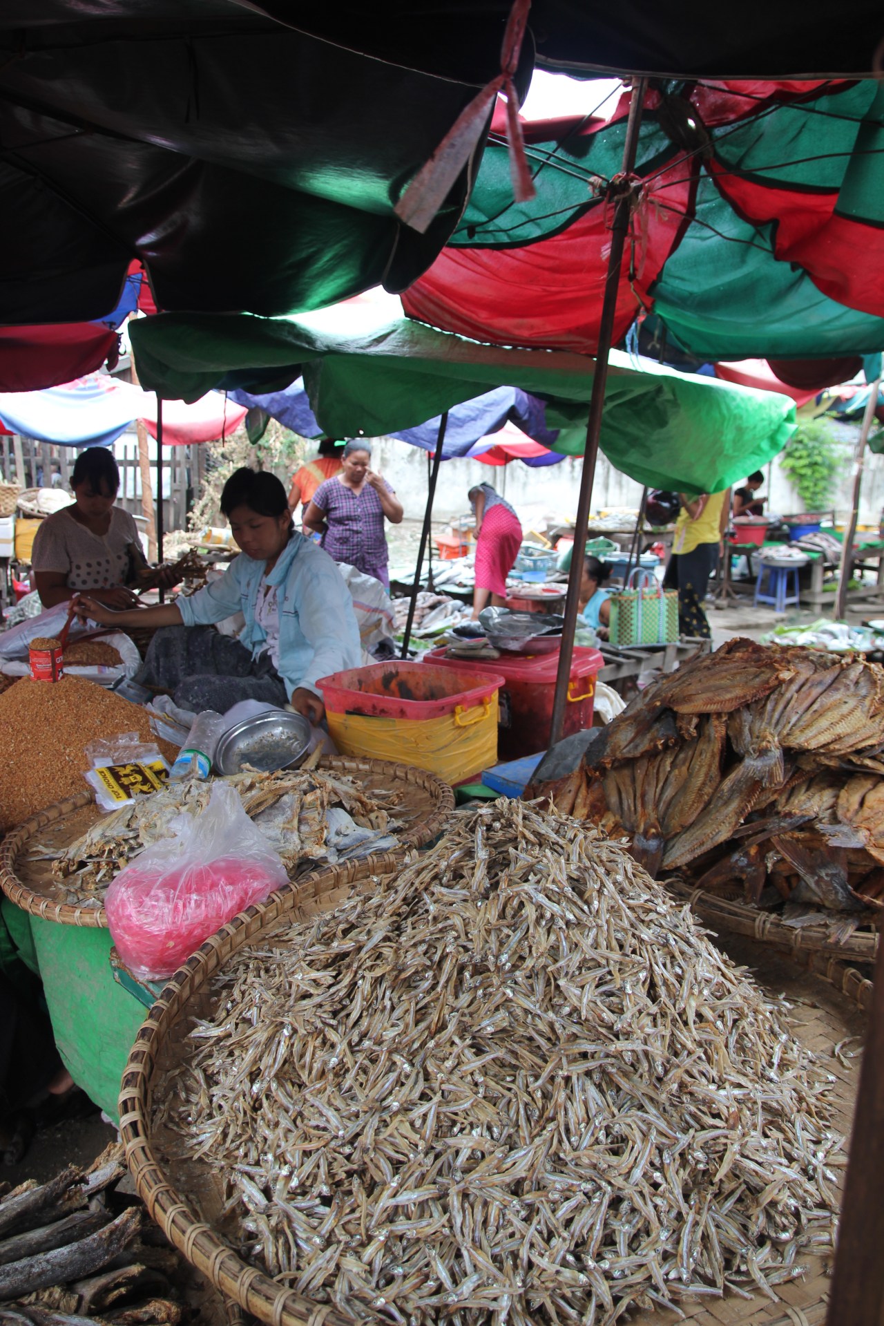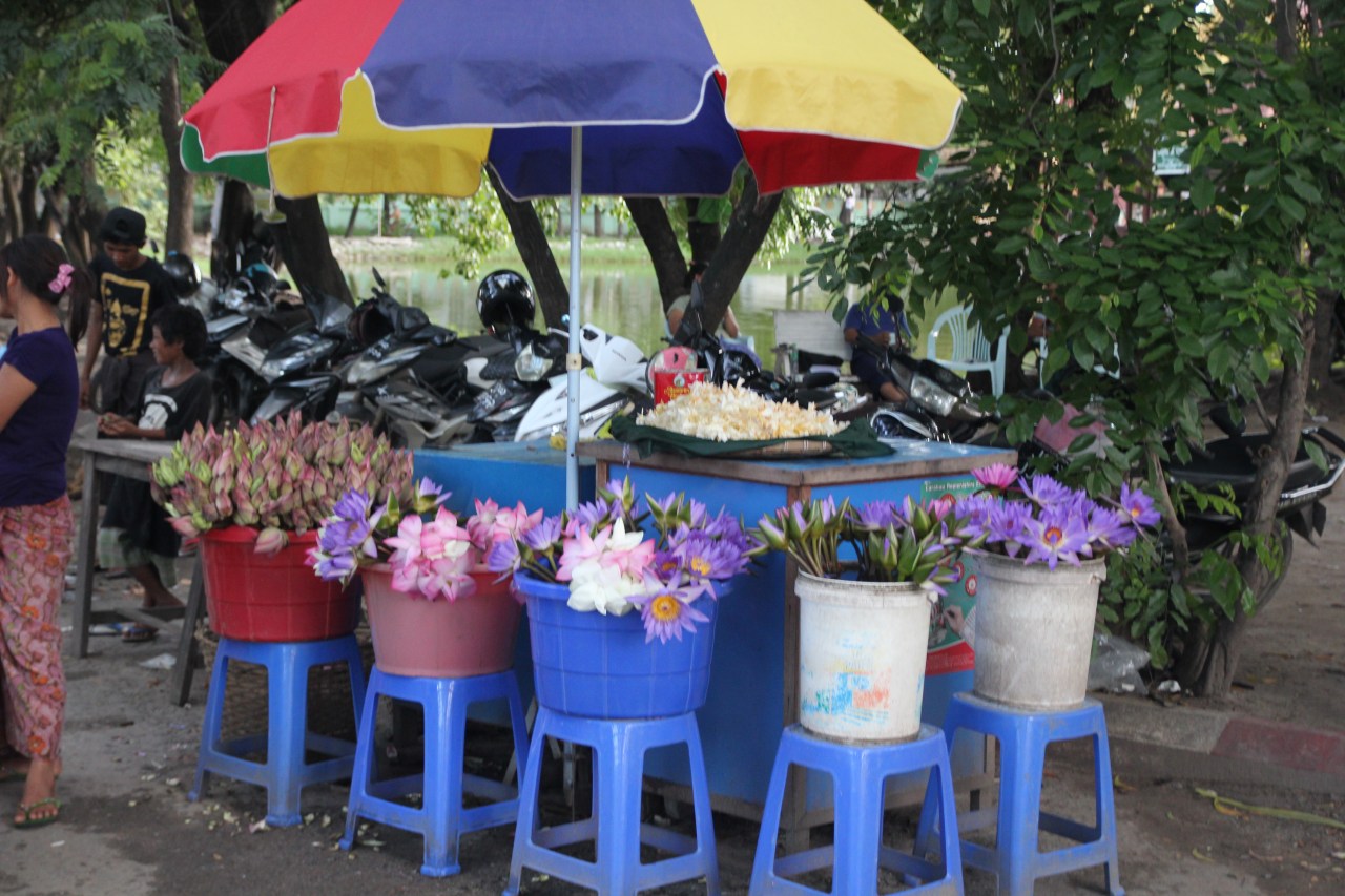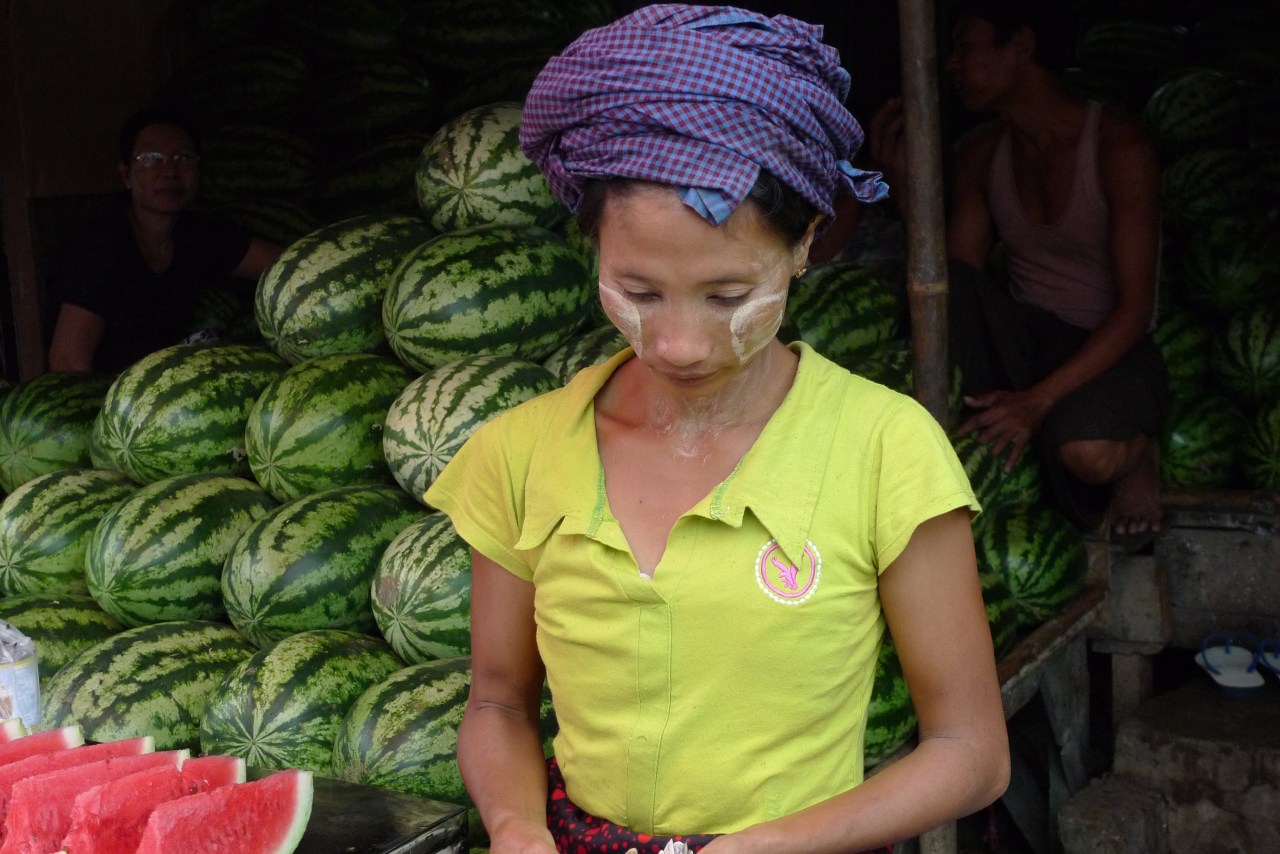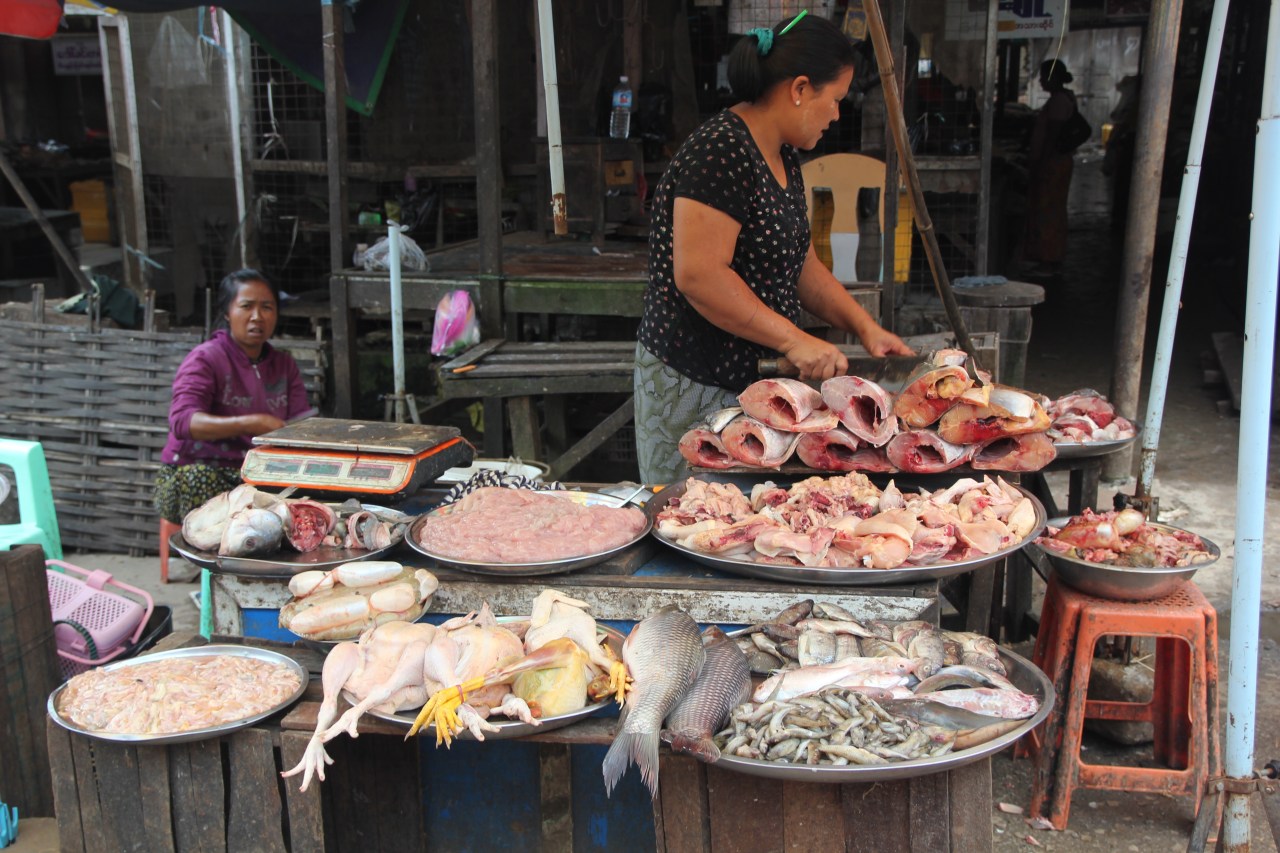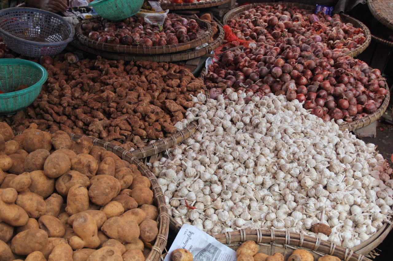 Se rendre sur un marché en Birmanie est un plaisir tant il y a de produits frais différents mais aussi comme un drugstore à ciel ouvert. On y trouve de tout : des produits frais (fruits, viande, poissons) ; des produits en tout genre sorte de supermarché (parapluies, sacs plastique tressés…)