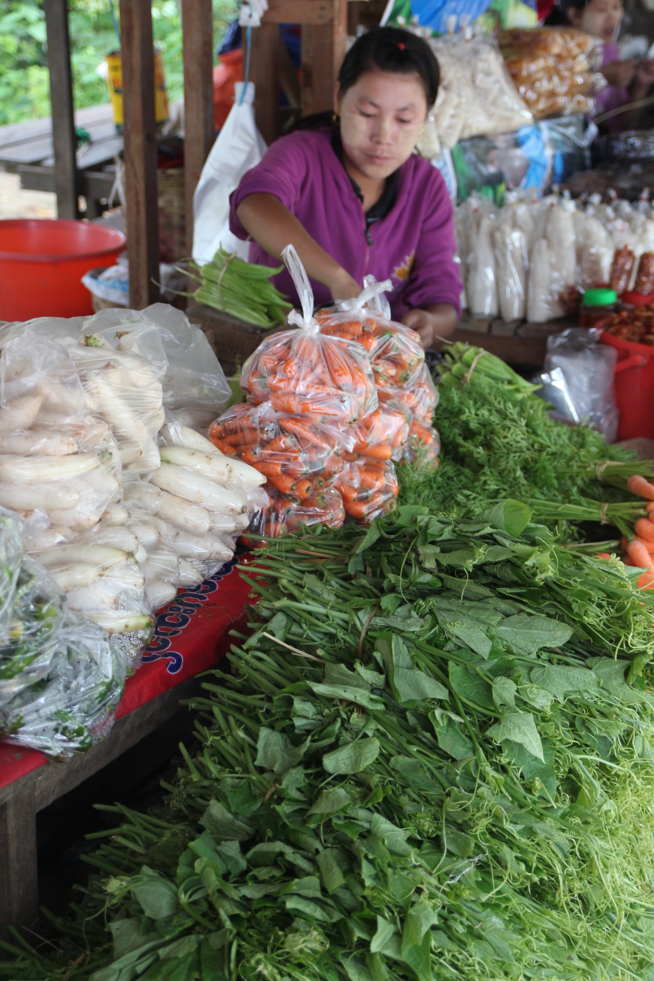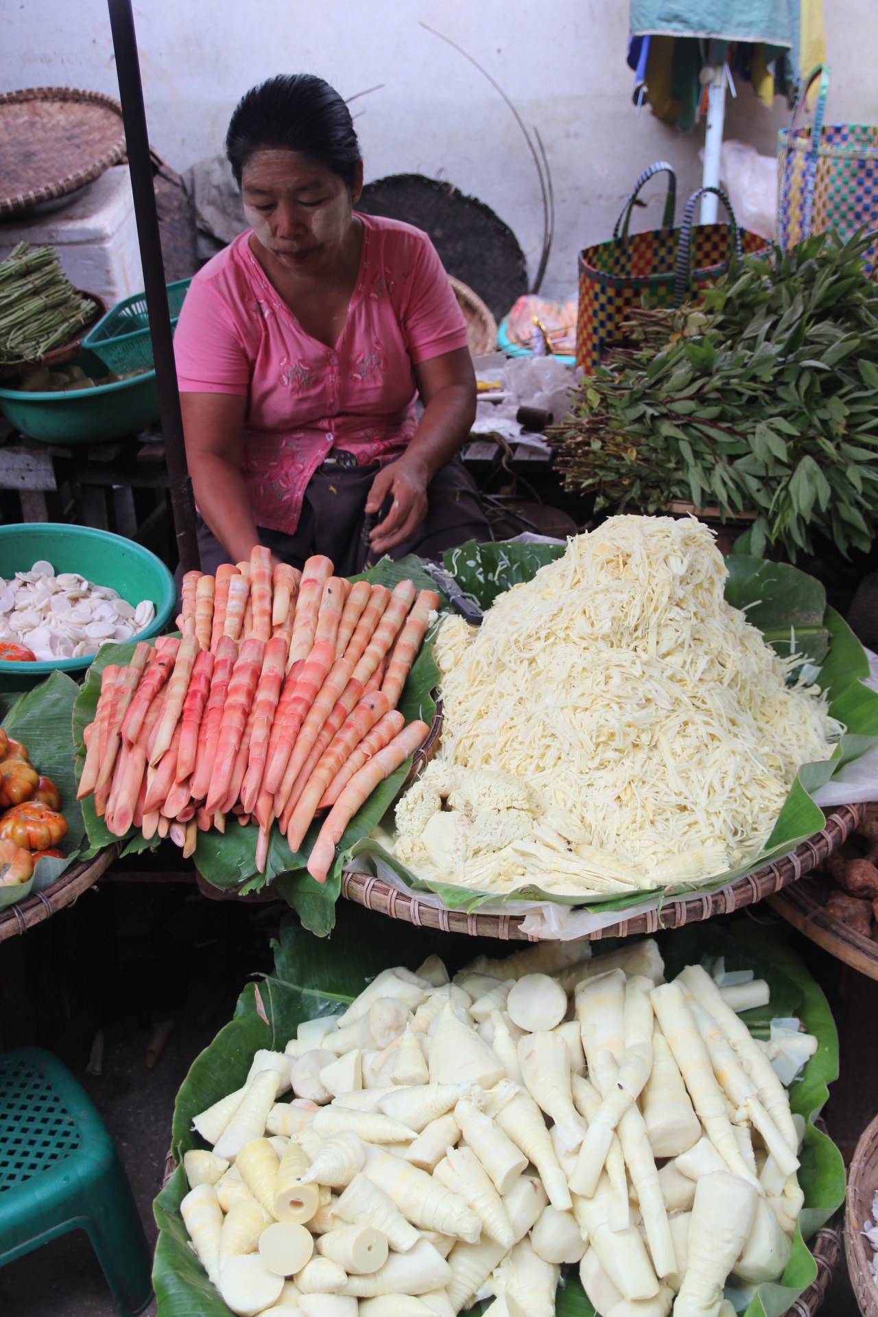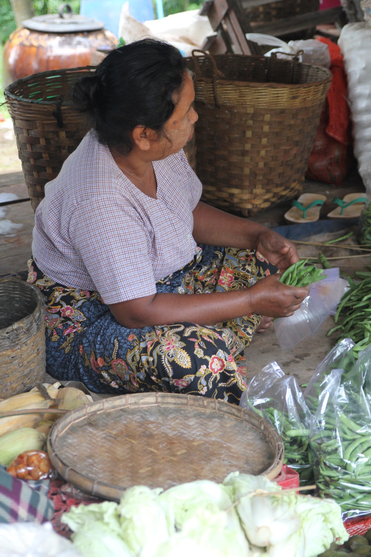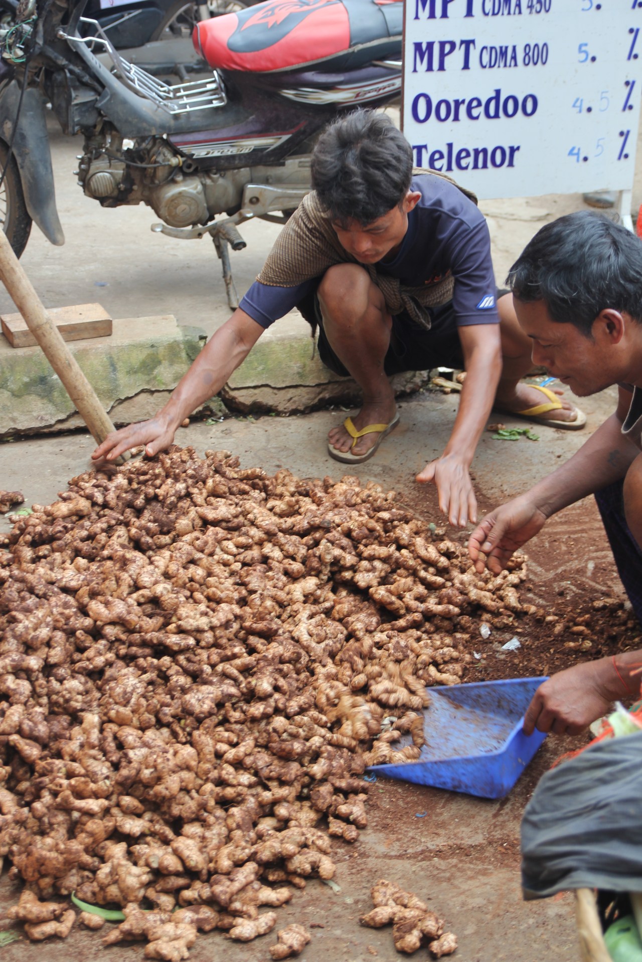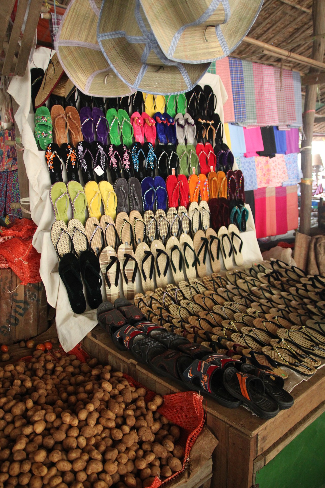 Se rendre sur un marché en Birmanie est un plaisir tant il y a de produits frais différents mais aussi comme un drugstore à ciel ouvert. On y trouve de tout : des produits frais (fruits, viande, poissons) ; des produits en tout genre sorte de supermarché (parapluies, sacs plastique tressés…)