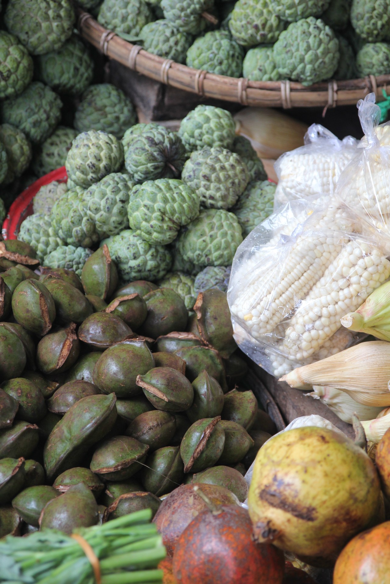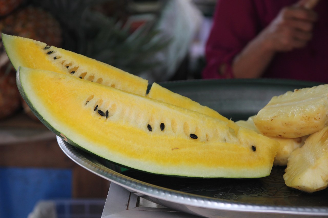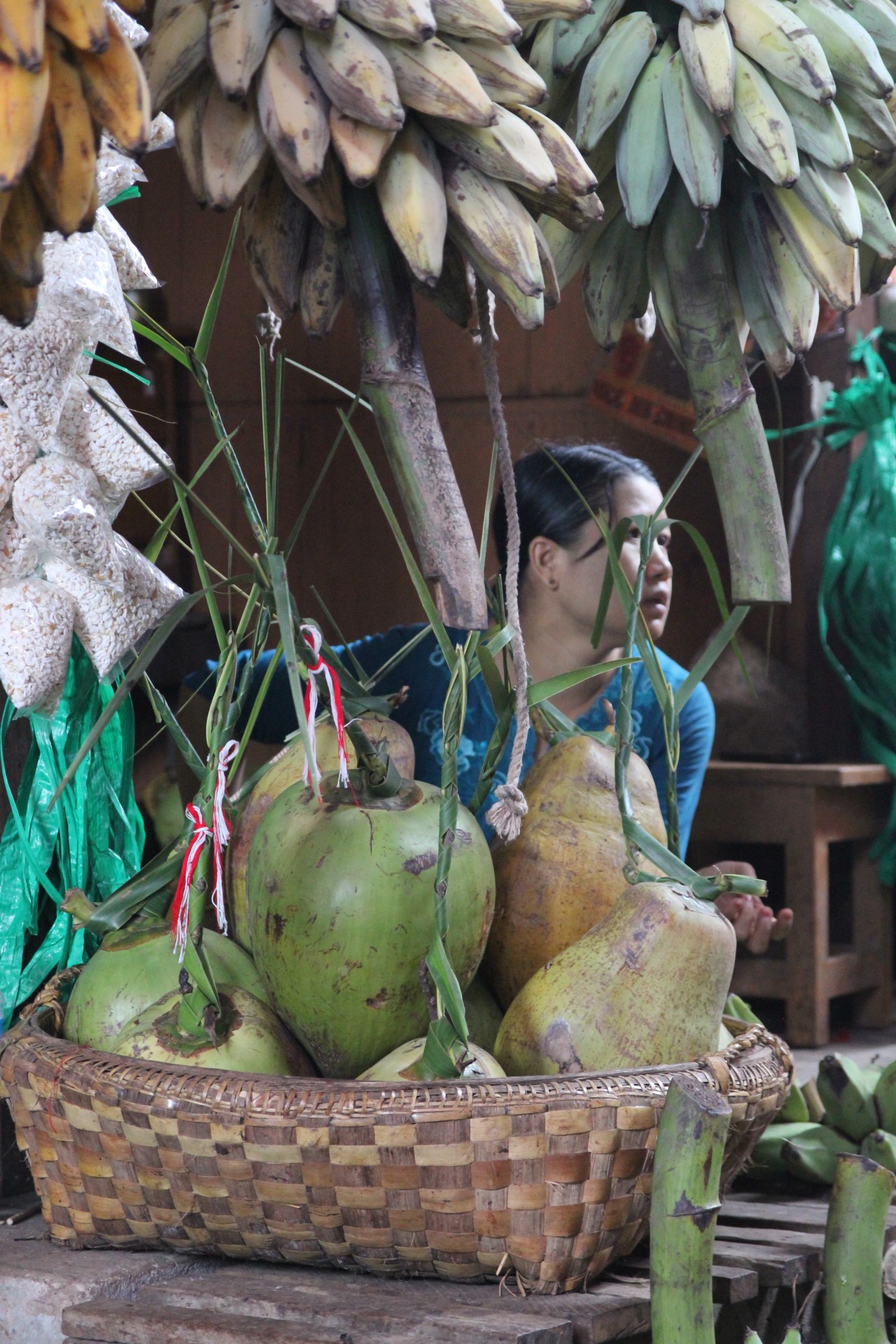 Le rayon des fruits : pastèques jaunes, des pieds de bananes minuscules au goût sucré qui fondent dans la bouche, des noix de coco dont on coupe la tête pour en absorber un jus sucré et rafraîchissant lorsqu’il fait très chaud et humide. Ces dernières sont posées si joliment sur des paniers en osier carrés qu’on n’ose pas y toucher. Et puis les ananas sur pieds posés dans des jattes d’osier ou bien à même le sol et dessinant une sorte de mur. Impressionnant le nombre d’ananas chez un revendeur. Les femmes coupent les fanes lorsqu’elles les ont vendues. On trouve aussi des sortes de prunes jaunes ou rouges dans des bassines en plastique – d’ailleurs pas sûre que cela soit des prunes à vrai dire mais cela y ressemble. J’ai découvert un fruit dont je ne sais pas le nom – sorte de soucoupe verte avec un noyau marron dedans. Et là où j’ai beaucoup ris c’est de voir des pommes vertes en forme de Bouddha ! Le nec plus ultra de la pomme !