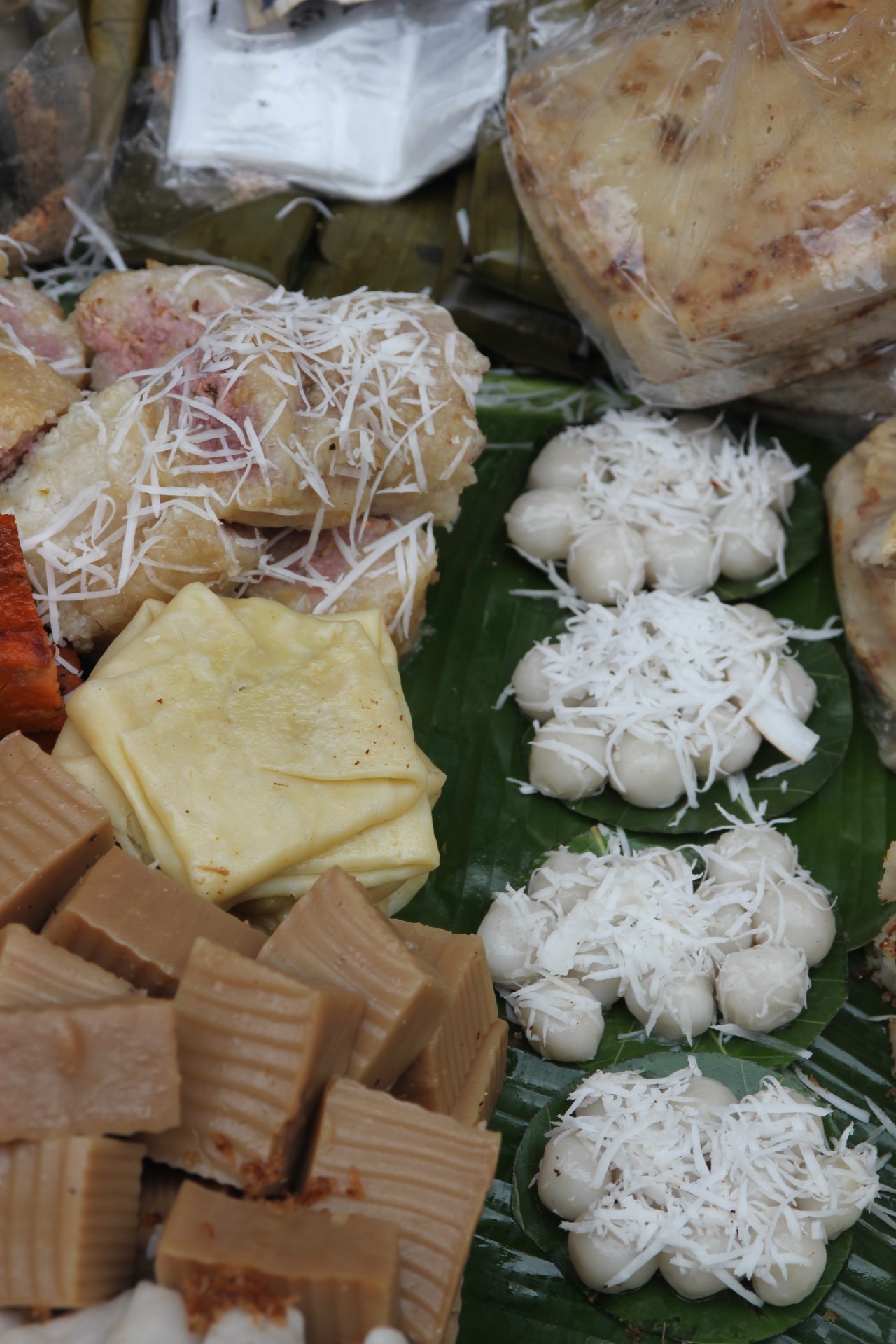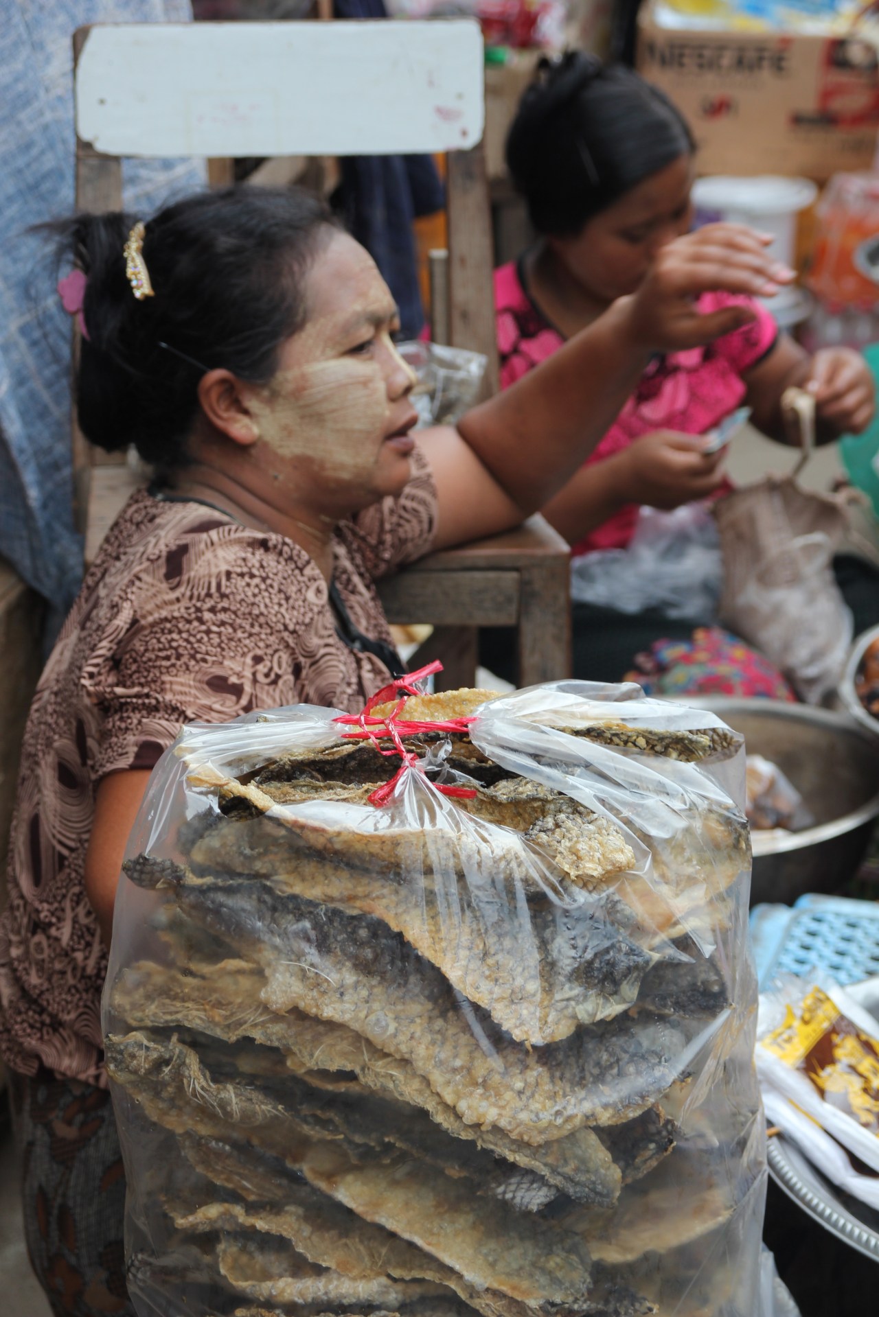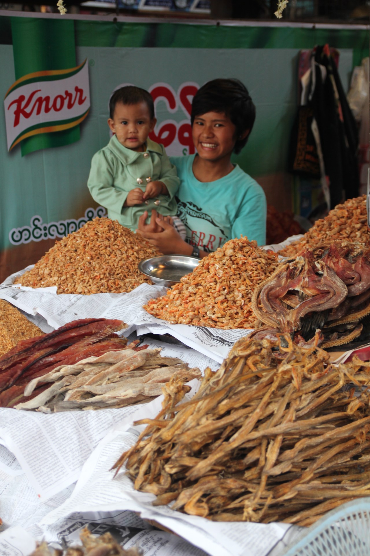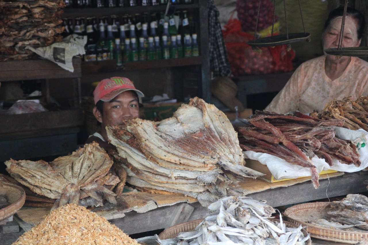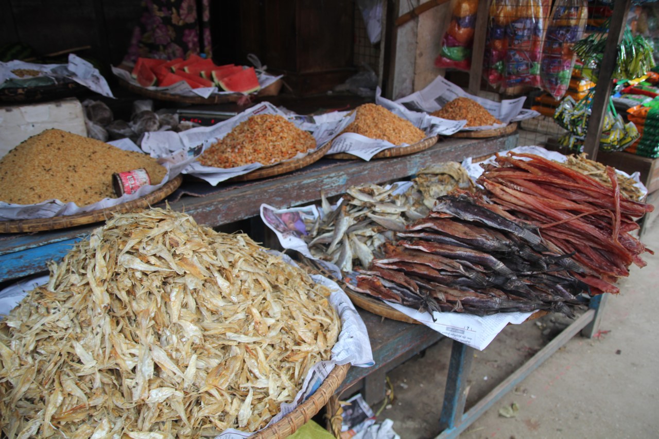 Les poissons séchés, enveloppés dans des sacs plastiques, qui fleurissent une odeur pestilentielle, pas forcément agréable à note odorat d’occidentaux. Mais aussi des montagnes de crevettes séchées ou de fritures. Ce n’est pas le coin que je préfère car l’odeur en est épouvantable. Malgré le fait que des tissus protègent les produits du soleil. Je ne sais pas comment ils peuvent rester des heures à renifler cette odeur et être à ras de la table pour sniffer.