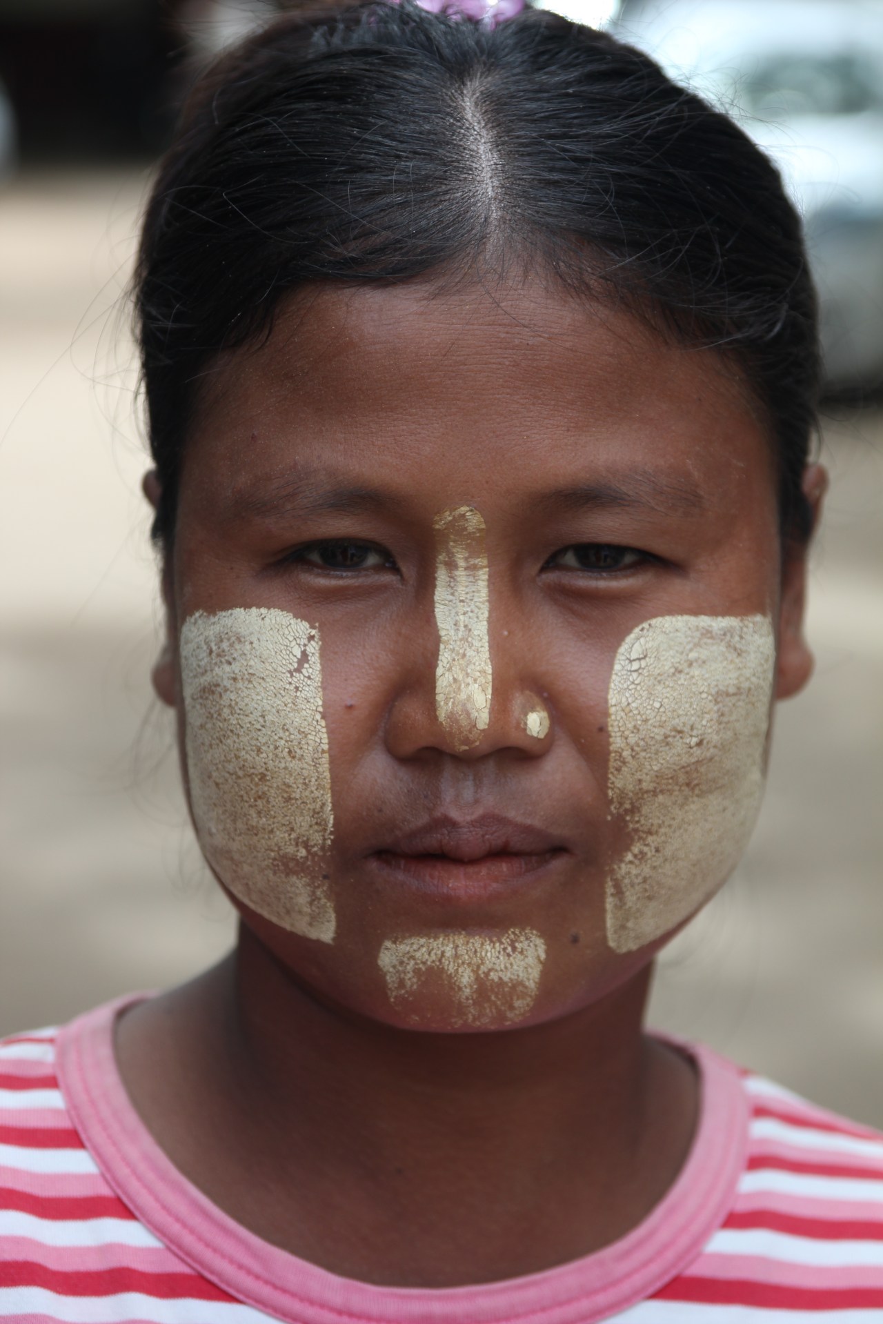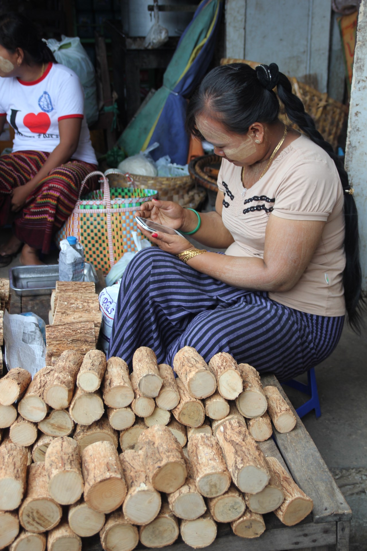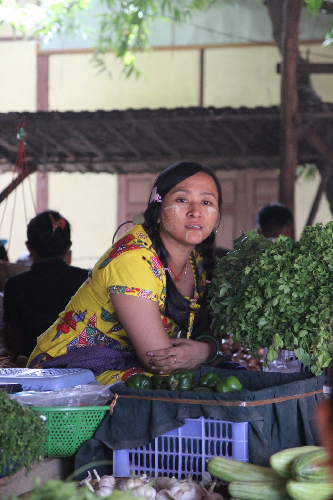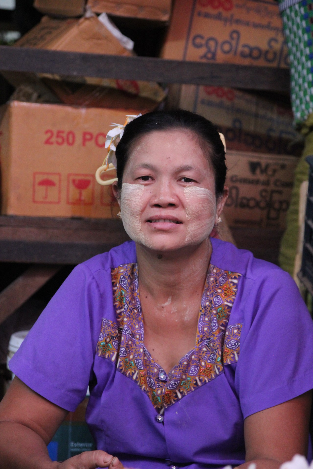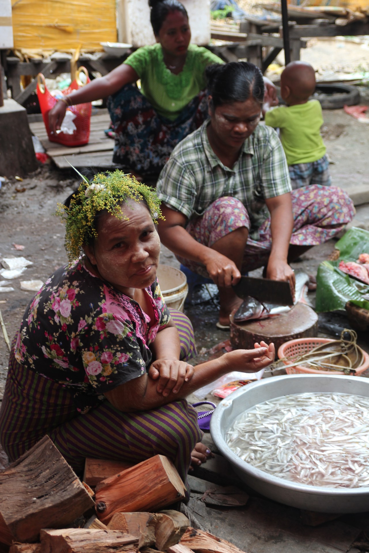 Et puis le spectacle, ce sont ces femmes, les vendeuses qui sont peintes et tartinées de crème de thanaka qui vous sourient et vous font goûter les produits pour en connaitre la saveur et la douceur. Elles ont souvent dans leurs cheveux des fleurs de jasmin accrochées aux pinces qui les retiennent ; ou bien des brins s’approchant du mimosa dont elles ornent leurs têtes ; d’autres ont les cheveux longs laissés en liberté. Elles jouent avec leurs enfants sur les genoux. Des moments de fraîcheur dans cette atmosphère si particulière. De la douceur dans un monde parfois difficile.