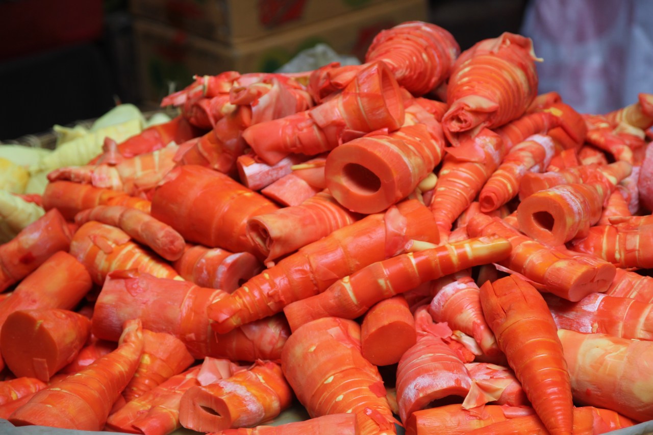 Parfois on découvre du mais blanc effeuillé ou non à côté de mangues et de mangoustans. Et puis le rayon des herbes fraiches – herbes en tout genre qui ravit mes yeux car je découvre toujours des produits, des odeurs inconnues. On y retrouve aussi les choux fleurs, les salades, les choix chinois ou les radis blancs. Les pates sont extraordinaires, toutes disposées dans des bacs plastiques on en trouve de toutes formes, de couleurs jaunes, violette, des mélanges de couleurs… un vrai miracle !