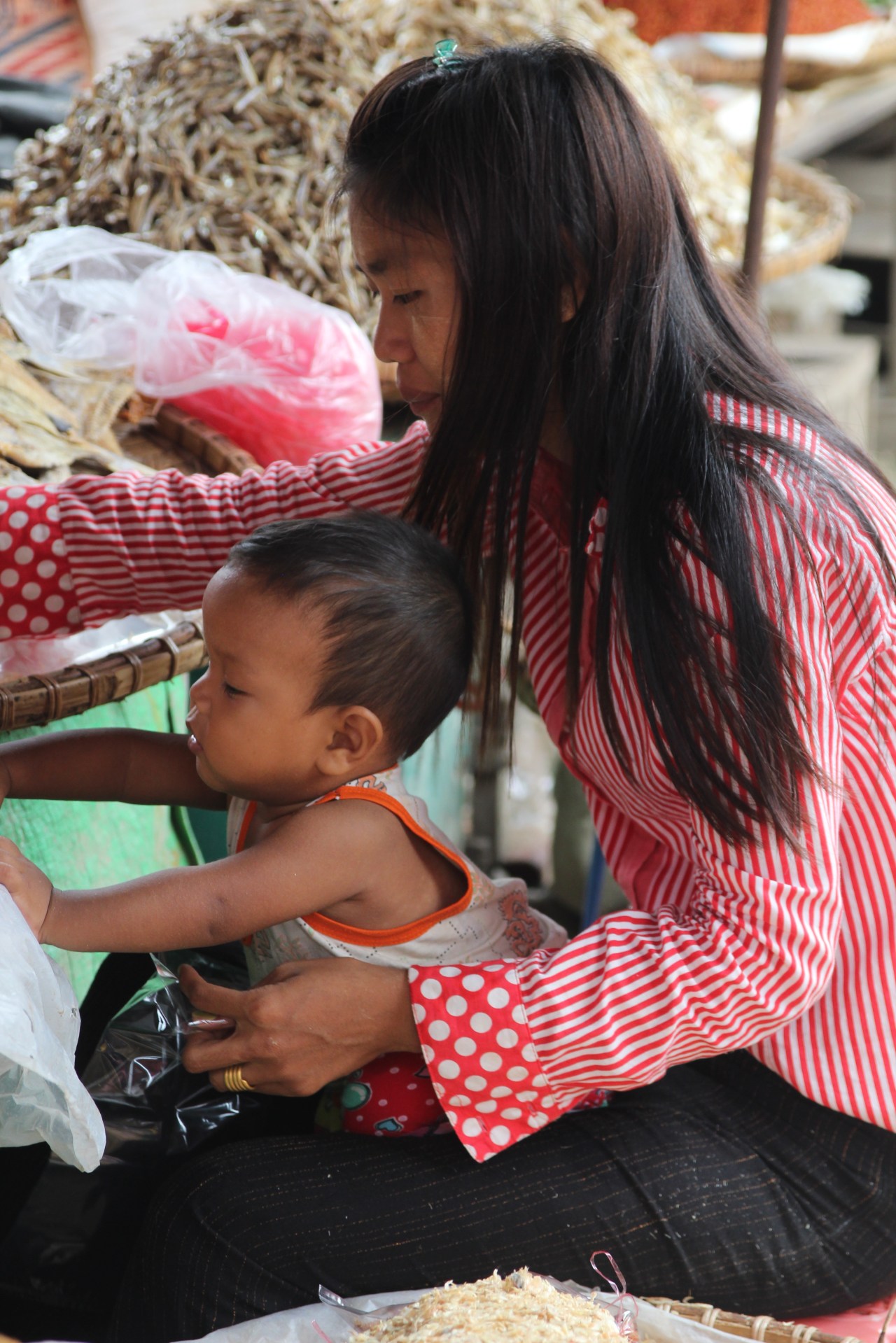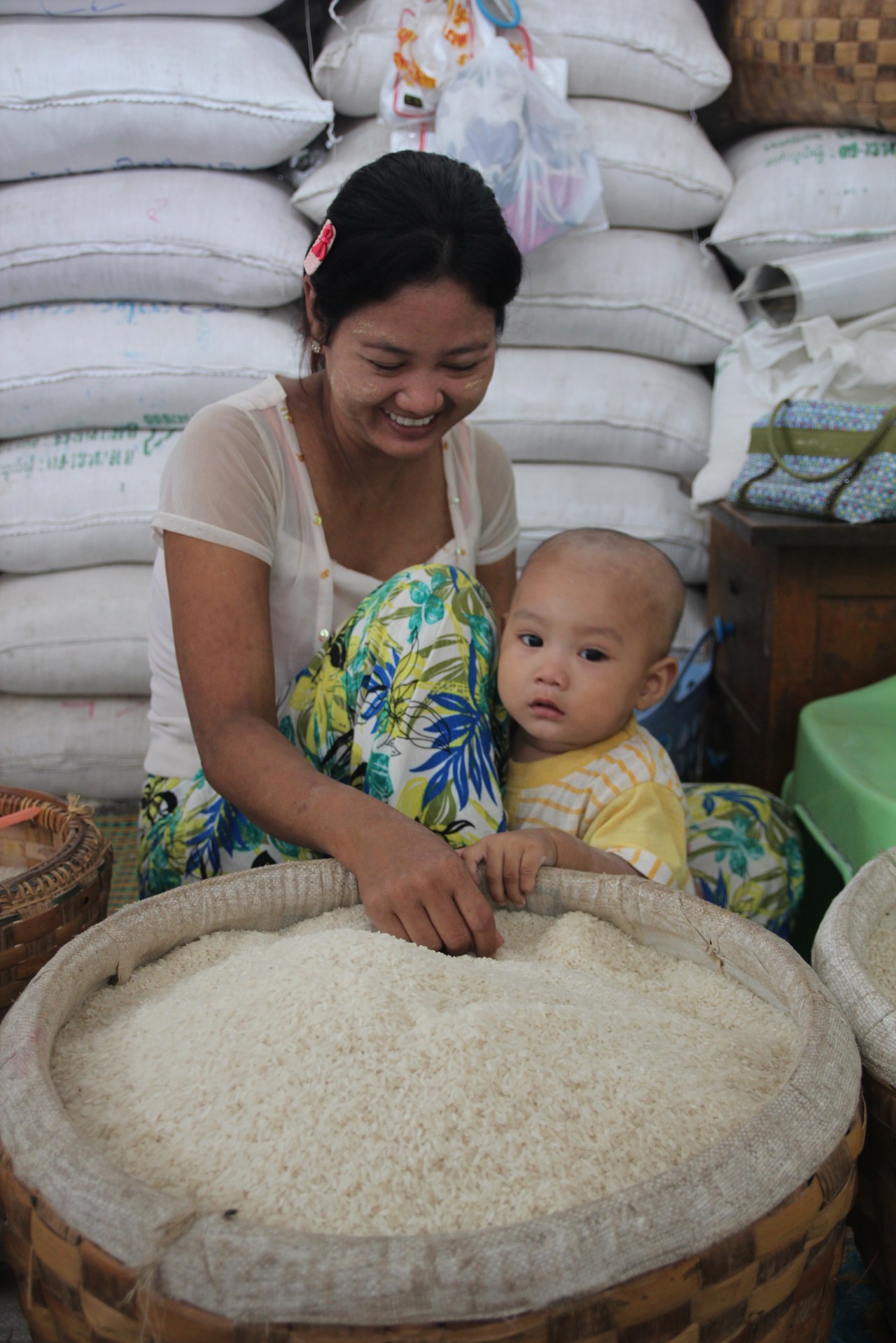 Un moment de douceur quand la maman qui a son enfant à côté d’elle nettoie le riz pour qu’il soit blanc de blanc. Derrière elle des tonnes de riz dans des sachets en fibre.