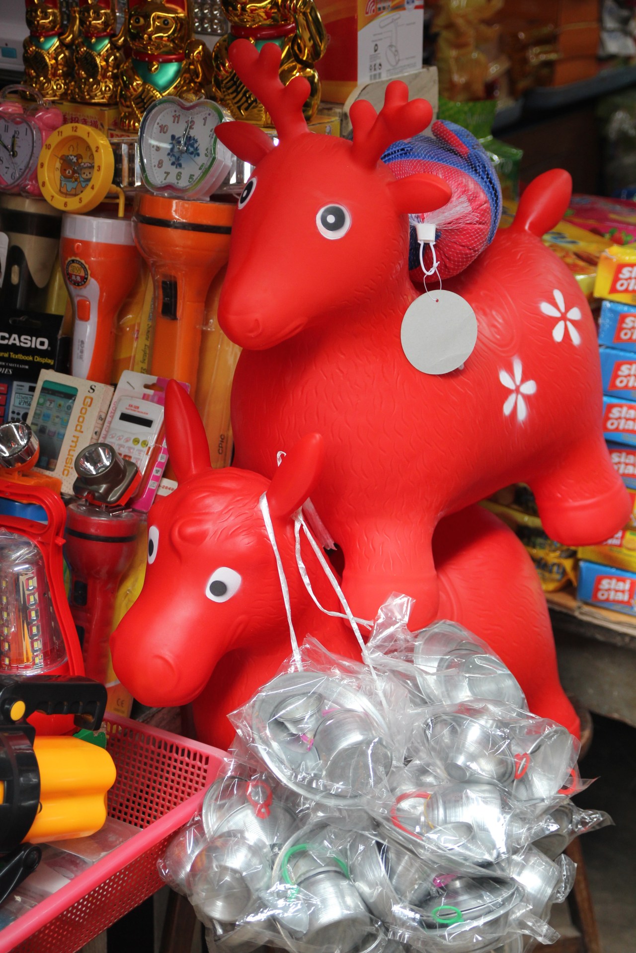 Et puis il y a les rayons où l’on trouve les habits, les paniers, les jouets les plus kitsch pour les enfants …. Et le rayon des tongues toutes posées et mises de façon linéaire. Un peu comme les nonnes qui rangent leurs tongues en rang serrés et bien droits où rien ne dépasse.