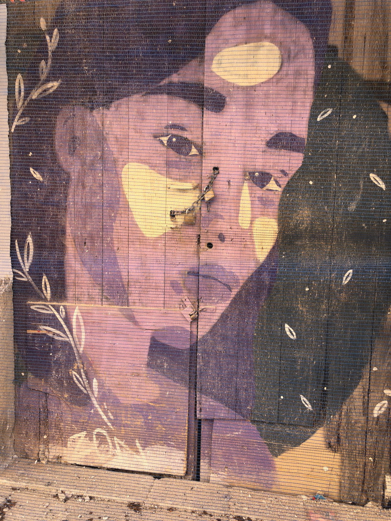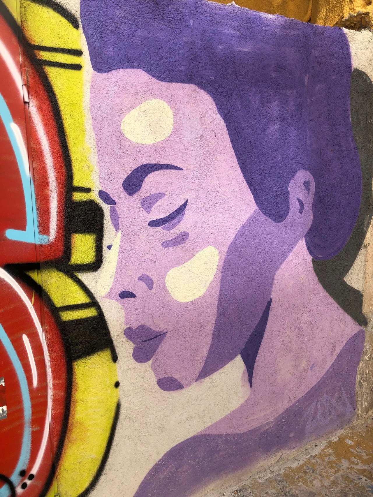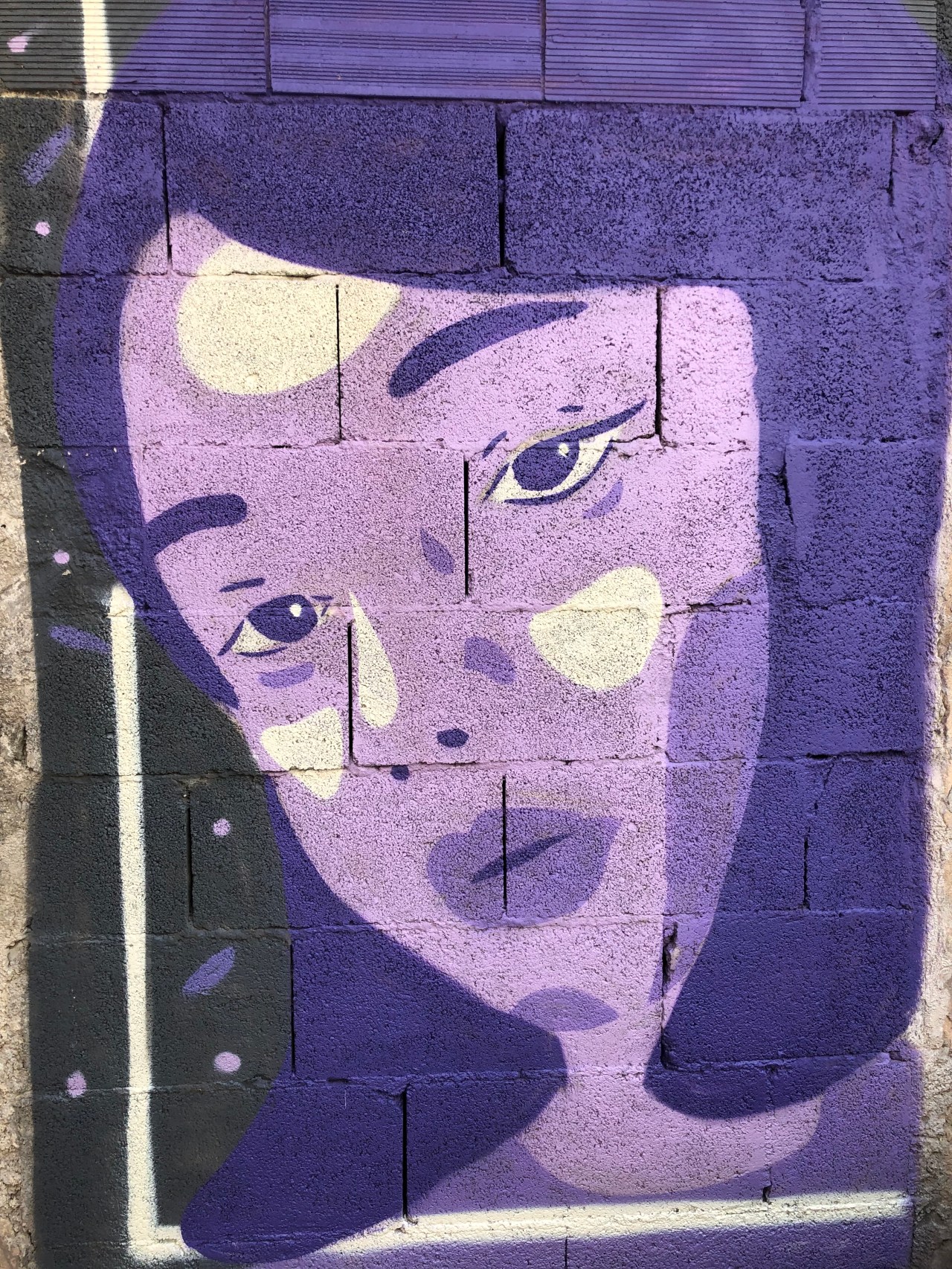 Ce visage mauve, si tendre de cette femme qui porte des stigmates jaunes sur les pommettes de ces joues, signé du nom l’artiste de Zon. Je retrouverais au détour d’une rue, plus loin, ce visage mauve aux pommettes jaunes qui recouvre un mur sur toute sa hauteur. Les lèvres de cette femme sont mauves et surtout elles donnent envie des les sucer, de les bécoter et de les aspirer dans un tendre baiser. Et je la retrouverais une troisième fois au détour d’une autre rue de face cette fois-ci, toujours avec ses pommettes jaunes et sa masse de cheveux coupés au carré. Une signature du même auteur je suppose, reconnaissable aux couleurs et au visage qu’il peint.