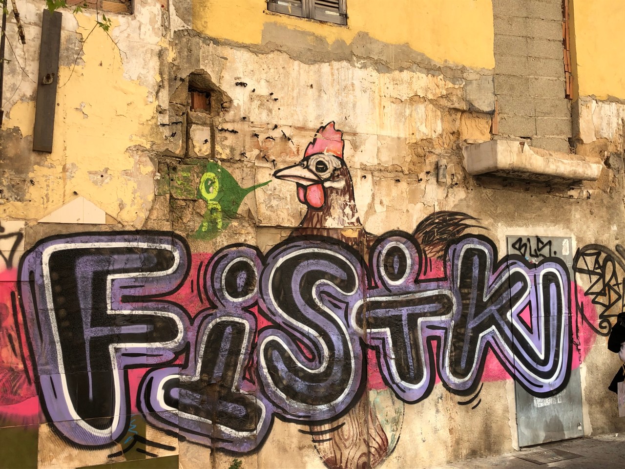 Plus loin on croise sur un mur un coq qui a dû lancer une parole ou un cocorico dont on ne voit plus l’énoncé et qui est assis sous un nom Fistki.
