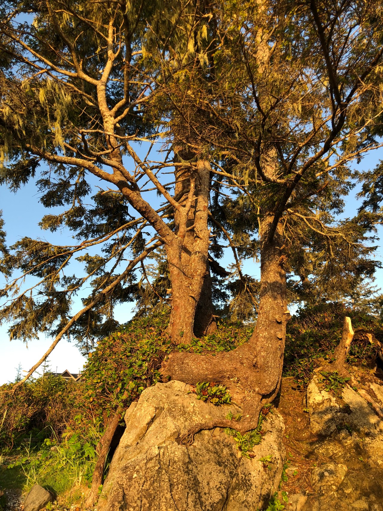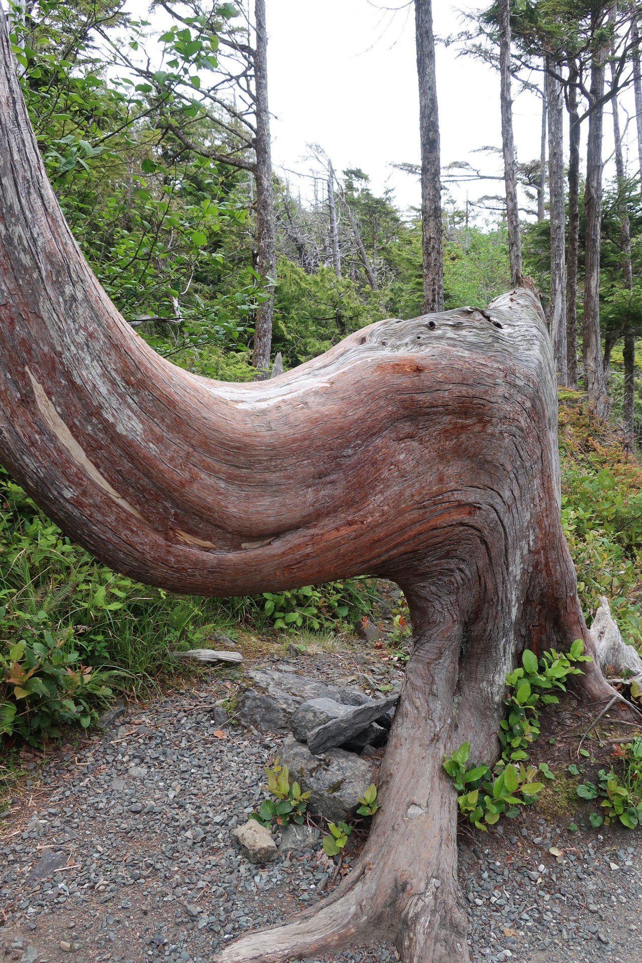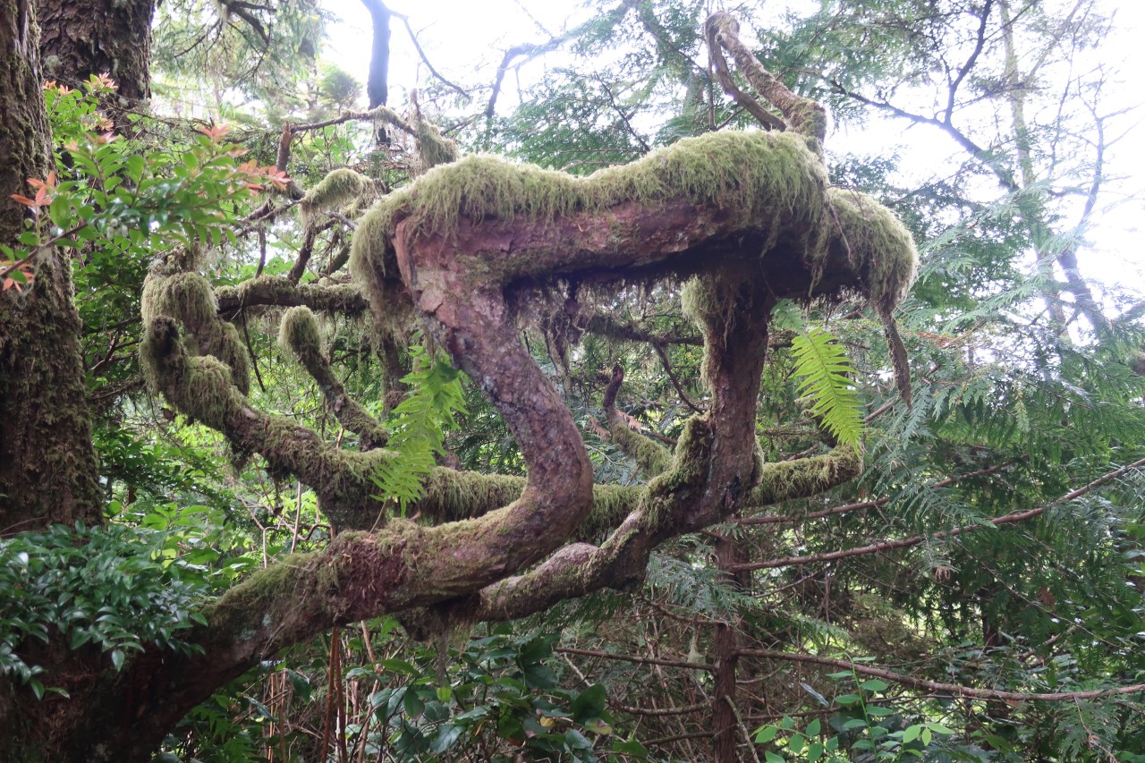 Le lendemain j’ai repris le chemin le long de la côte me dirigeant vers Tofino. Et là la nature et les arbres étaient encore plus étranges. Droits comme des « i », les pins étaient accrochés à la roche ; des cèdres, arbres immenses de la forêt pluviale, s’élancent vers le ciel avec leurs plumeaux en guise de feuillage. On dirait des têtes échevelées qui vous regardent et vous toisent de leur hauteur. On retrouve aussi les lichens qui font des doigts crochus cherchant à vous toucher ou vous happer. Des grandes plantes grasses au vert printemps se cachent souvent sous les racines des arbres et des espèces de mini pins verts de vingt centimètres de hauteur – sorte de plante grasse – parsèment le chemin. A eux seuls on dirait avoir affaire à une forêt miniature vert pomme. Comme dans Cathedral Grove beaucoup d’arbres sont couchés, d’autres ont le tronc déformé comme une vague en forme d’autruche au cou tordu, immense, élancé vers le ciel. Impressionnant comme la nature peut se déformer et s’adapter. D’autres ont formé des excroissances qui forment une sorte de nid pour aigle – hélas bien trop bas pour les abriter, le tout recouvert d’une mousse verte qui pend. On pourrait presque s’y coucher ou bien s’en faire un nid douillet ou une balançoire statique.
