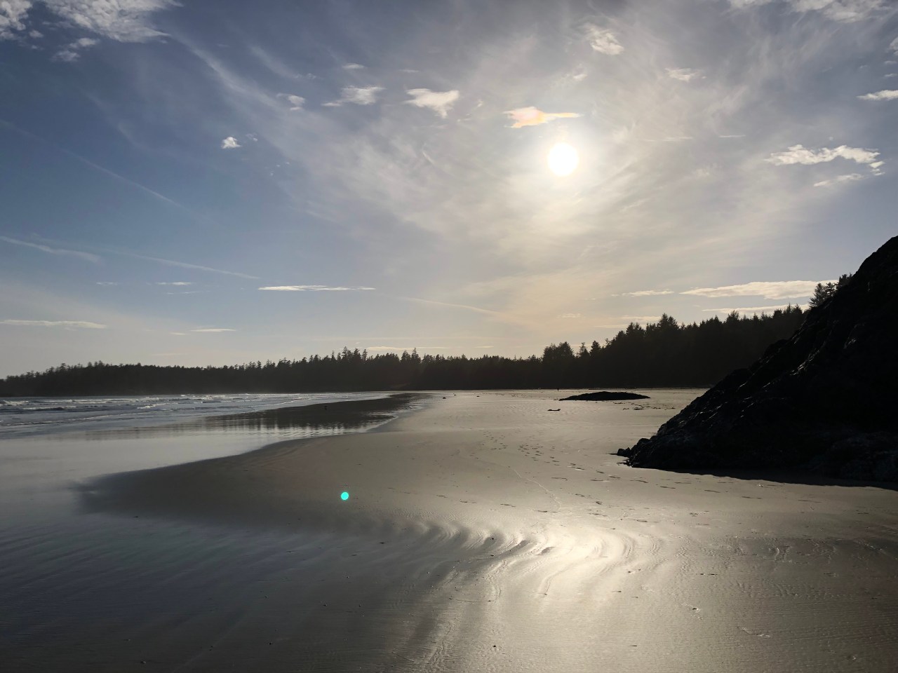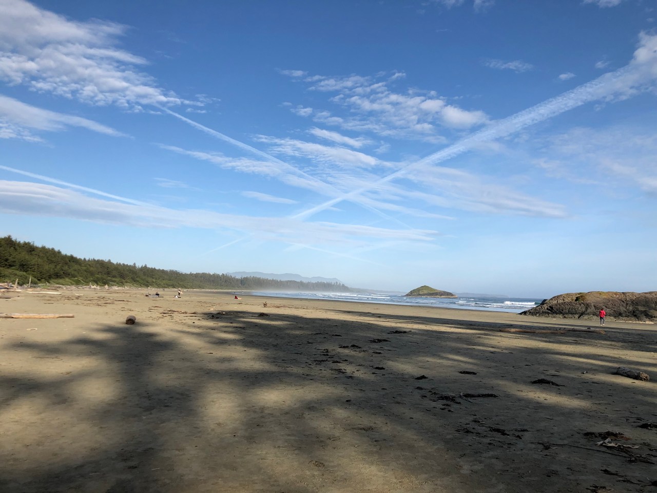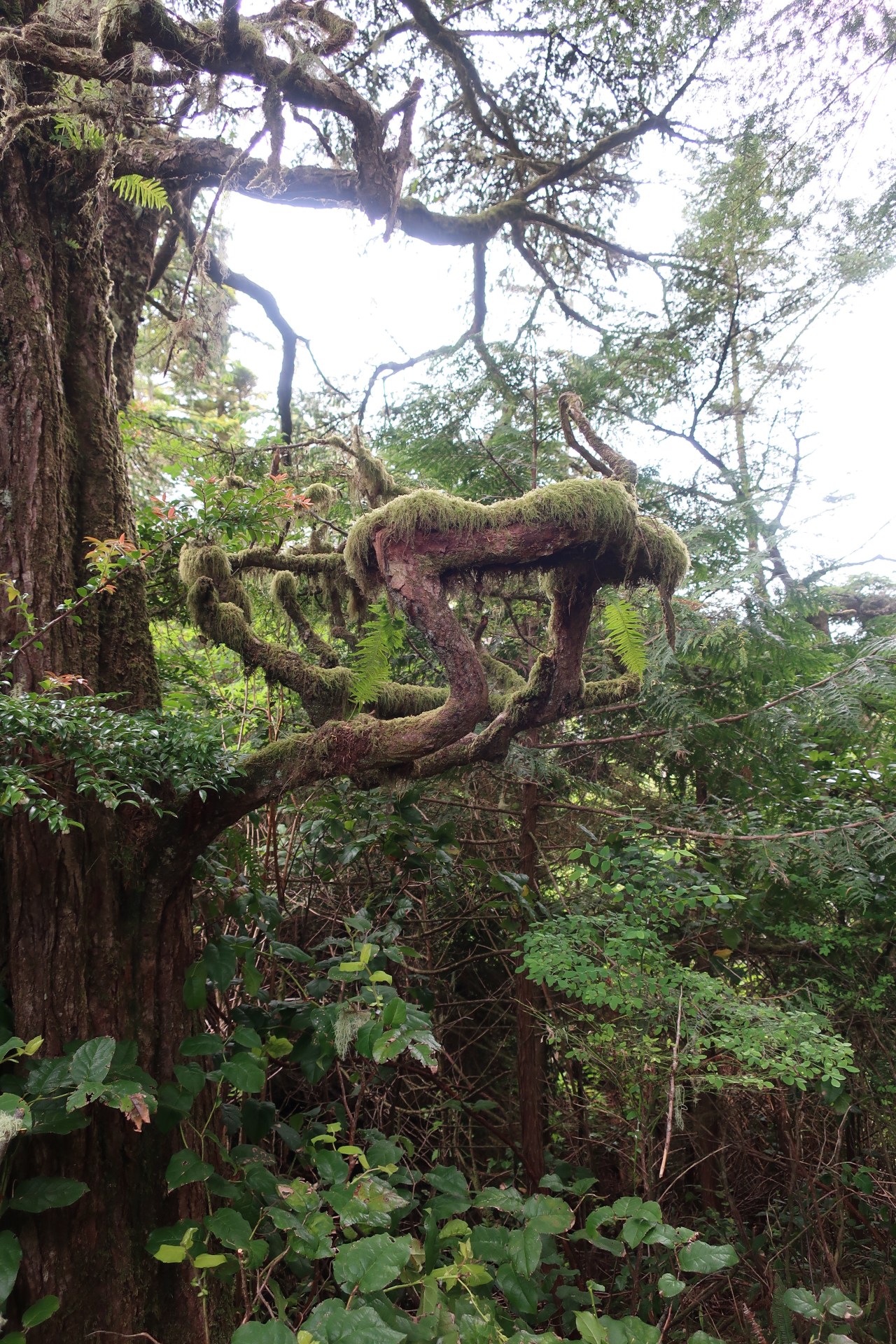 Le lendemain j’ai repris le chemin le long de la côte me dirigeant vers Tofino. Et là la nature et les arbres étaient encore plus étranges. Droits comme des « i », les pins étaient accrochés à la roche ; des cèdres, arbres immenses de la forêt pluviale, s’élancent vers le ciel avec leurs plumeaux en guise de feuillage. On dirait des têtes échevelées qui vous regardent et vous toisent de leur hauteur. On retrouve aussi les lichens qui font des doigts crochus cherchant à vous toucher ou vous happer. Des grandes plantes grasses au vert printemps se cachent souvent sous les racines des arbres et des espèces de mini pins verts de vingt centimètres de hauteur – sorte de plante grasse – parsèment le chemin. A eux seuls on dirait avoir affaire à une forêt miniature vert pomme. Comme dans Cathedral Grove beaucoup d’arbres sont couchés, d’autres ont le tronc déformé comme une vague en forme d’autruche au cou tordu, immense, élancé vers le ciel. Impressionnant comme la nature peut se déformer et s’adapter. D’autres ont formé des excroissances qui forment une sorte de nid pour aigle – hélas bien trop bas pour les abriter, le tout recouvert d’une mousse verte qui pend. On pourrait presque s’y coucher ou bien s’en faire un nid douillet ou une balançoire statique.