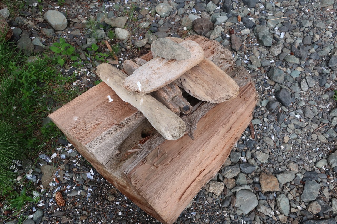 Tout au long du chemin lui-même tortueux des passants ont créé des cairns en bois où chacun vient ajouter sa pierre ou son galet, à l’édifice branlant et risquant de tomber à tout moment et à chaque rage du vent. Ainsi l’homme laisse son empreinte spirituelle.