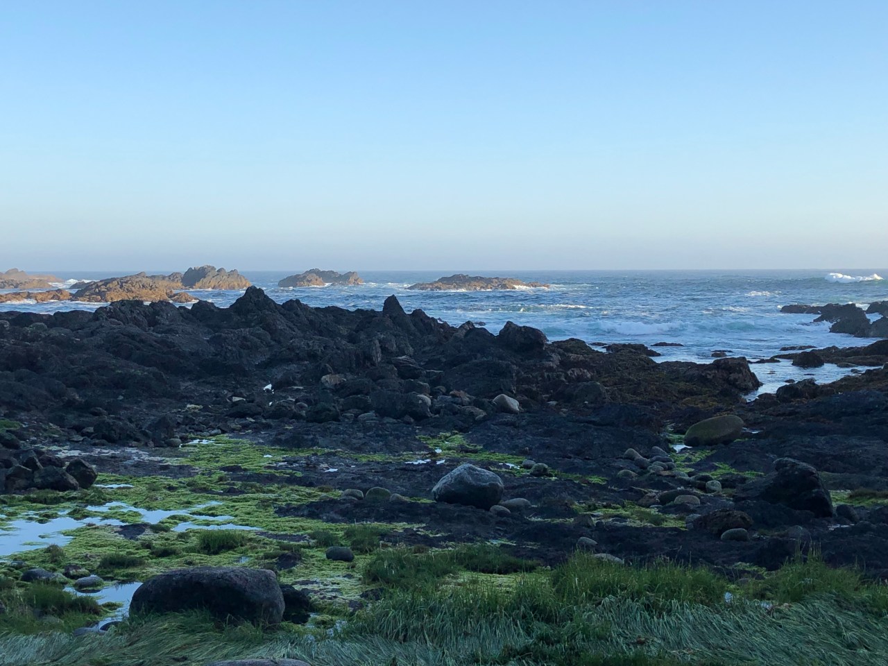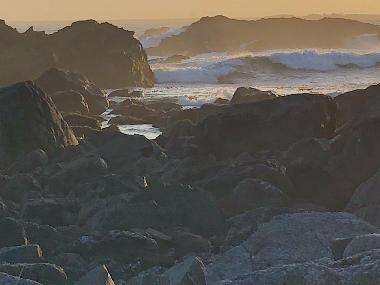Les vagues, lorsque la marée monte, tapent les roches, se fracassent dessus, font des bonds de dix mètres et crachent une écume qui envahit tout. Le bruit des vagues est effrayant par moment et le vacarme recouvre toute vie. Les vagues se transforment en rouleaux tant aimés des surfeurs qui peuvent se glisser entre. On dirait que la tempête est permanente et transforme la nature, la modèle et modélise à coup de lampées d’eau. Elle arrache des cris de douleur des rochers et travaille la côte à son gré et fantaisies.