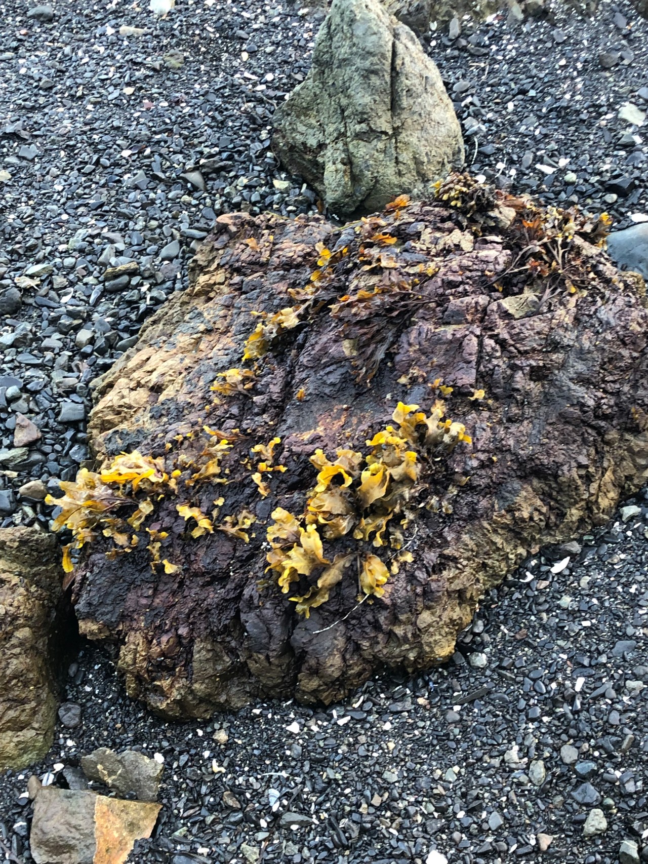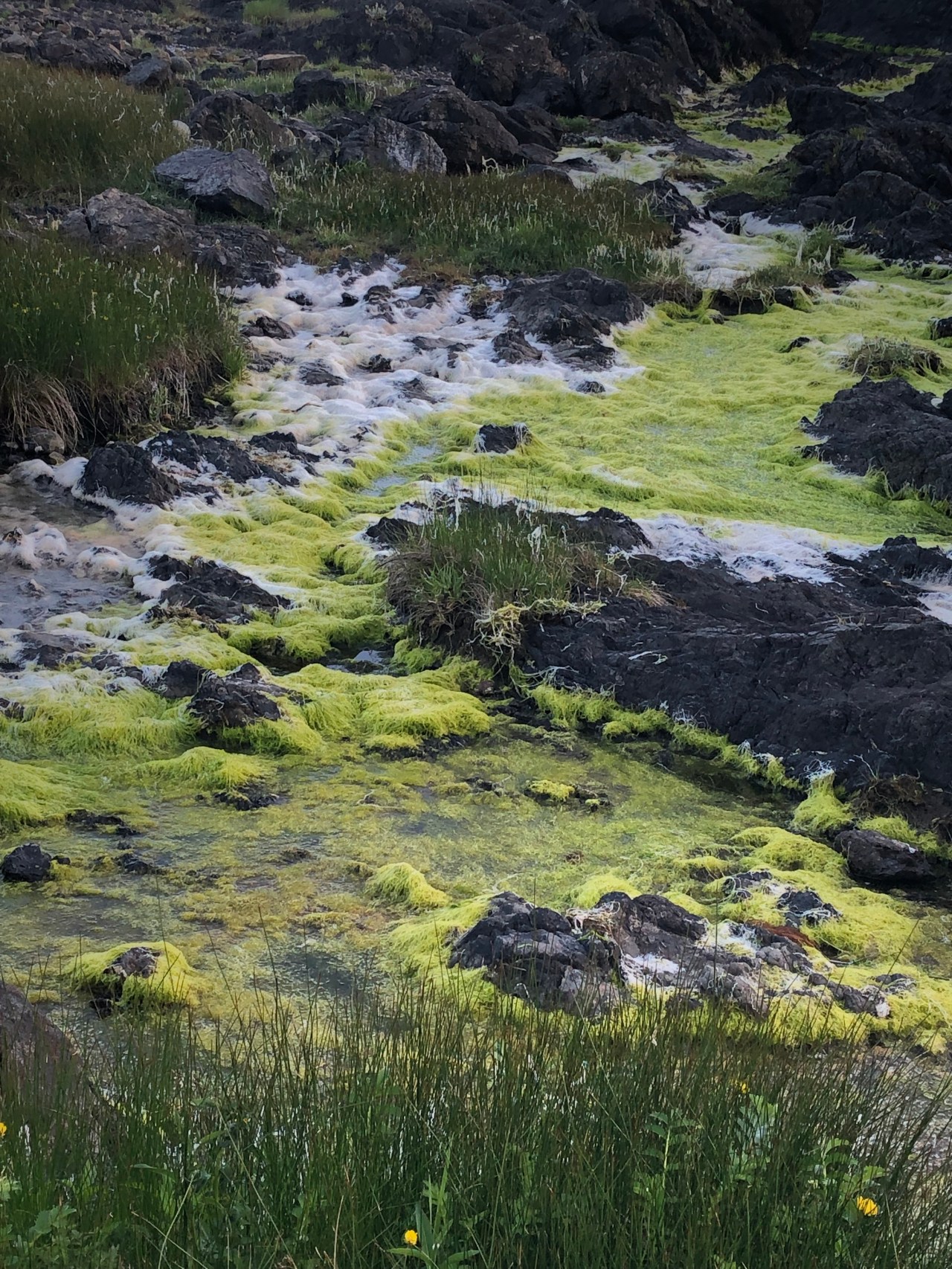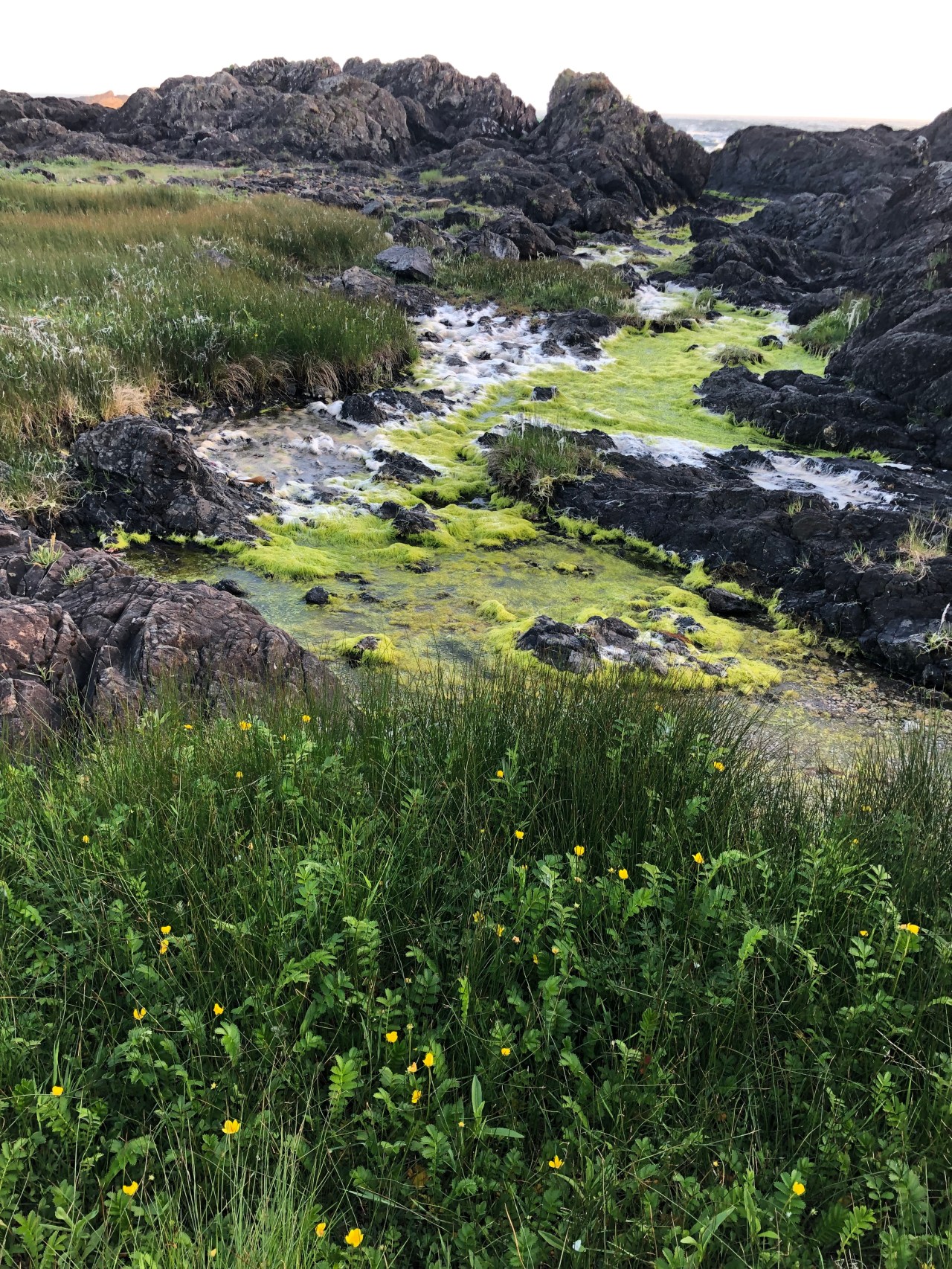 Lorsque l’on rejoint la plage rocheuse de l’hôtel Black Rock Resort, on découvre à marée basse tout un écosystème impressionnant de beauté. Les mousses vertes tapissent les pourtours des rochers – juste le reflet des algues vertes recouvrant le sol et parfois des herbes folles, vertes, un peu grasses se relèvent pour respirer et batifoler. Les rochers se font pointus et menaçants pour nos pauvres pieds. Les fleurs poussent le long de la côte. Elles ont des pistils au contour jaune arrondi sur des pétales rouges. La tige est fine et brinquebalent dans les tous sens que le vent imprime. Je n’avais jamais vu d’aussi ravissantes fleurs si bien dessinées, si colorées et d’une pureté édifiante. Les iris jaunes étaient parsemées un peu partout, plantés dans les herbes grasses, rendant le paysage tout jaune et printanier. Leur cœur était tout ouvert et on distinguait bien les pistils complètement offerts au ciel. La côte offrait un paysage verdoyant empli de vase verdâtre encerclé de sel – dépôt de la mer séchant au soleil et à l’air. De grandes herbes avec des boutons d’or remuaient au gré du vent et de la folie des alizées. On aurait dit un spectacle lunaire contrastant avec le noir volcanique des roches. Par ci par là des algues accrochées aux roches se détachaient et apparaissaient sur notre chemin. Là aussi les couleurs contrastaient avec le reste entre le marron, le jaune ou le rouge. Certaines dessinaient comme des pustules aux bouts jaunâtres et donnaient l’impression d’une peinture à ciel ouvert.