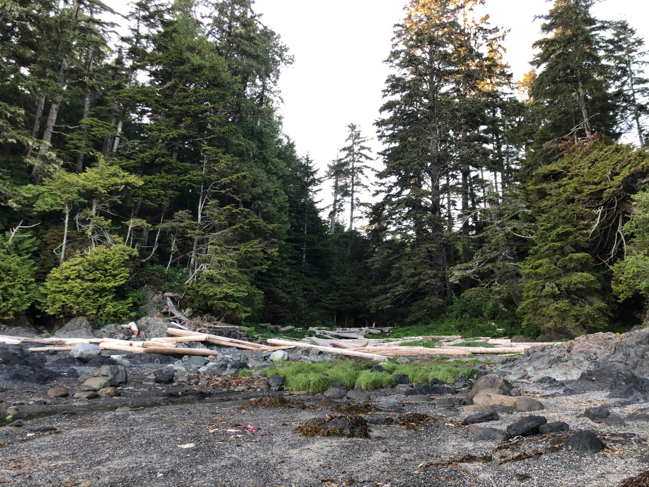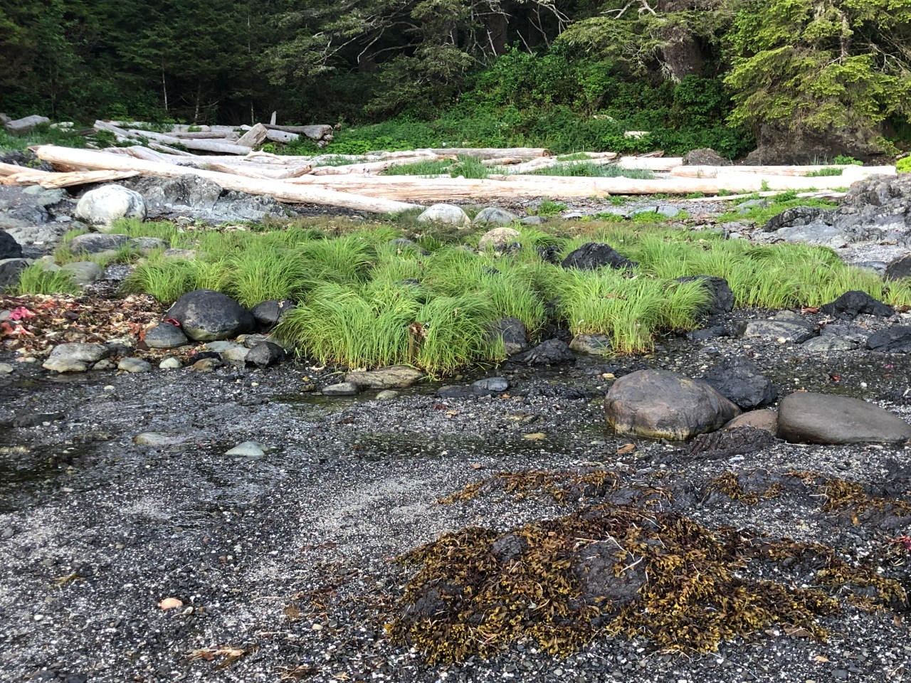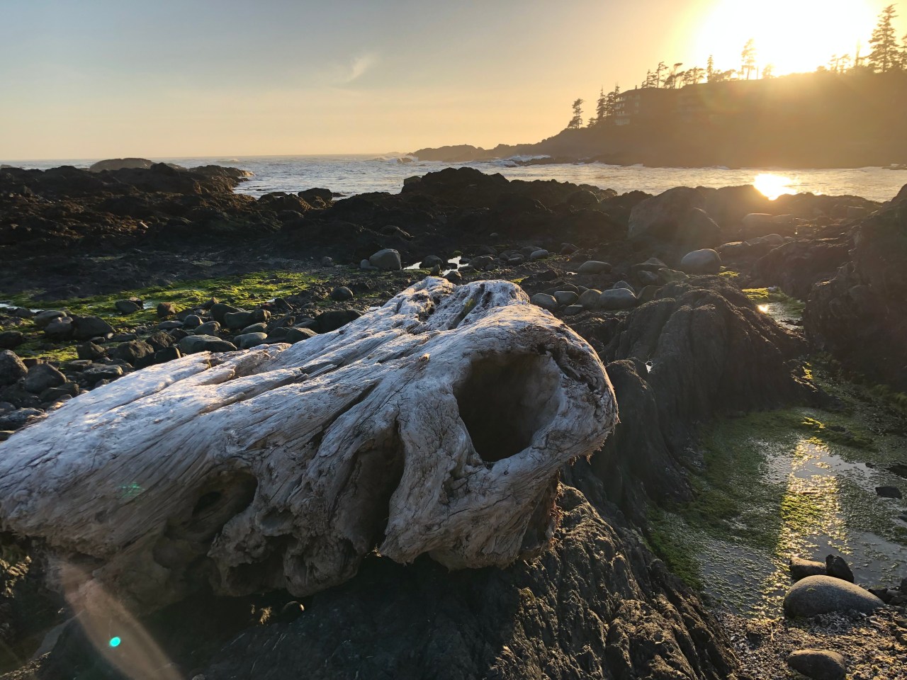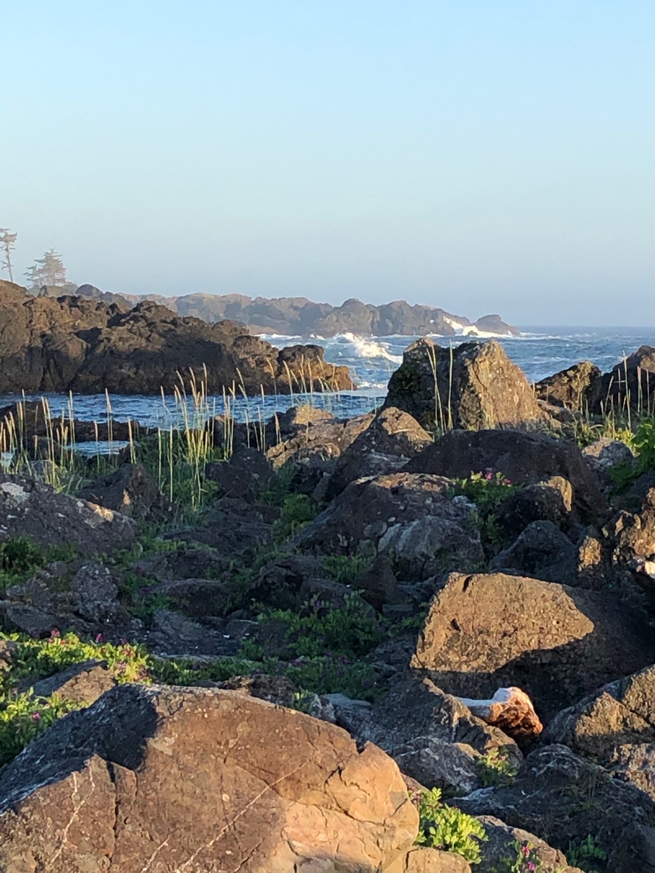 Continuant le chemin on traversait des rigoles, évitant de mettre les pieds dedans et on apercevait des langues de mer enfermées derrière les roches. Le ciel se reflétait dedans et à proximité, des pins tendaient leurs branches vers le ciel comme pour s’y encrer. La mer par endroit s’était laissée enfermée et nous offrait au regard, un petit lac paisible, alors que de l’autre côté des rochers, la mer rugissait et se fracassait, entrainant l’érosion de la nature. On faisait aussi des rencontres incroyables comme ce morceau de bois tout gris, rongé par les vagues et l’écume qui trônait comme une tête d’animal abandonné en cet endroit. Les arbres avaient leurs troncs tout tordus, faisant des circonflexes à l’envers, comme un pommeau arrondi d’une canne. Impressionnant de voir ce tronc tout incurvé ! Et puis au gré de la balade, de hauts roseaux faisaient surface et se dandinaient, tanguaient entre les rochers. On aurait pu se croire en Bretagne sur la côte nord. Mais non, nous étions bien sur l’île de Vancouver, sur la côte pacifique. Les arbres avaient aussi leurs racines tordues accrochées aux rochers et se miraient au coucher du soleil dans ses rayons dardant la côte. Par endroit, des troncs d’arbres faisaient surface, recrachés par la mer. Ils tapissaient un recoin vert, entre des sapins, bouchant un estuaire de la plage. Et puis tout à coup on se trouvait nez à nez avec un wapiti dégustant ses herbes favorites, salées, le moins du monde effrayé par votre présence, continuant à croquer ses fleurs délicieuses. Tranquillement le wapiti suivait son chemin ignorant votre passage.